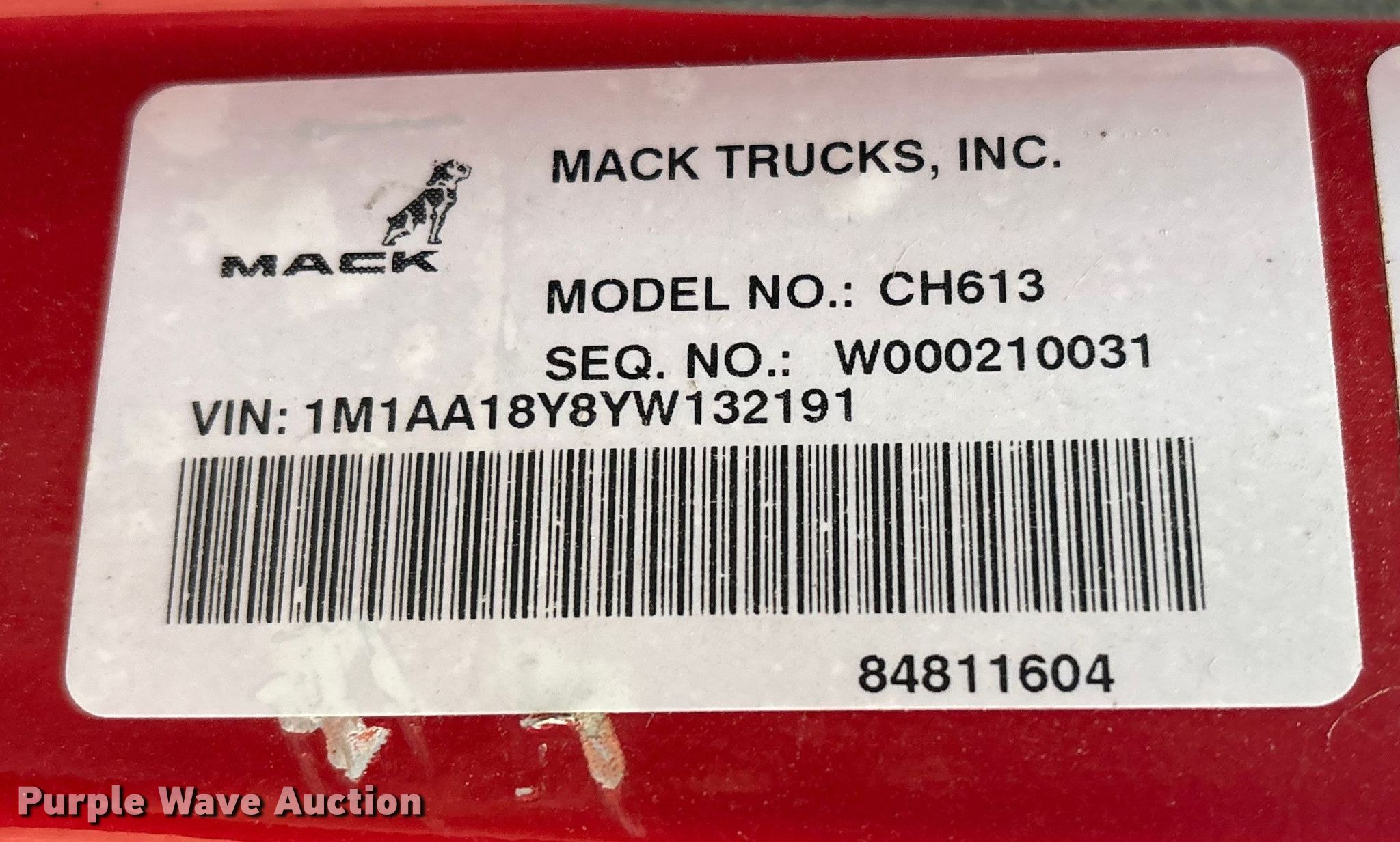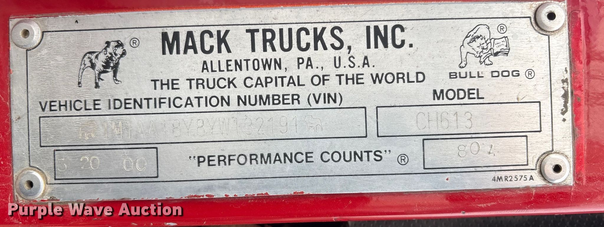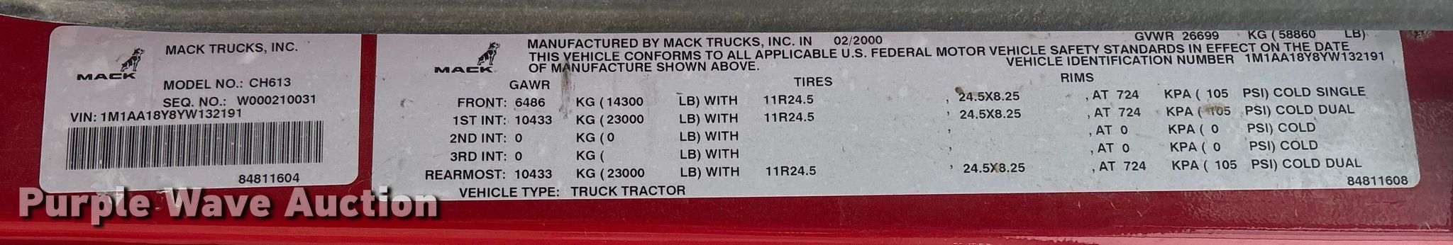 Purple Wave is selling a used Truck Tractor in Nebraska. This item is a 2000 Mack CH600 semi truck with the following: Miles: 184,599 on odometer, Hours: 14,312 on meter, VIN: 1M1AA18Y8YW132191