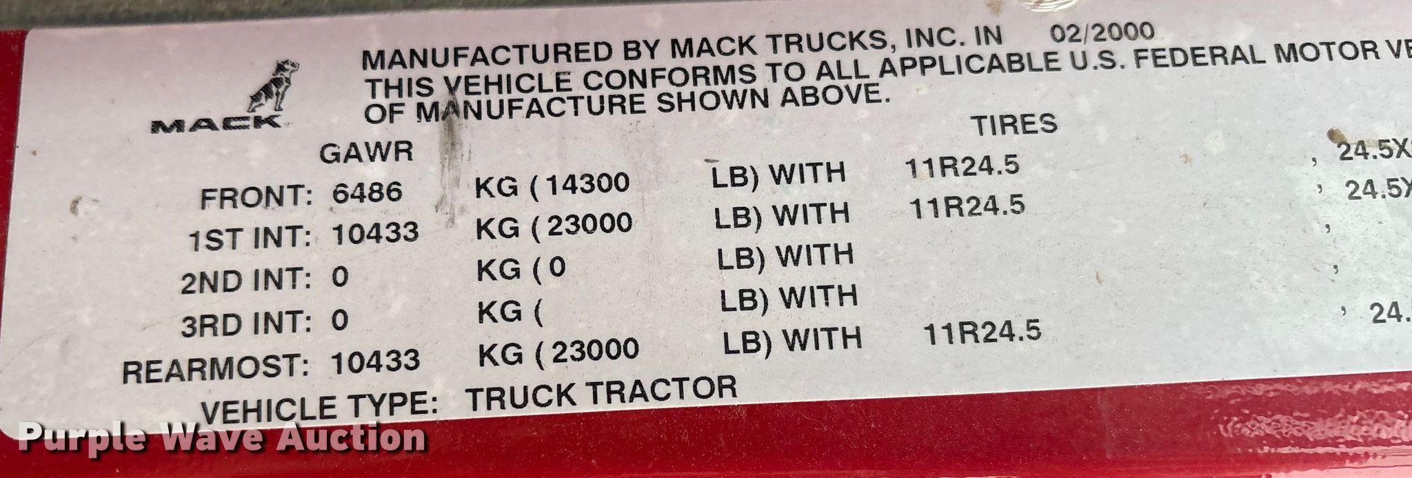 Take a look at this used 2000 Mack CH600 semi truck being sold on January 29th, 2026 in the Thursday January 29 Construction Equipment Auction made by Mack. Take a look at all of the item information below or take a look at similar auctions for Trucks.