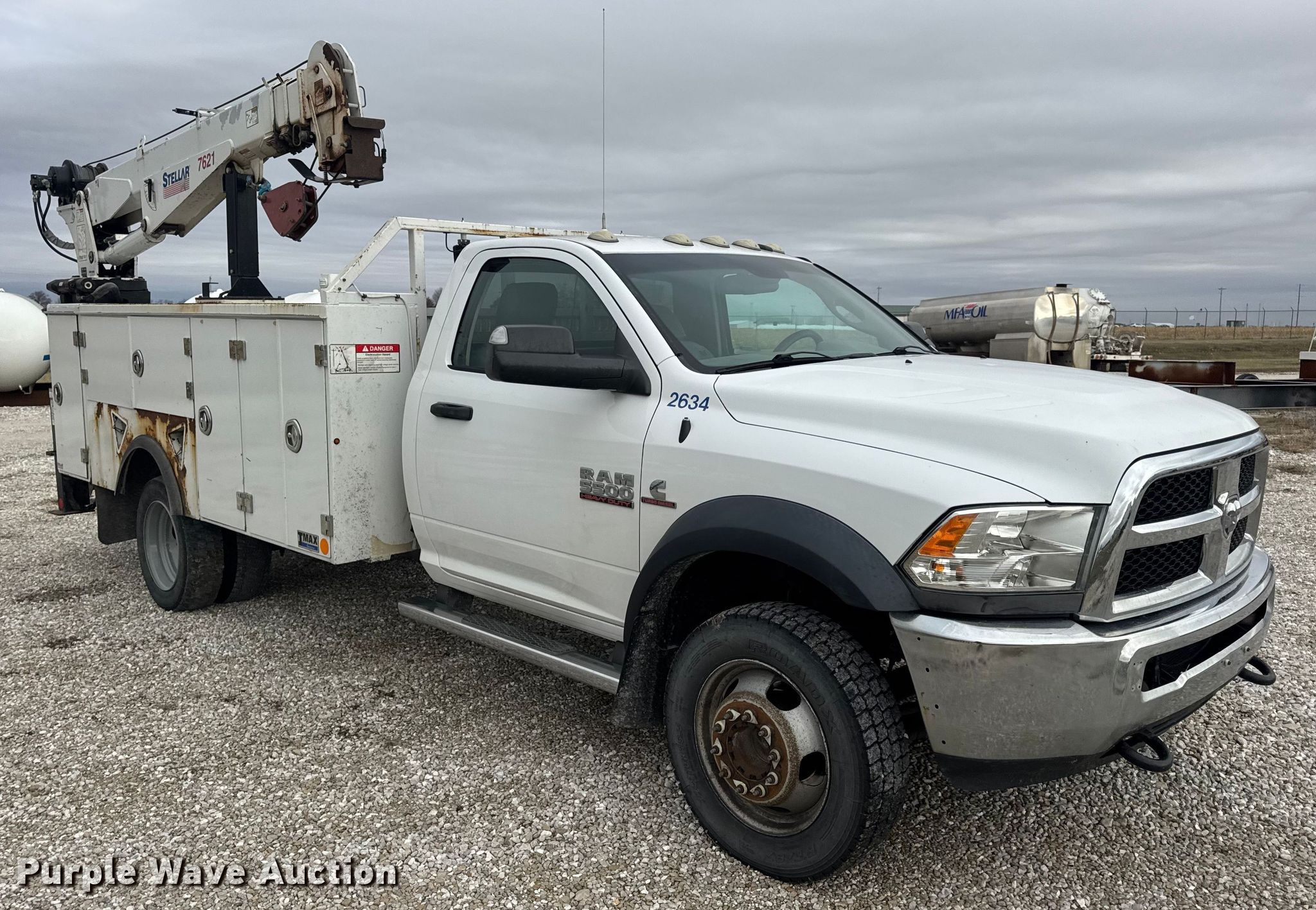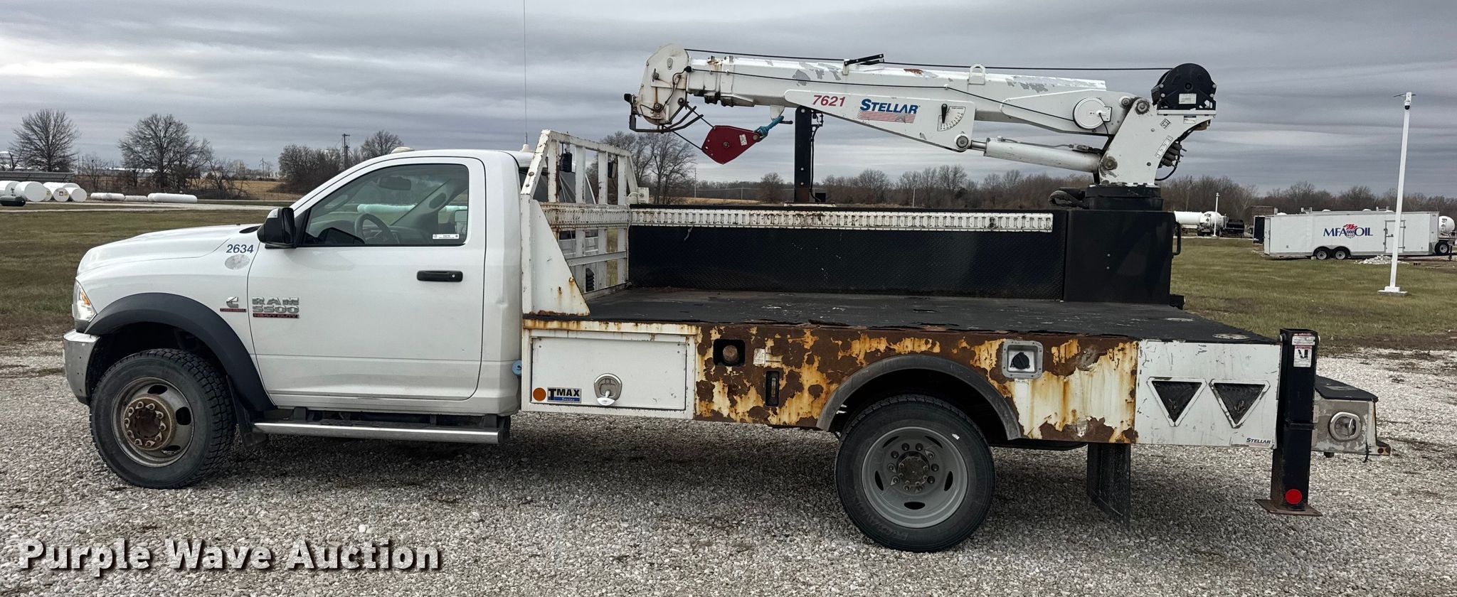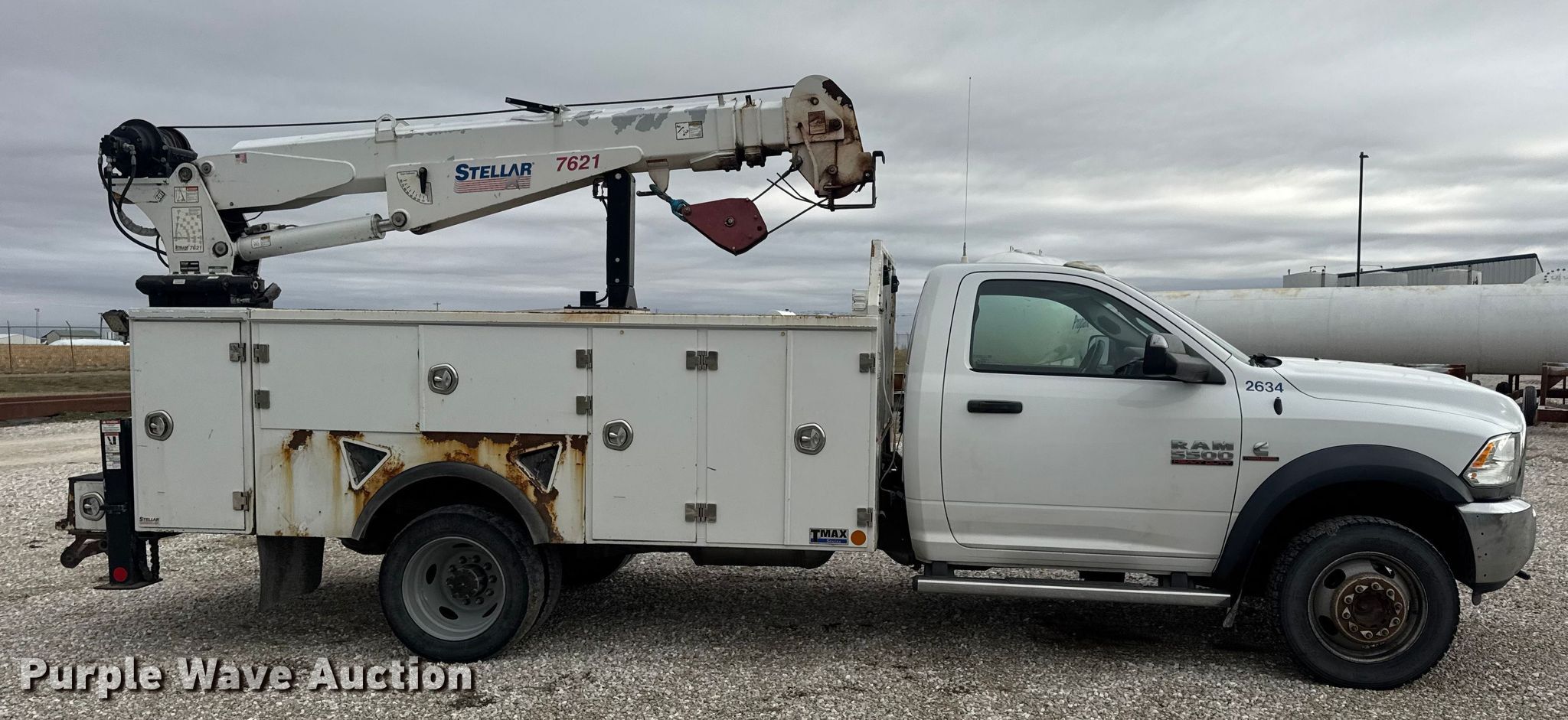 2015 RAM 5500 utility / service truck. Miles: 291,685 on odometer, VIN: 3C7WRNBL1FG553896. Engine Displacement: 6.7L, Cylinders: 6, Fuel type: Diesel. Transmission Automatic. Chassis Four wheel drive, Axles: Single, Suspension: Spring, Brakes: Hydraulic, PTO, GVWR: 19,500 lbs. Interior AC, Heat, Heated mirrors, Power windows, Power locks, Cruise control, Auxiliary controls, Brake controller. Features Bed Stellar TMAX1-LP, Serial: 39992, Length: 12' 1", Width: 96", Crane Stellar 7621, Maximum boom length: 21' Maximum lift capacity: 7,500 lbs.. Tires Size: 225/70R19.5. Notes Dash warning indicator: Check engine, Electronic throttle control warning, DEF warning. Missouri title. Title distribution may be delayed up to 30 days from verification of funds. MFA Oil. Moberly, MO 65270