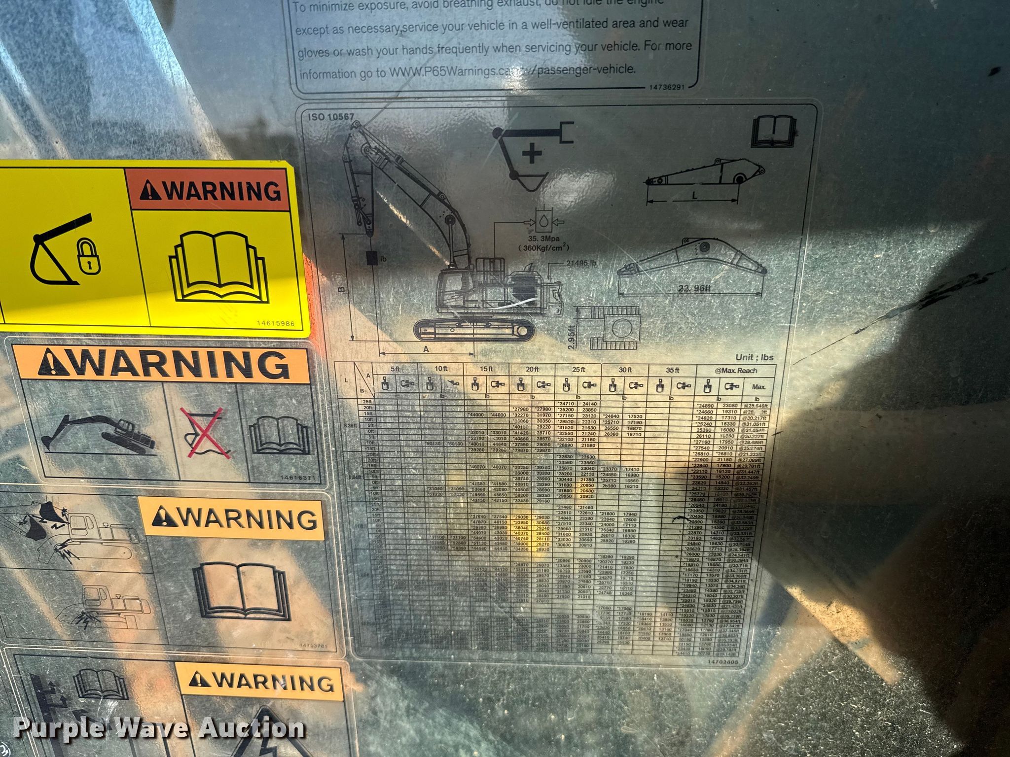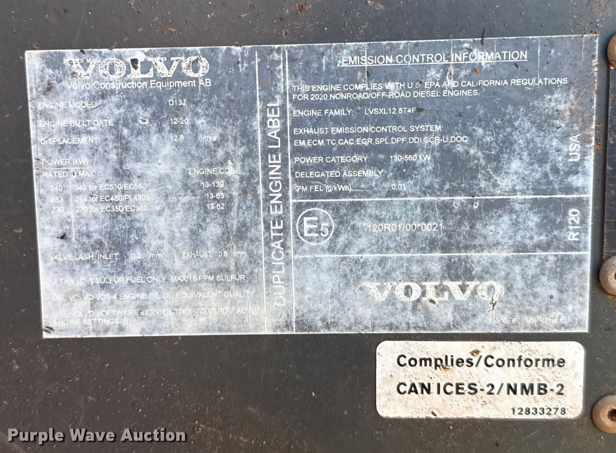 2021 Volvo EC480EL excavator. Hours: 3,855 on meter, Serial: VCEC480EC00314568. Engine Volvo D13J, Displacement: 12.8L, Cylinders: 6, Fuel type: Diesel, kW: 284. Transmission Hydrostatic, Two speed travel. Operators station Enclosed cab, AC, Heat, Backup camera, Pattern changer. Features Auxiliary hydraulics Two-way, Counter weights, Removable, Boom Standard, Stick Stick length: 13' 6", Quick coupler: Hydraulic Volvo, Bucket Strickland, Width: 72", Teeth: 7. Tracks Width: 35.5", Steel, Grouser pads: Triple. Notes Warning indicator: Auto lubrication failure, Glass cracked. View repairs. SWH Construction. Norman, OK 73072
