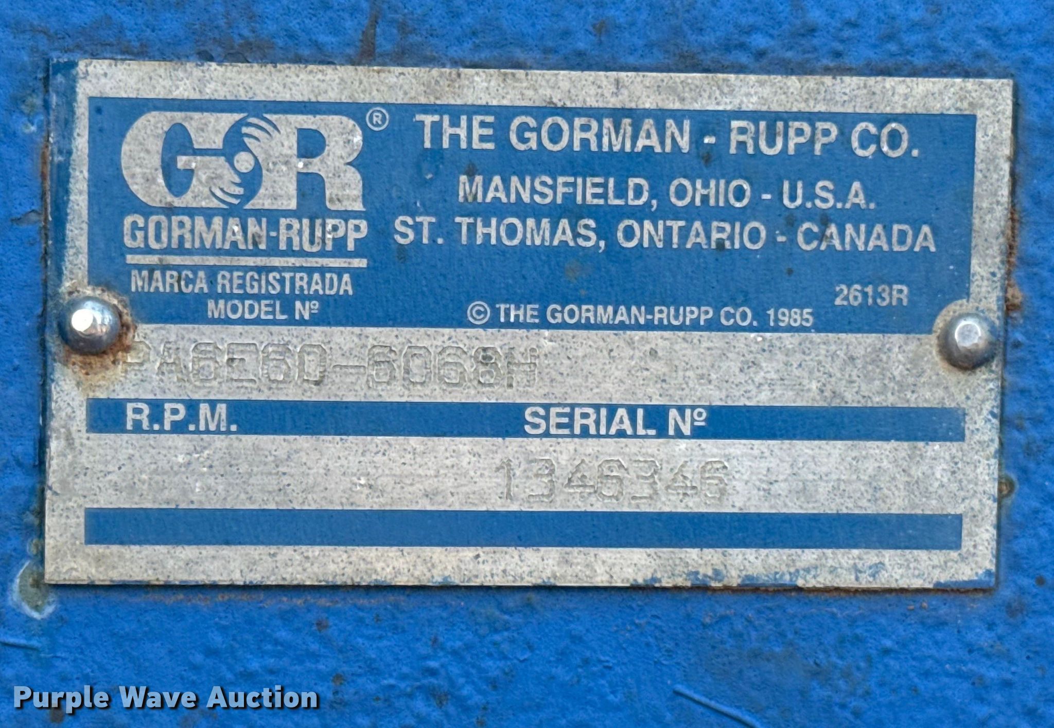Purple Wave is selling a used Pump in Oklahoma. This item is a Gorman Rupp PA6E60-6068HE pump with the following: Serial: 1346346