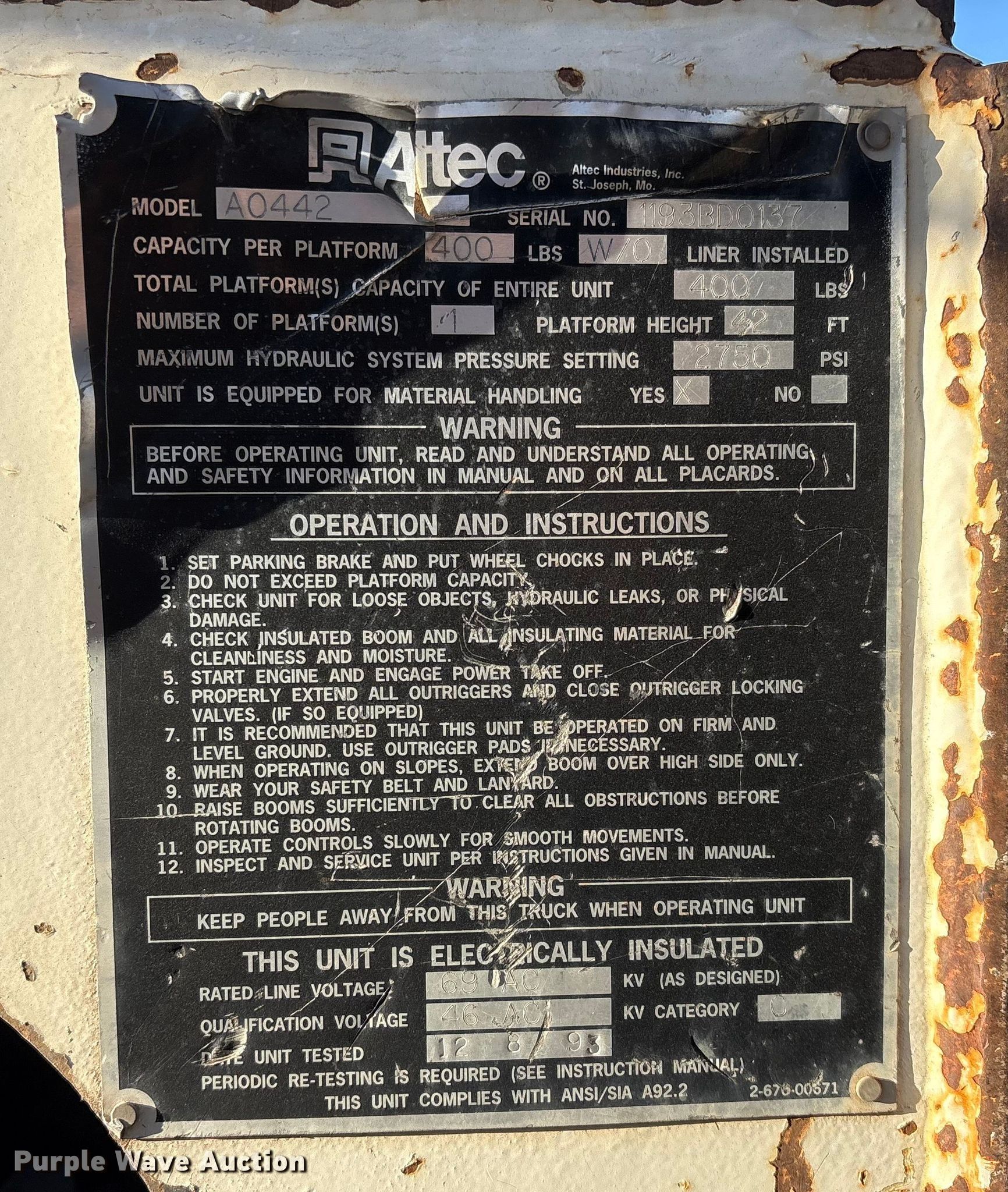1994 Ford F700 bucket truck. Miles: 190,732 on odometer, Hours: 8,660 on meter, VIN: 1FDPK74C8RVA21874. Engine Cummins B5.9-190, Serial: 44920604, Displacement: 5.9L, Cylinders: 6, Fuel type: Diesel. Transmission Manual, Speed: 5, plus 2. Chassis Axles: Single, Suspension: Spring, Brakes: Hydraulic, PTO, GVWR: 29,000 lbs. Interior AC, Heat, Auxiliary controls. Features Bed Altec, Serial: 37-64090, Length: 13' 6", Width: 93", Boom Altec A0442, Serial: 1193BD0137, Maximum lift capacity: 400 lbs, Maximum lift height: 42', Boom type: Articulating, Insulated, Man basket, Boom controls Ground, Platform/ basket, Material handler. Tires Size: 11R22.5. Notes Unknown operating condition of AC. Kansas title. Title distribution may be delayed up to 14 days from verification of funds. Southwestern Electrical. Wichita, KS 67214