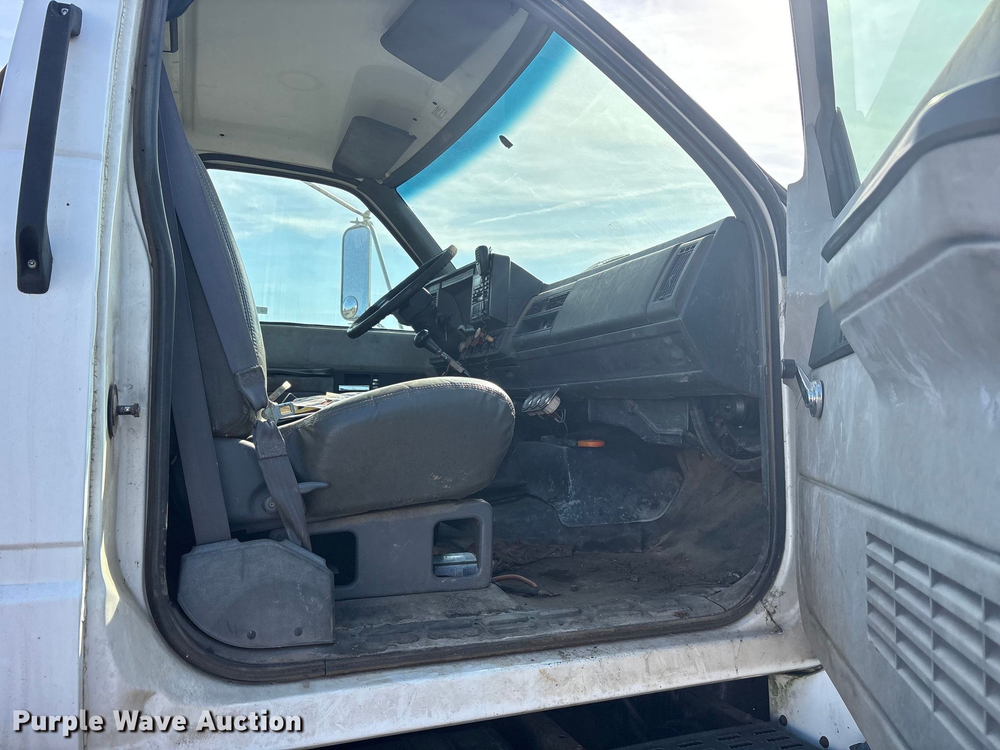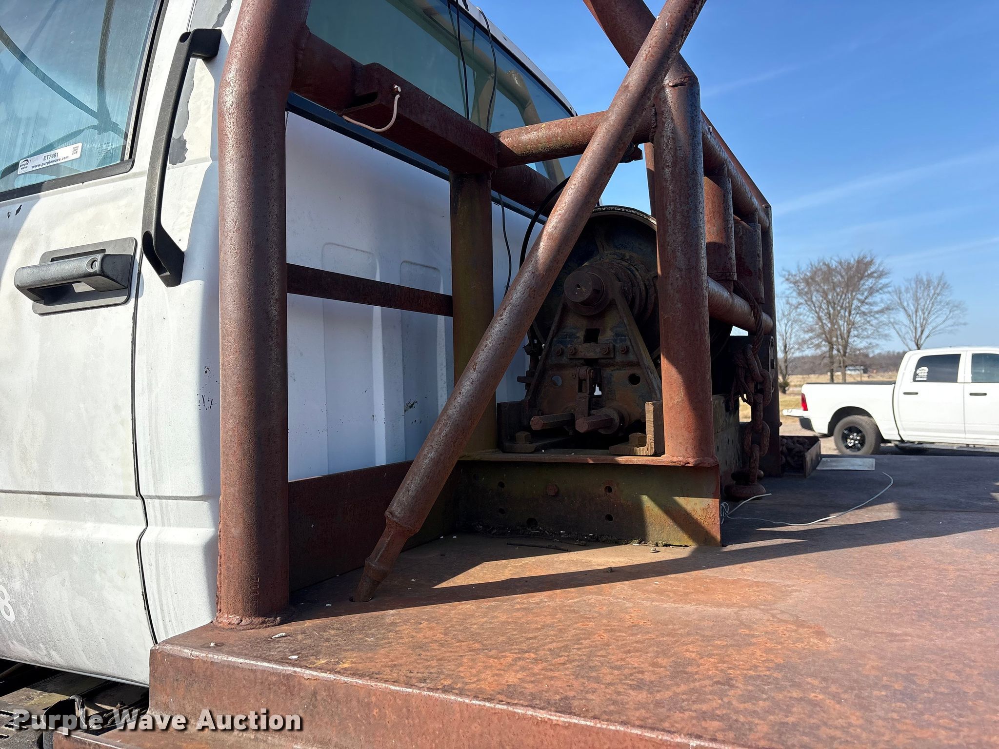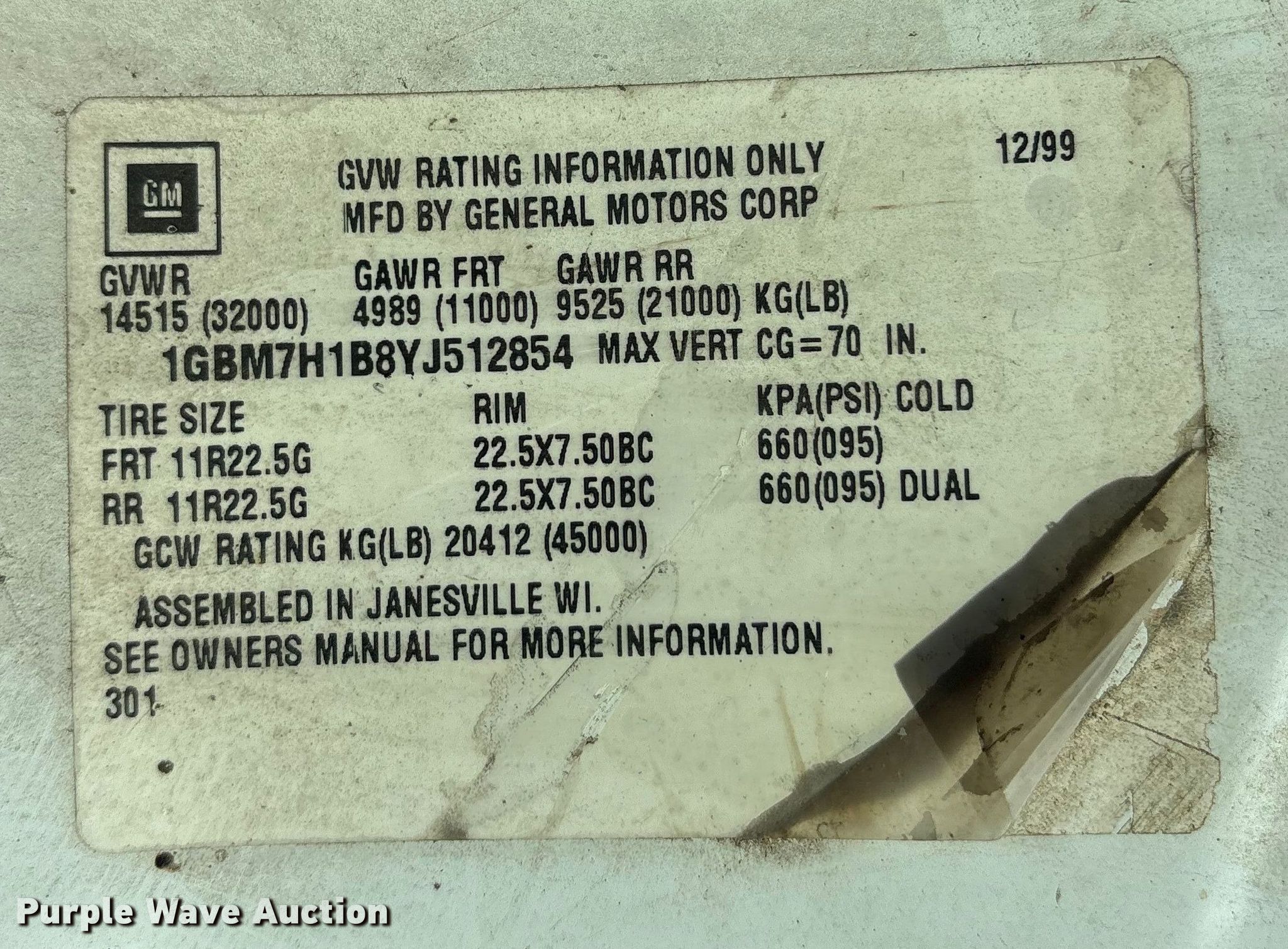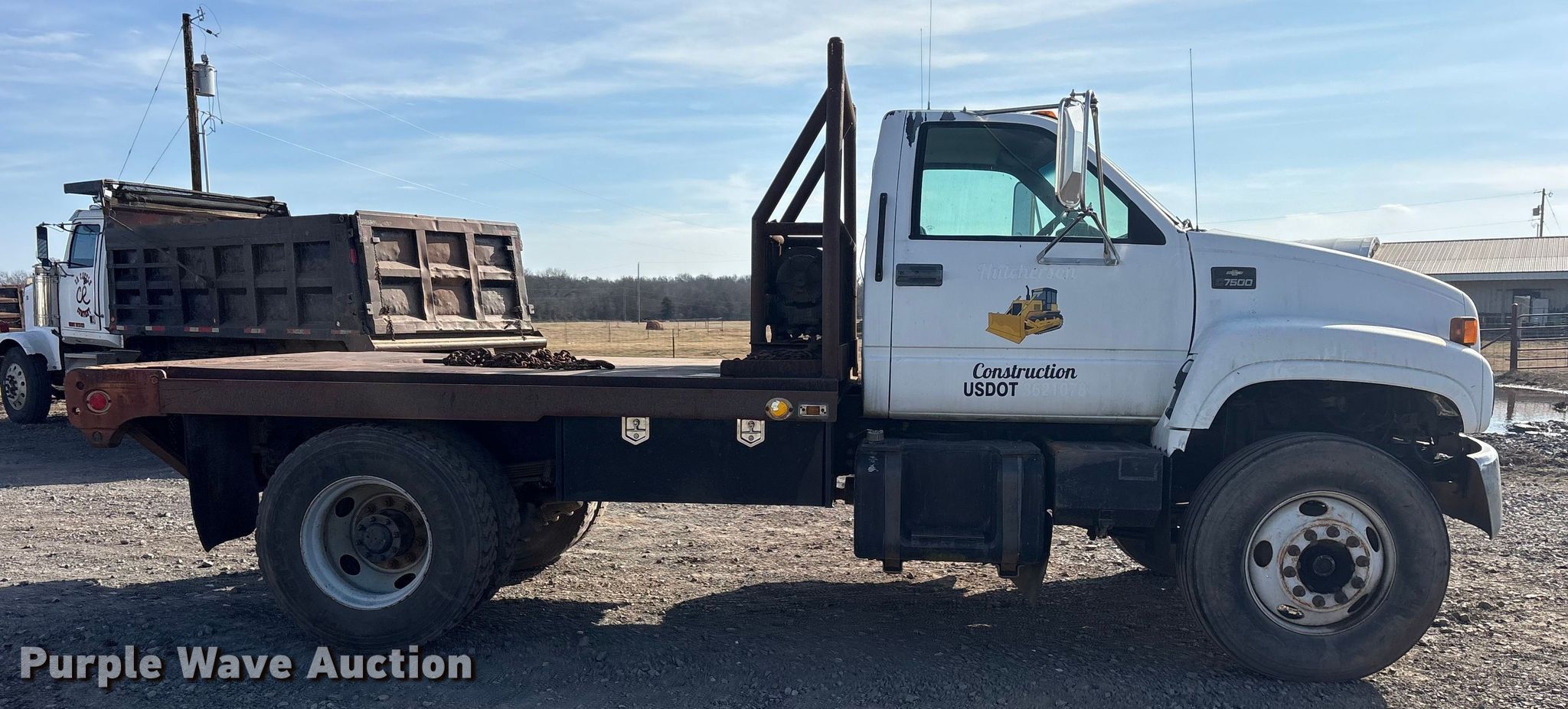 2000 Chevrolet C7500 winch truck. Miles: 165,823 on odometer, VIN: 1GBM7H1B8YJ512854. Engine GM, Displacement: 7.4L, Cylinders: 8, Fuel type: Gas. Transmission Manual, Speed: 5, plus 2. Chassis Axles: Single, Suspension: Spring, Brakes: Air, PTO, GVWR: 32,000 lbs. Interior AC, Heat. Features Bed Flatbed, Rollback bed, Leland, Length: 11', Width: 8', Winch, Rolling tailboard, Gooseneck. Tires Size: 11R22.5. Notes Dash warning indicator: Check engine, Low air, Possible AC issues, may need charged, AC blower issues, blows on feet only. Oklahoma title. Title distribution may be delayed up to 14 days from verification of funds. Hutcherson Construction Inc. Bokoshe, OK 74930