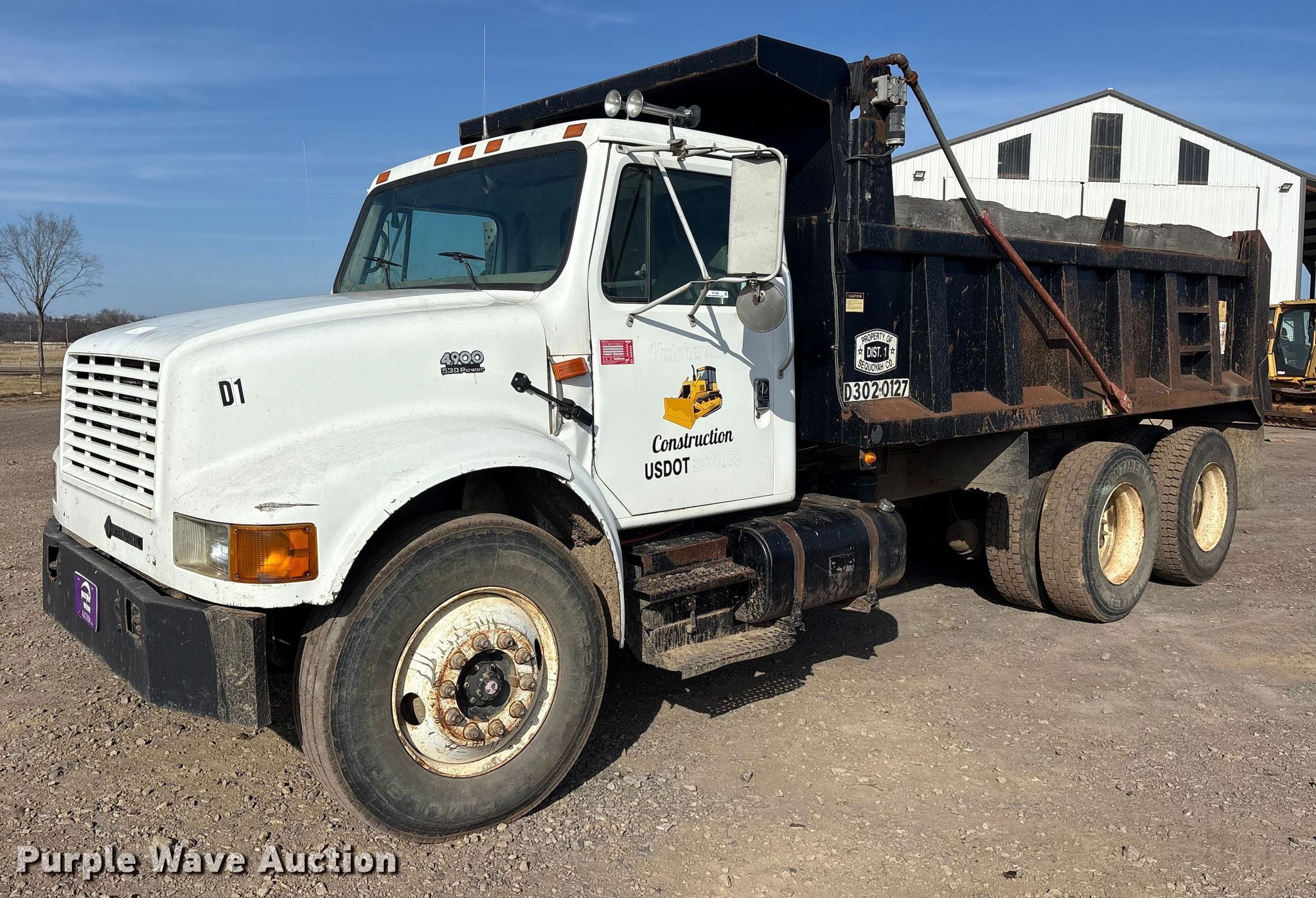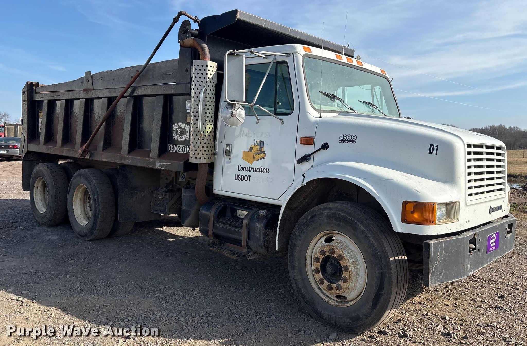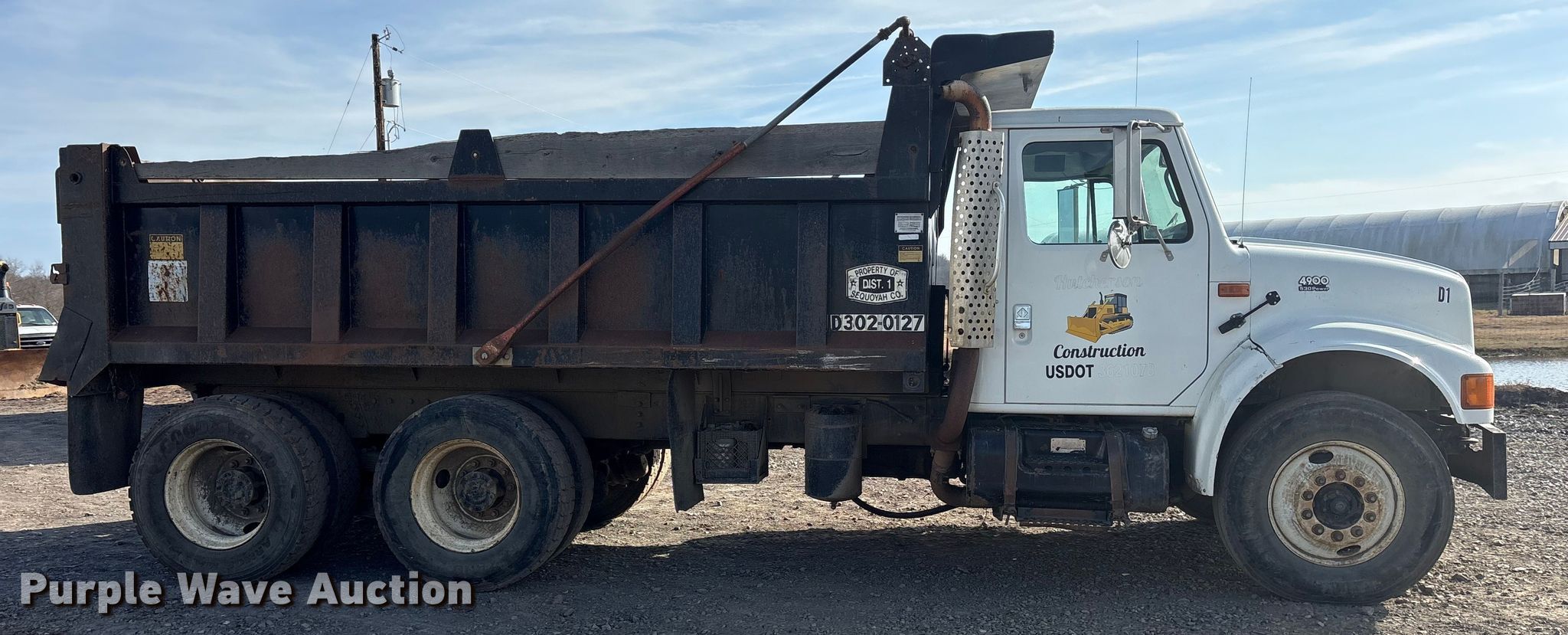 2000 International 4900 Dump truck. Miles: 321,155 on odometer, VIN: 1HTSHADR1YH244868. Engine International DT530, Cylinders: 6, Fuel type: Diesel. Transmission Eaton Fuller, Manual, Speed: 8, plus 2. Chassis Axles: Tandem, Differential lock: Full, Suspension: Spring over walking beam Dump valves, Brakes: Air, PTO, GVWR: 52,000 lbs FAWR: 12,000 lbs, IAWR: 20,000 lbs, RAWR: 20,000 lbs, Wheelbase: 194". Interior Heat, Cruise control. Features Bed Dump bed, Length: 15', Width: 8', Side height: 37", Side board height: 10", Roll tarp, End gate: Air operated. Tires Size: 11R22.5. Notes Windshield chipped or cracked. Oklahoma title. Title distribution may be delayed up to 30 days from verification of funds. Hutcherson Construction Inc. Bokoshe, OK 74930