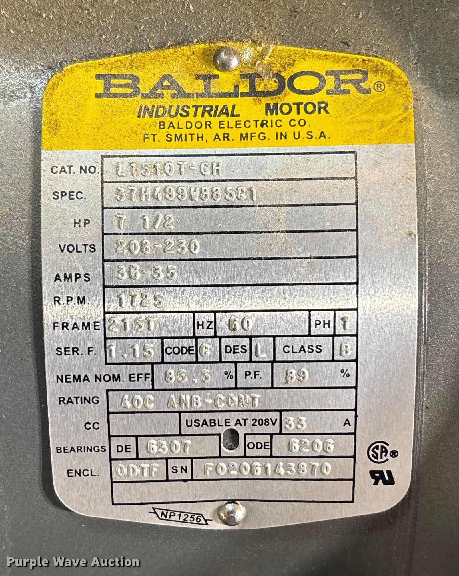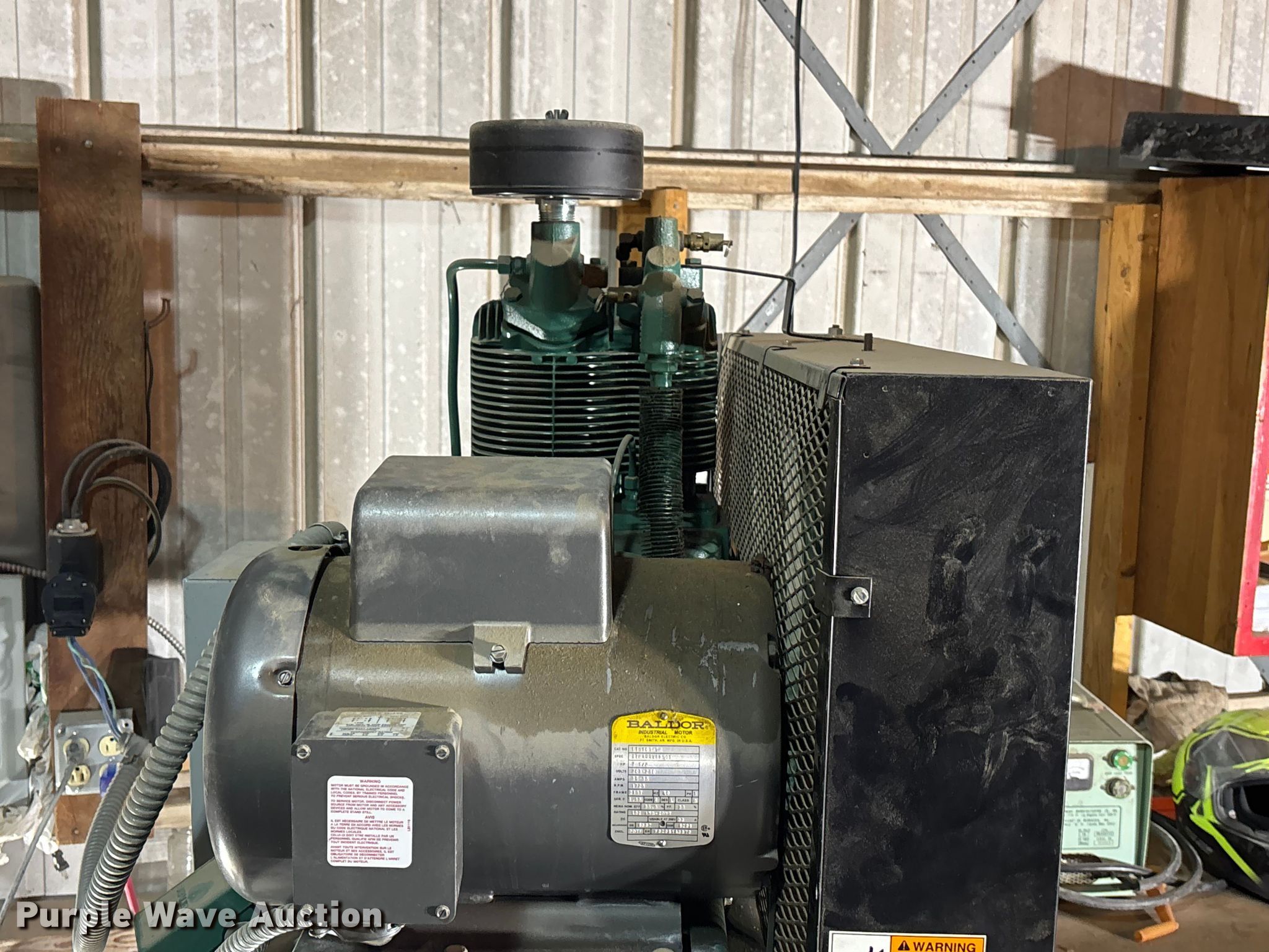 2002 Champion VR 7F Air compressor. Serial: R0011815. Electric Motor Baldor L1510T –CH, HP: 7, Volts: 208-230, Phase: Single. Features Air compressor Pump model: VR7F–8230–1–OM–ST–AC–TD, CFM: 22, PSI: 175. Pontine Enterprises. Hastings, NE 68901