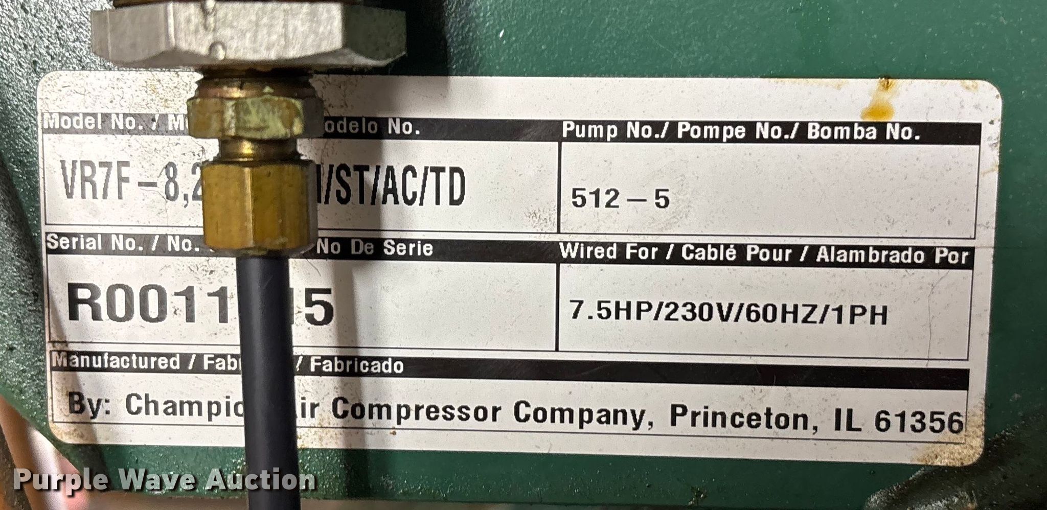 Purple Wave is selling a used Air Compressor in Nebraska. This item is a 2002 Champion VR 7F Air compressor with the following: Serial: R0011815