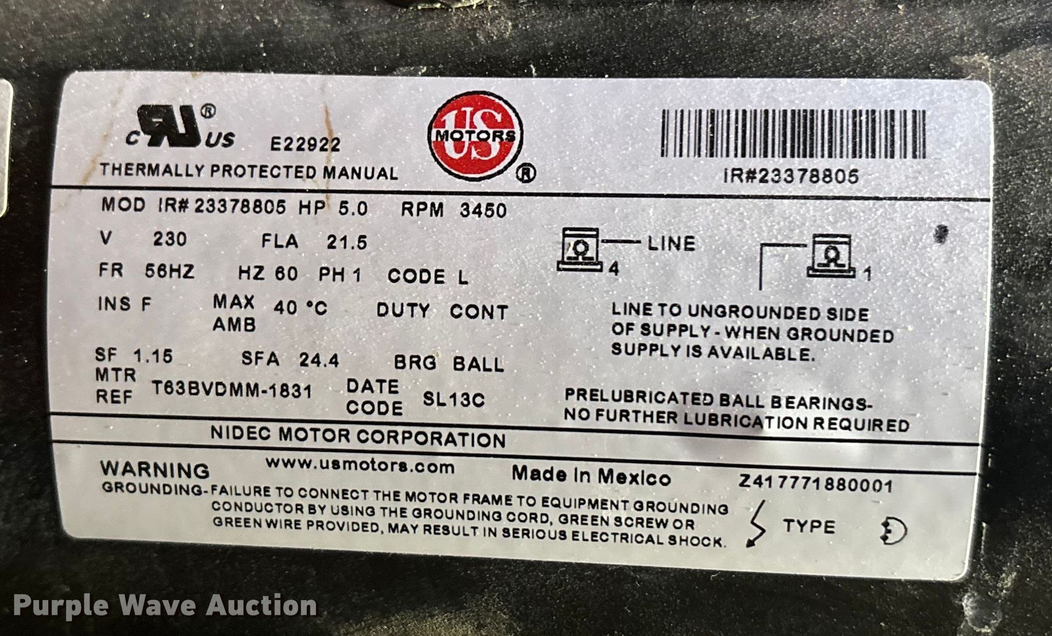 2013 Ingersoll rand TSN4N5 air compressor. Serial: CBV279209. Electric Motor US motors 23378805, HP: 5, Volts: 230, Phase: Single. Features Air compressor Ingersoll rand TS5, CFM: 16, PSI: 90. Pontine Enterprises. Hastings, NE 68901