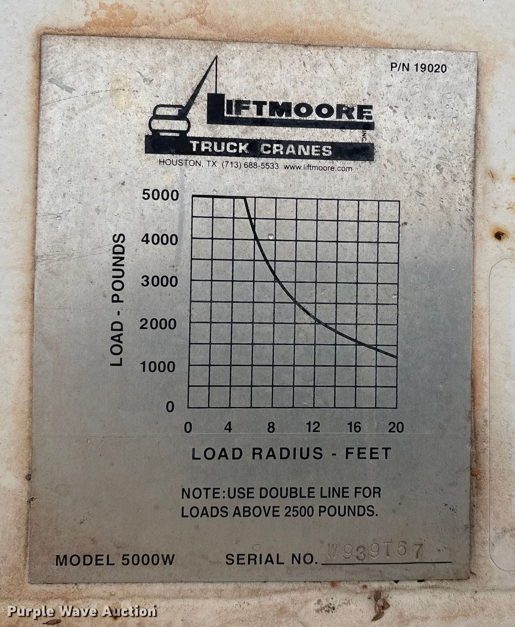 (3) Liftmoore cranes. Liftmoore 5000W Serial: W939T67, Liftmoore 2550, Liftmoore 3200REE. Notes Unknown operating condition. Jordan Truck and Equipment. Waterloo, NE 68069