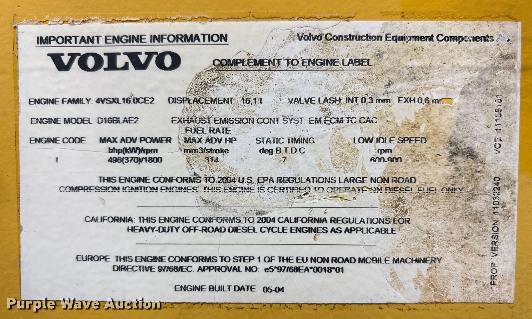 2005 Volvo L330E wheel loader. Hours: 4,143 on meter Actual hours unknown, Serial: L330EV62194. Engine Volvo D16BLAE2, Displacement: 16.1L, Cylinders: 6, Fuel type: Diesel. Transmission Powershift, 4F - 4R. Operators station Enclosed cab, AC, Heat, Bucket controls: Two-lever, Ride control. Features Counter weights, Bucket Width: 151", Teeth: 8. Tires Size: 35/65-33. Notes Hour meter replaced. Fenstermacher Asphalt & Paving. Big Rapids, MI 49307