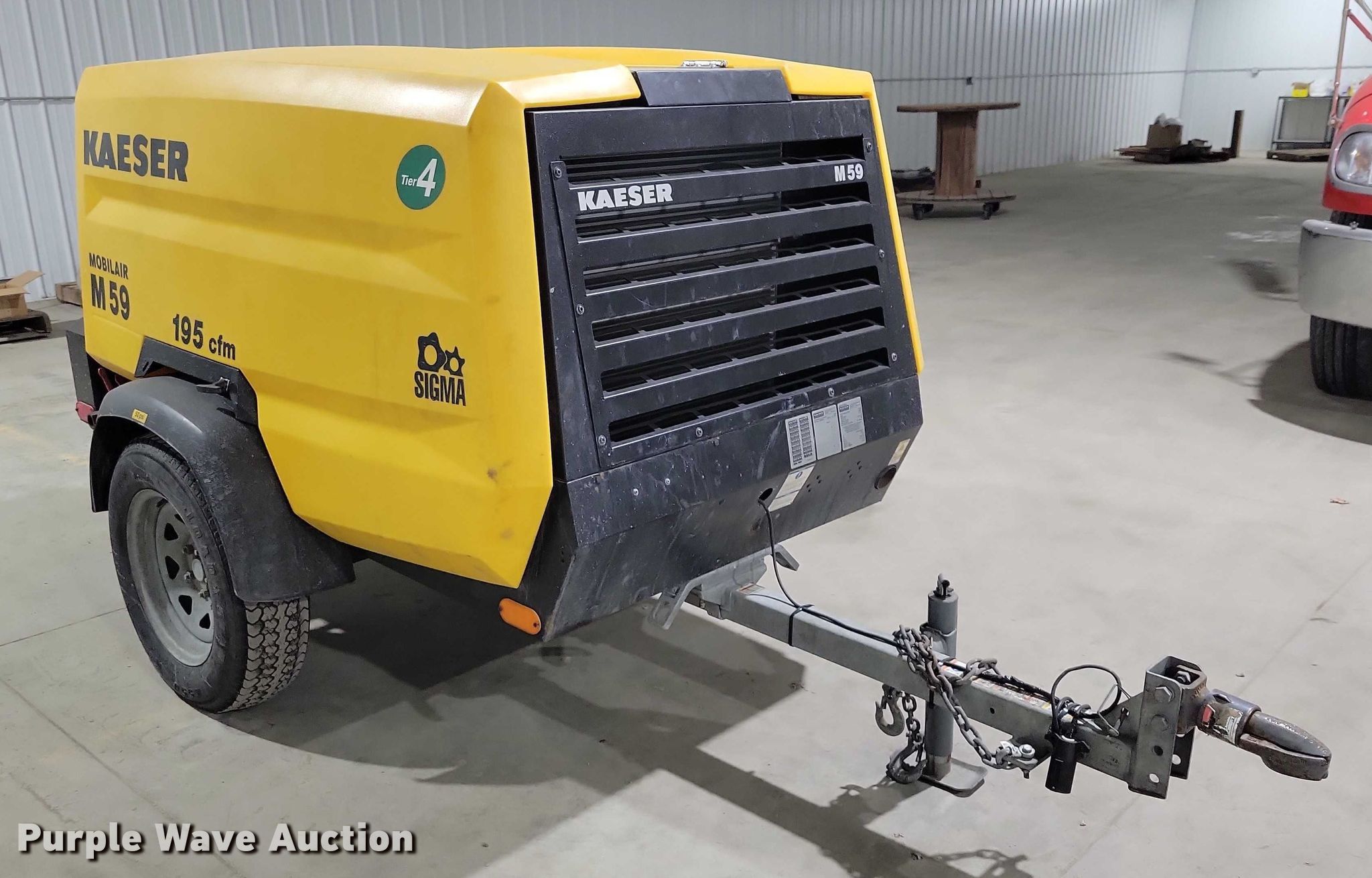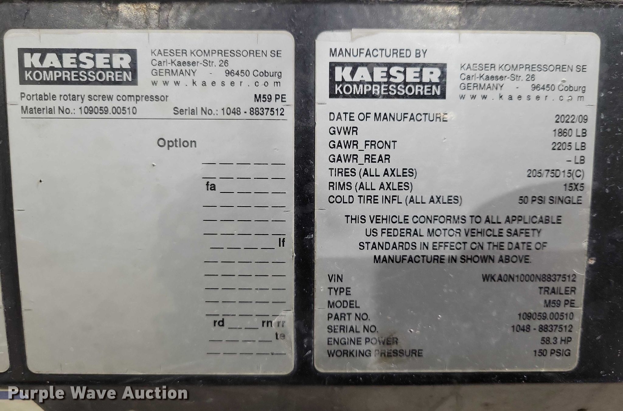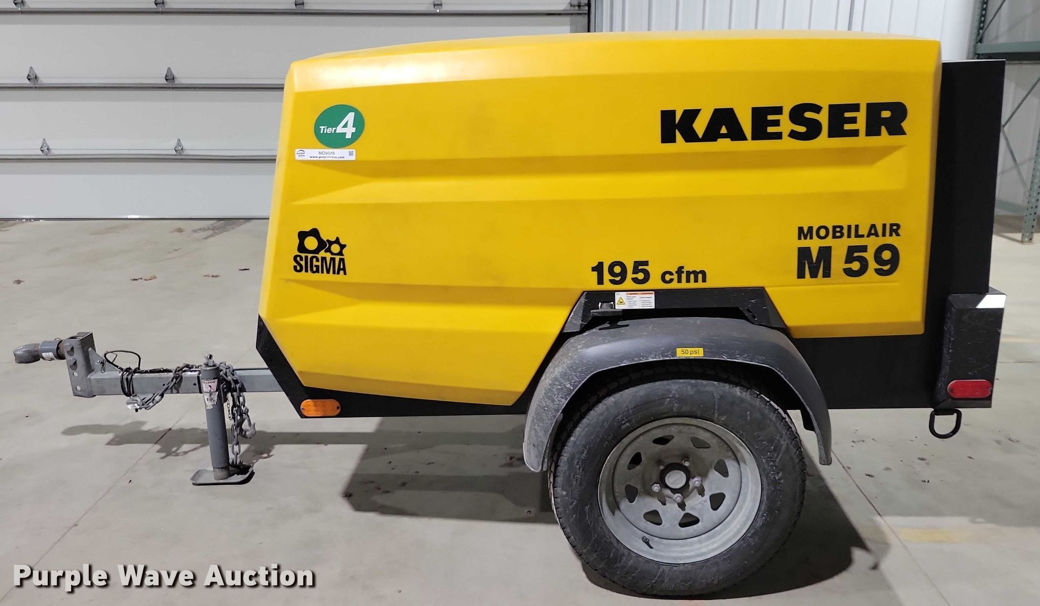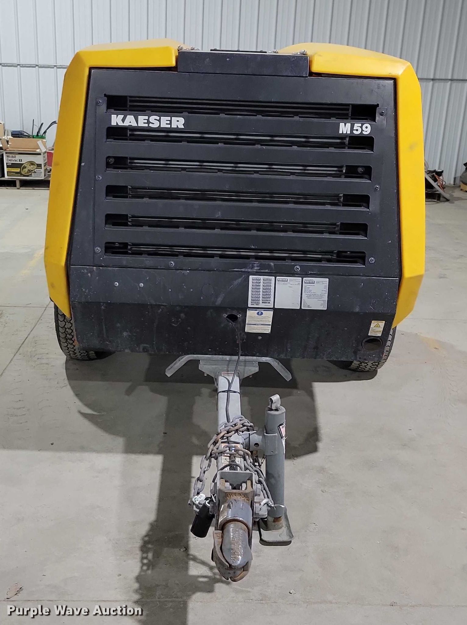 2022 Kaeser M59 air compressor. Hours: 449 on meter, Serial: 100800. Engine Hatz 3H50TIC, Displacement: 1.464L, Cylinders: 3, Fuel type: Diesel, kW: 43.7. Features Air compressor Kaeser, CFM: 195, PSI: 232. Trailer Ball hitch size: 2", Suspension: Torsion, Axles: Single, Tire size: ST205/75D15, GVWR: 1,860 lbs, GAWR: 2,205 lbs. This is worksite support equipment and will not come with a title. Transfer of ownership documentation will be a bill of sale. AccuJet Liquidation. Perry, IA 50220