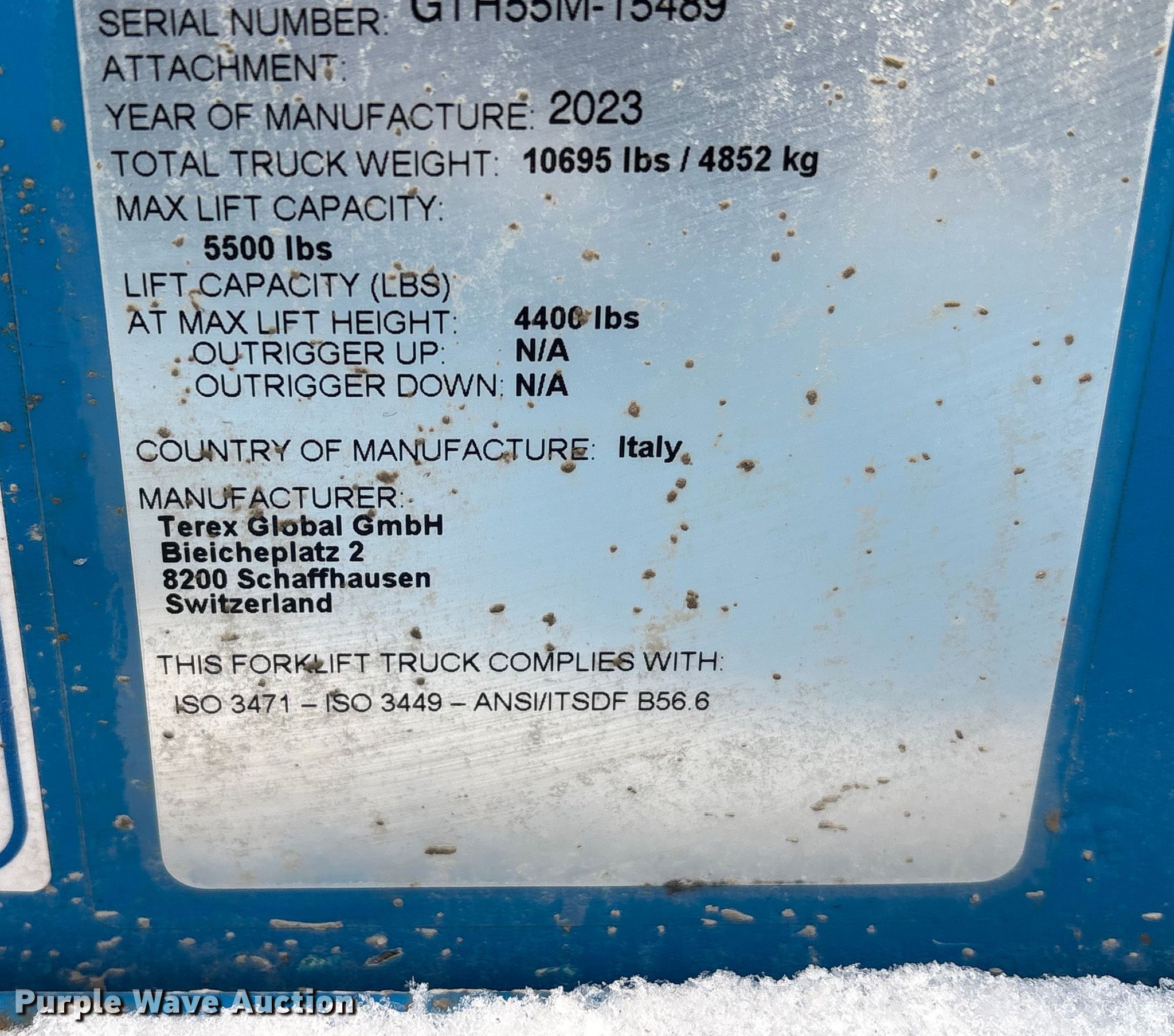 2023 Genie GTH-5519 telehandler. Hours: Unknown, Serial: GTH55M-15489, Unit #: 96878245. Engine Deutz TD2.9L4, Serial: 12991318, Displacement: 2.9L, Cylinders: 4, Fuel type: Diesel. Transmission Powershift, Four wheel drive. Operators station Enclosed cab, Heat, Steering: Crab, Four wheel. Features Maximum lift capacity: 5,500 lbs, Maximum lift height: 19', Boom stages: 2, Fork length: 47", Auxiliary hydraulics, Quick attach: Manual. Tires Size: 12-16.5. Notes Flat tire, off bead, Warning indicator: Master warning, Hydraulic oil level, Jump start required during on-site data collection, Non-operational dash cluster. Insurance recovery, stored at a secured facility. Please review REQUIRED REMOVAL INSTRUCTIONS. Insurance Recovery. Cicero, IN 46034