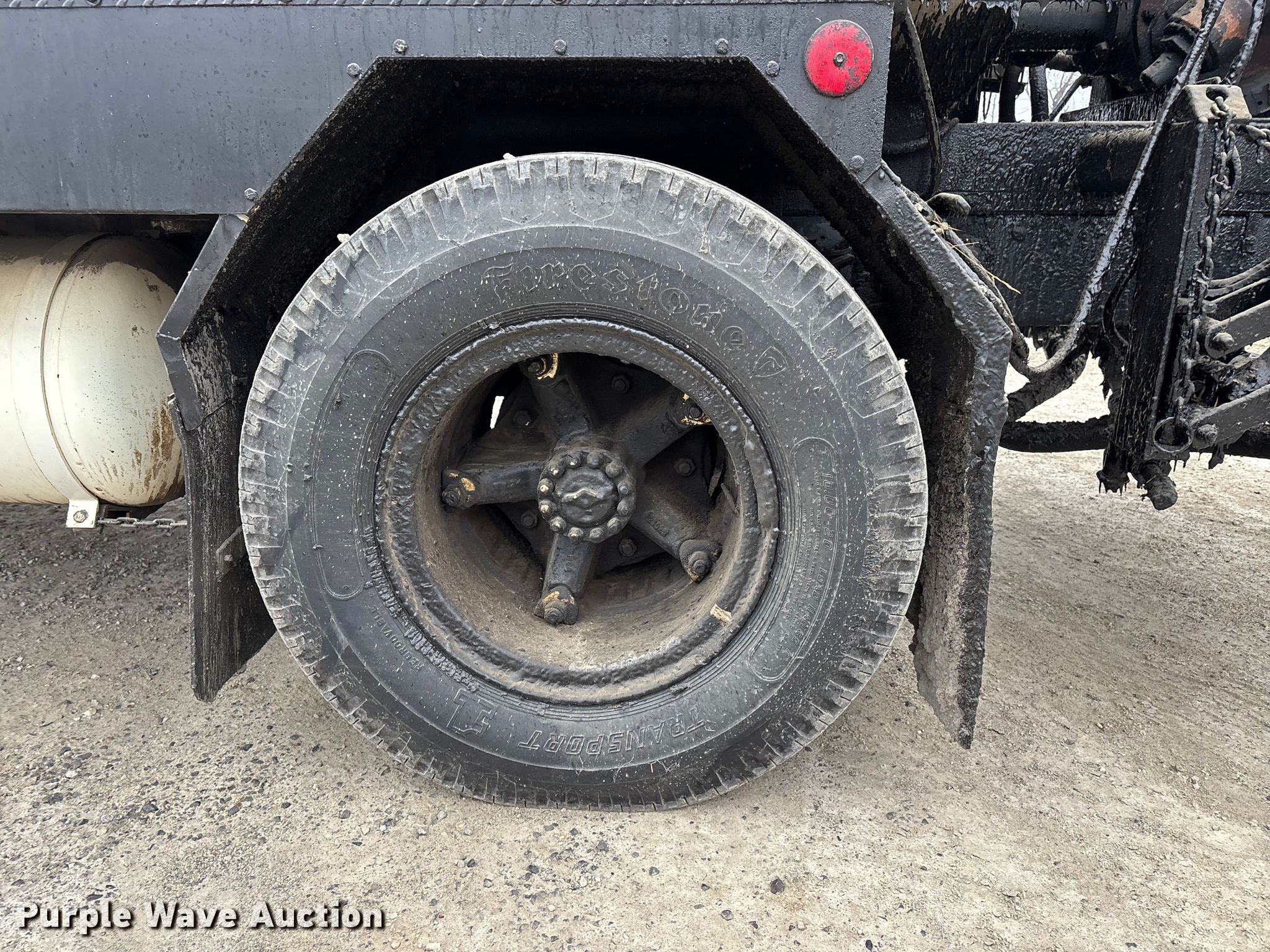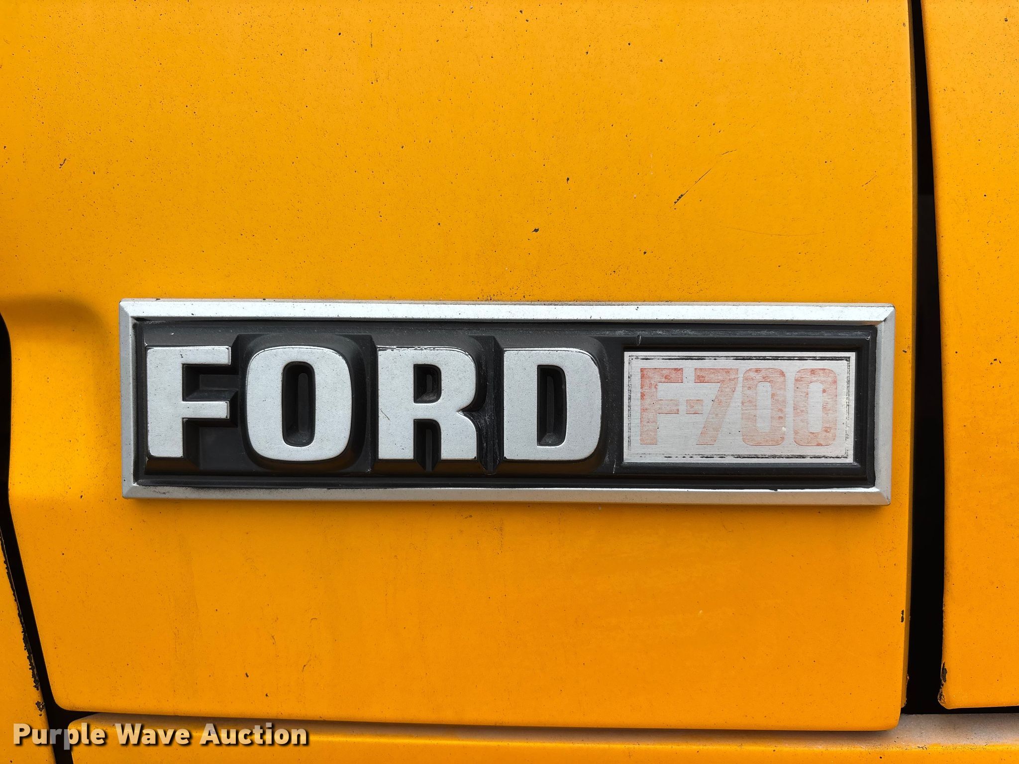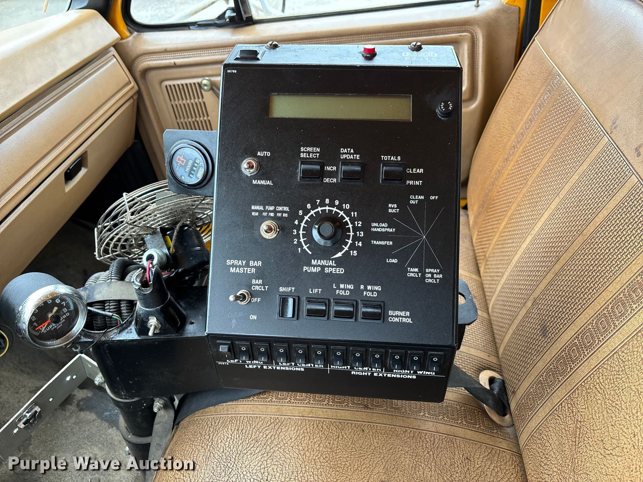 1983 Ford F700 oil distributor truck. Miles: 13,525 on odometer, Hours: 161 on meter. Engine Model: 370, Cylinders: 8, Fuel type: Gas. Transmission Manual, Speed: 4, plus 2. Chassis Axles: Single, Suspension: Spring, Brakes: Hydraulic, PTO, GVWR: 27,500 lbs. Interior Heat. Features Bed Tank bed, Rosco Maximizer, Length: 10' 4", Width: 7', Capacity: 1,500 gallons, In-cab controls, Spray wand, Spray boom Width: 12', Folding, Nozzles: 36.. Tires Size: 9.00-20. Missouri title. Title distribution may be delayed up to 14 days from verification of funds. Cape Special Road District. Cape Girardeau, MO 63701