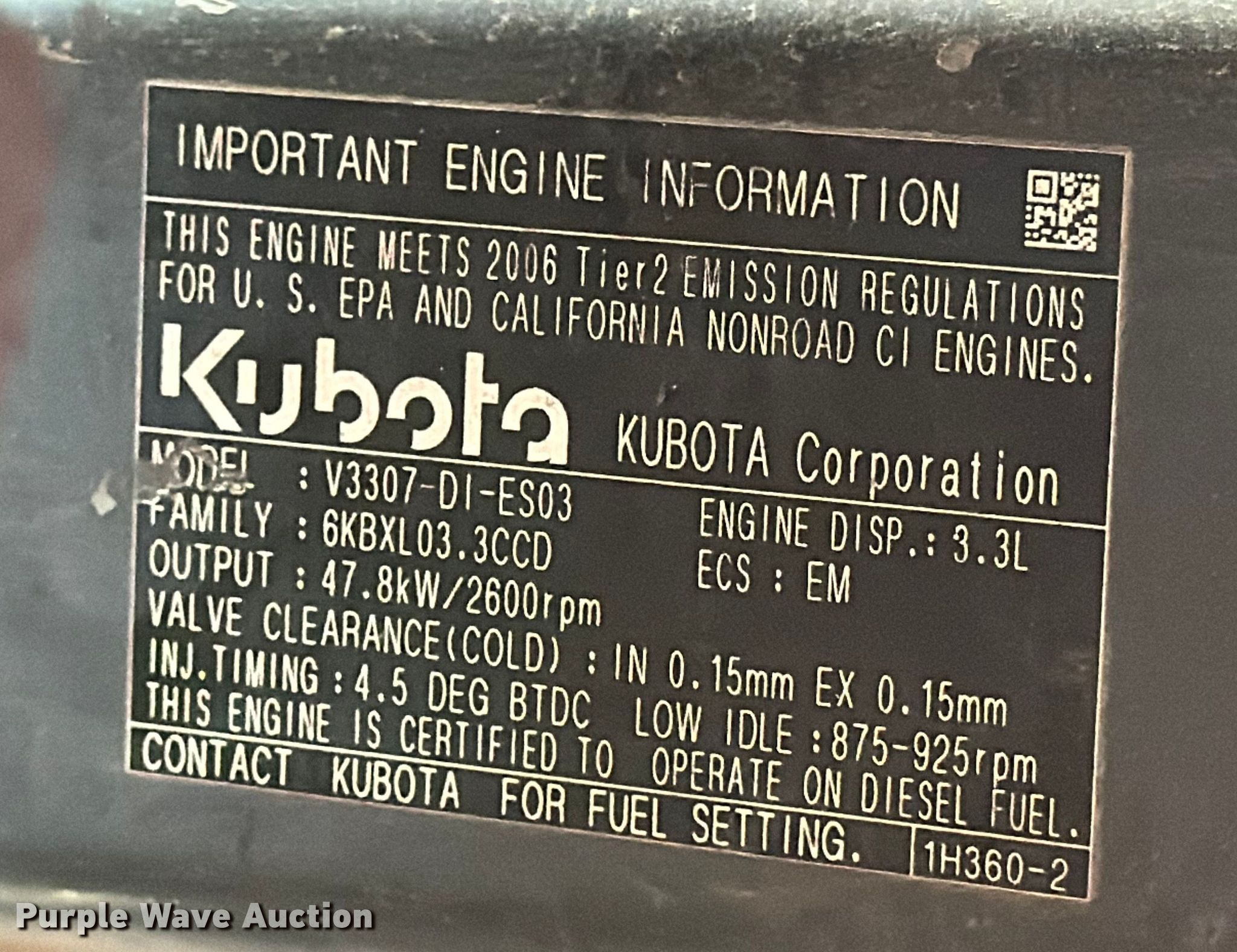 Kubota M6040F tractor. Hours: 3,505 on meter, Serial: 10122. Engine Kubota V3307-DI-ES03, Serial: 6C0999, Displacement: 3.3L, Cylinders: 4, Fuel type: Diesel, kW: 47.8. Transmission 8F - 8R, Left-hand reverser, Differential lock. Operators station AC, Heat. Features PTO: 540, Three point, Seven pin outlet, Hydraulic remote sets Front: 1, Rear: 1. Tires Front: 27x9, Rear: 21.5L-16.1. Notes Warning indicator: Low fuel, Possible three point issues. City of Lenexa, KS. Shawnee, KS 66216