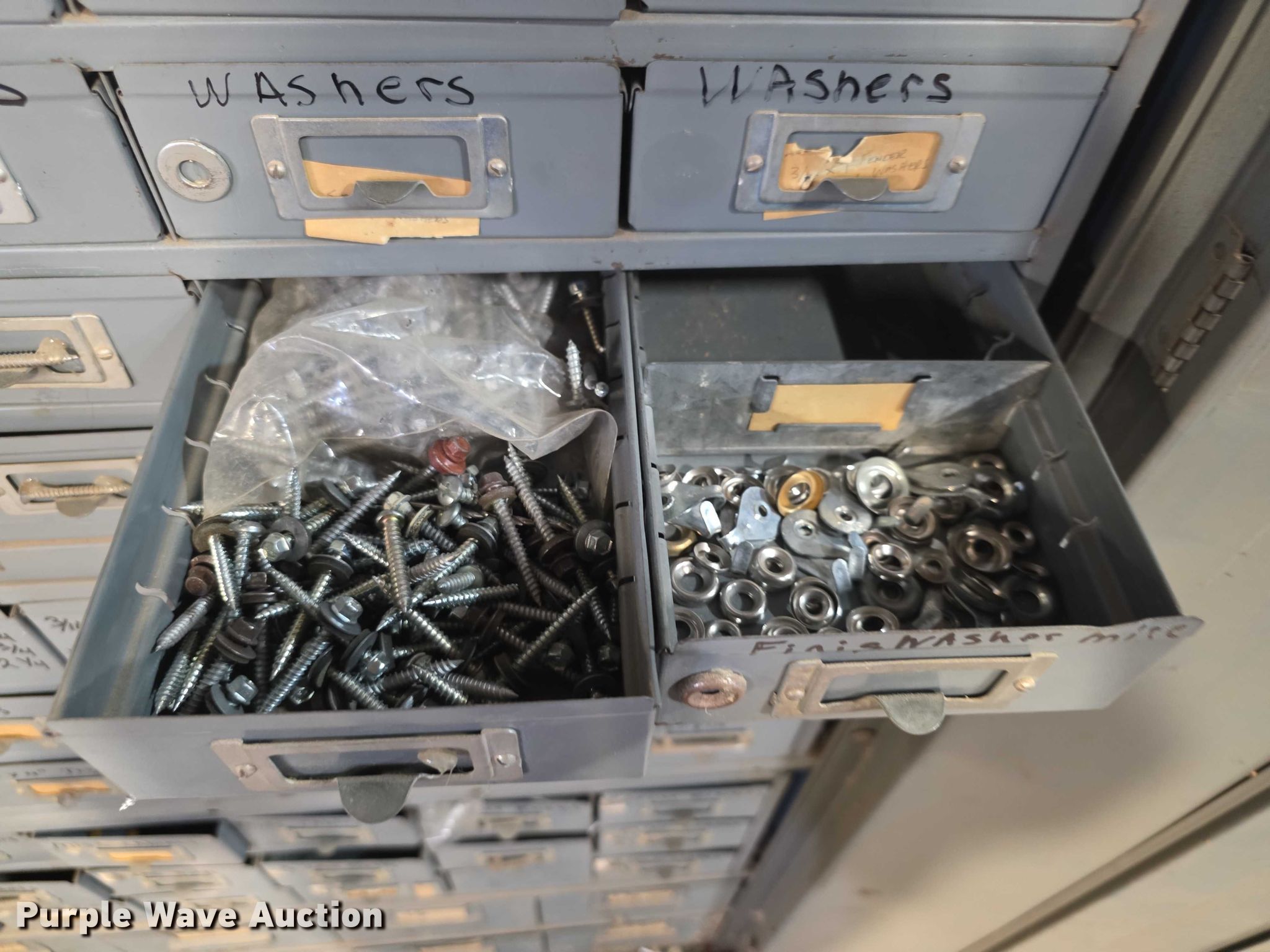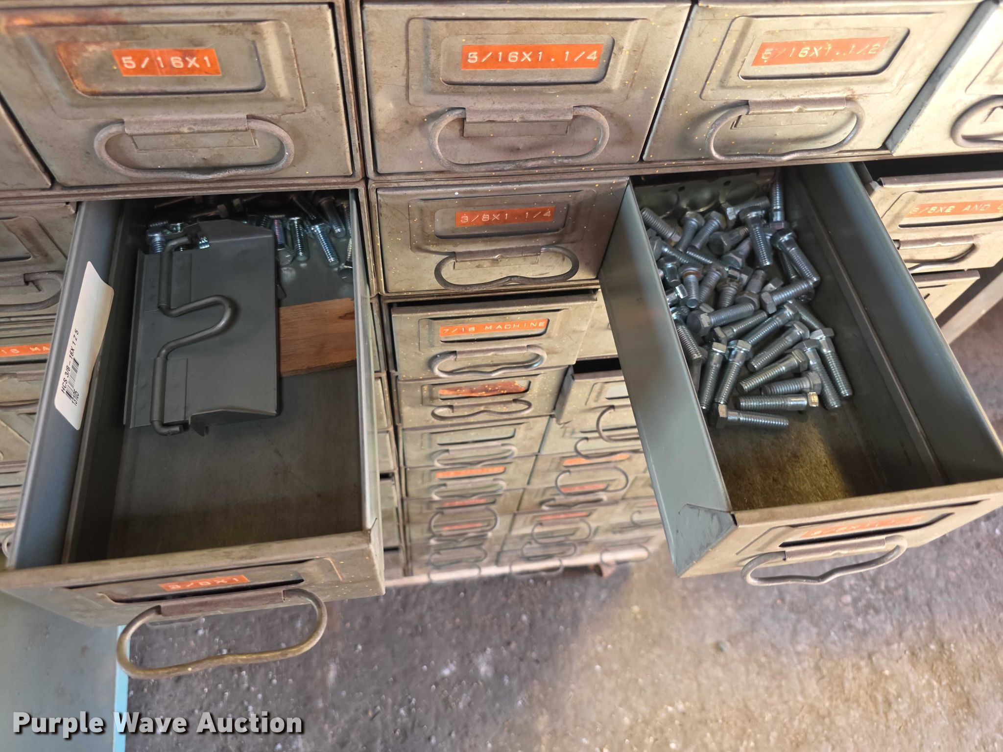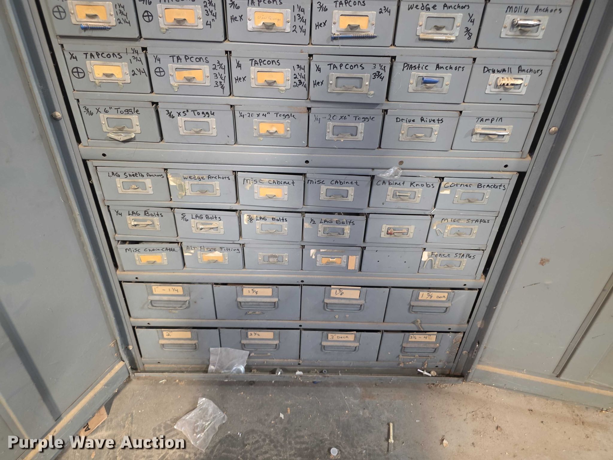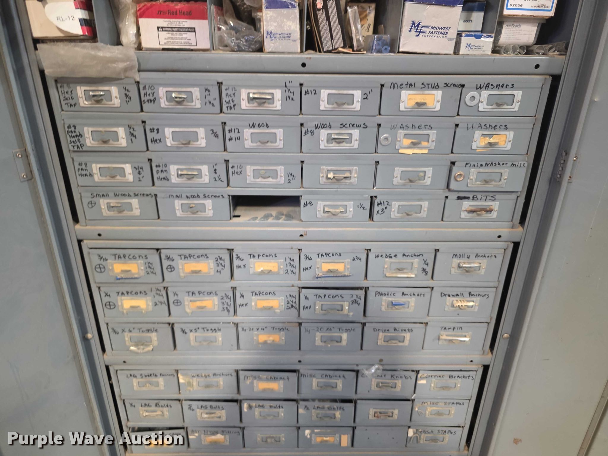 (4) storage cabinet. 3' x 14" x 88", (3) bolt bins, Contents included. Leavenworth, KS 66048