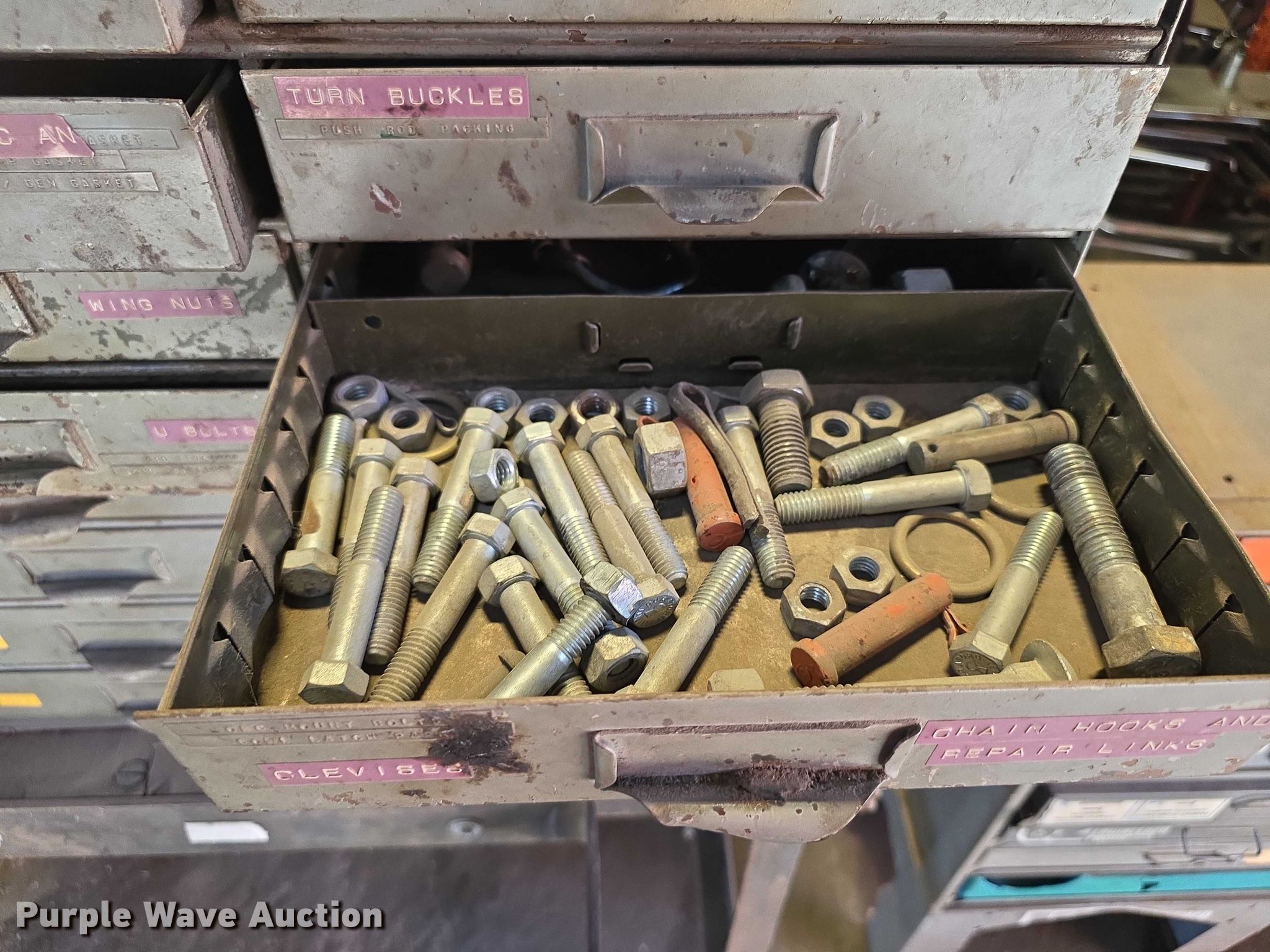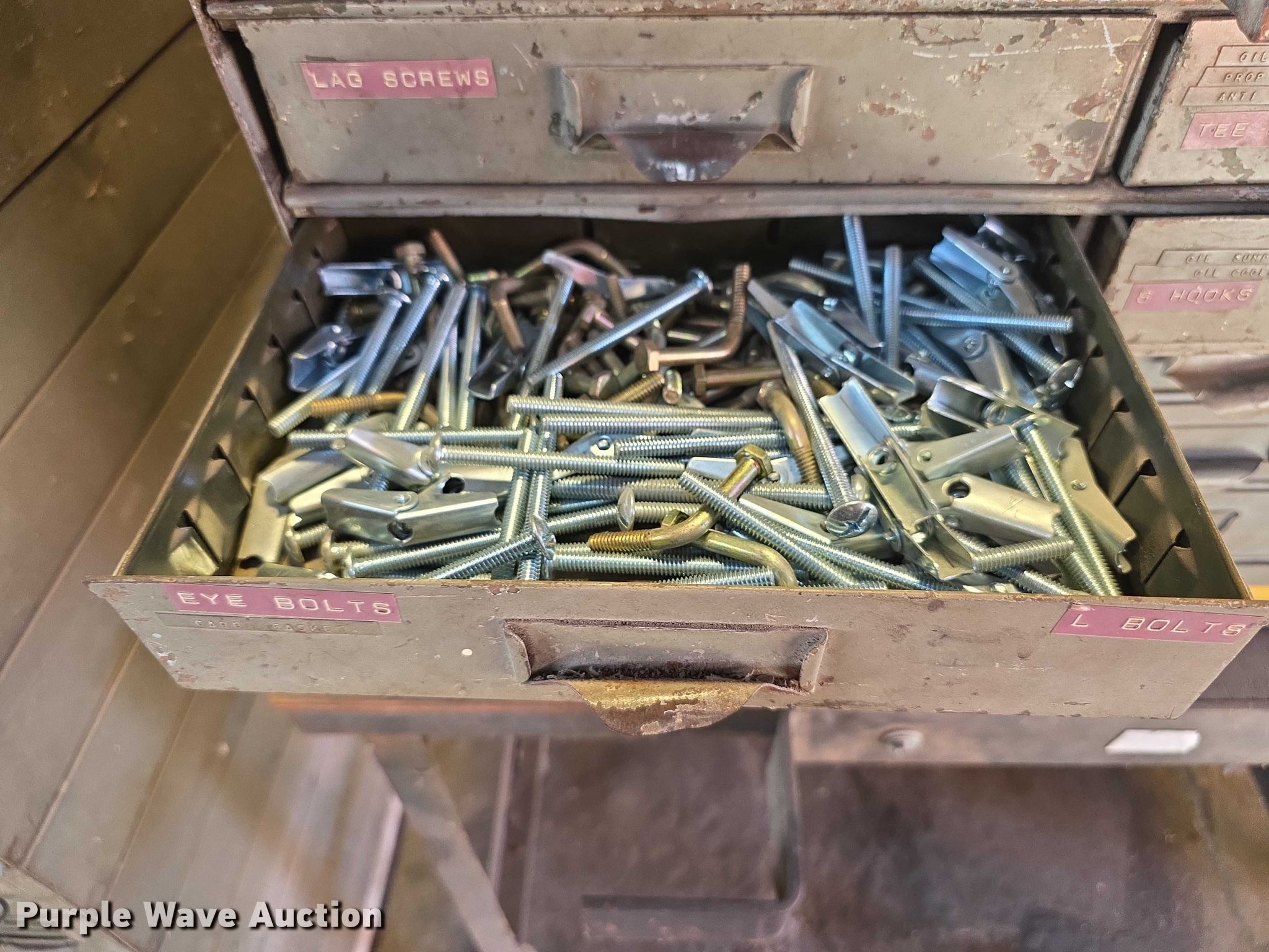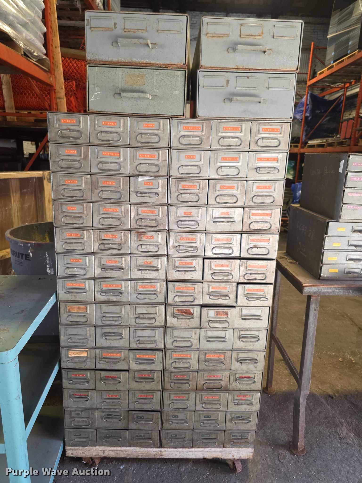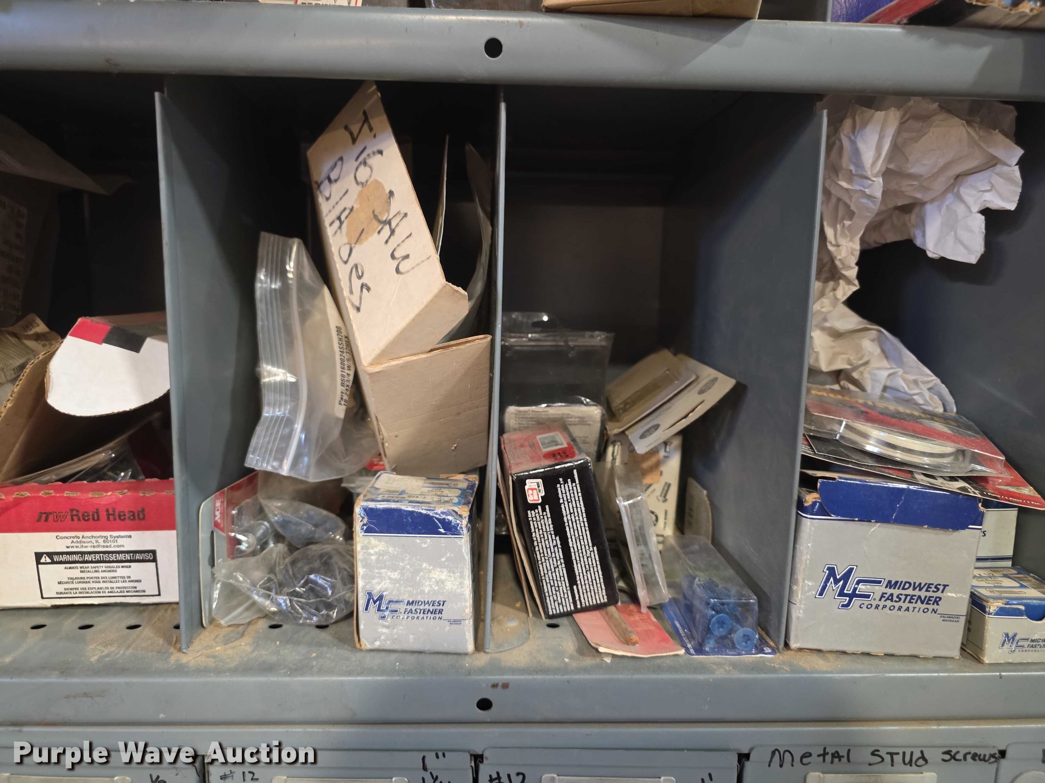 (4) storage cabinet. 3' x 14" x 88", (3) bolt bins, Contents included. Leavenworth, KS 66048
