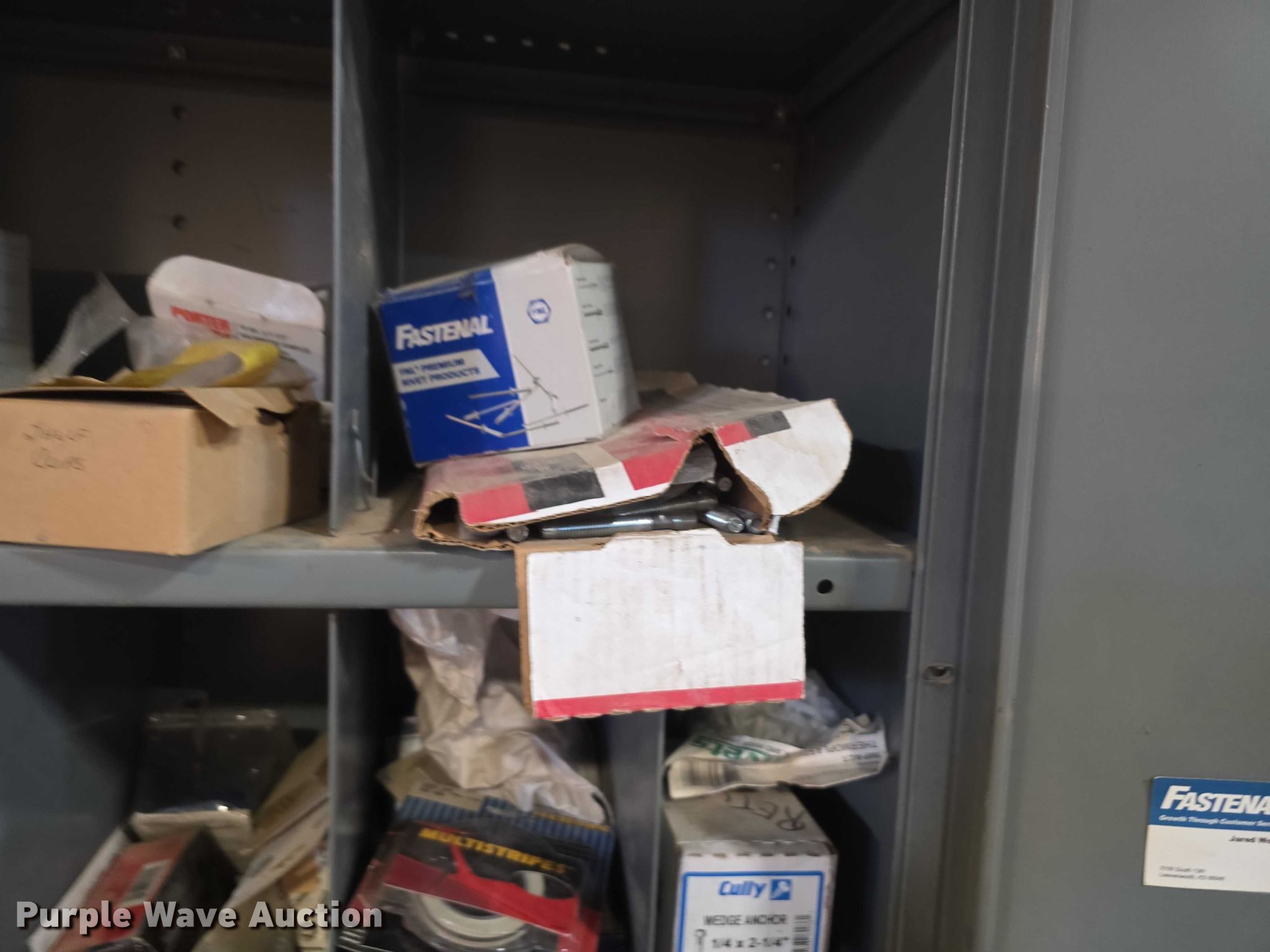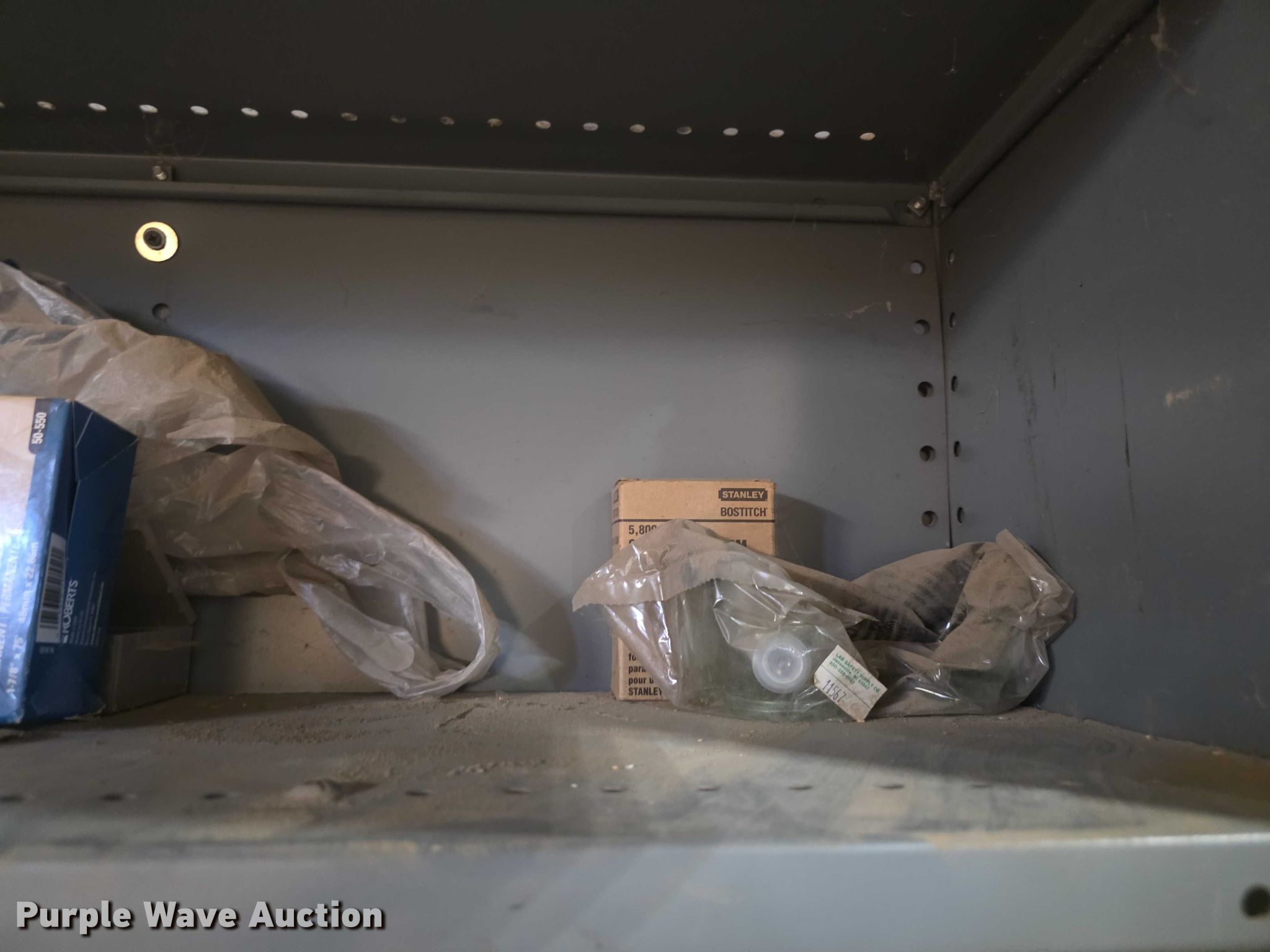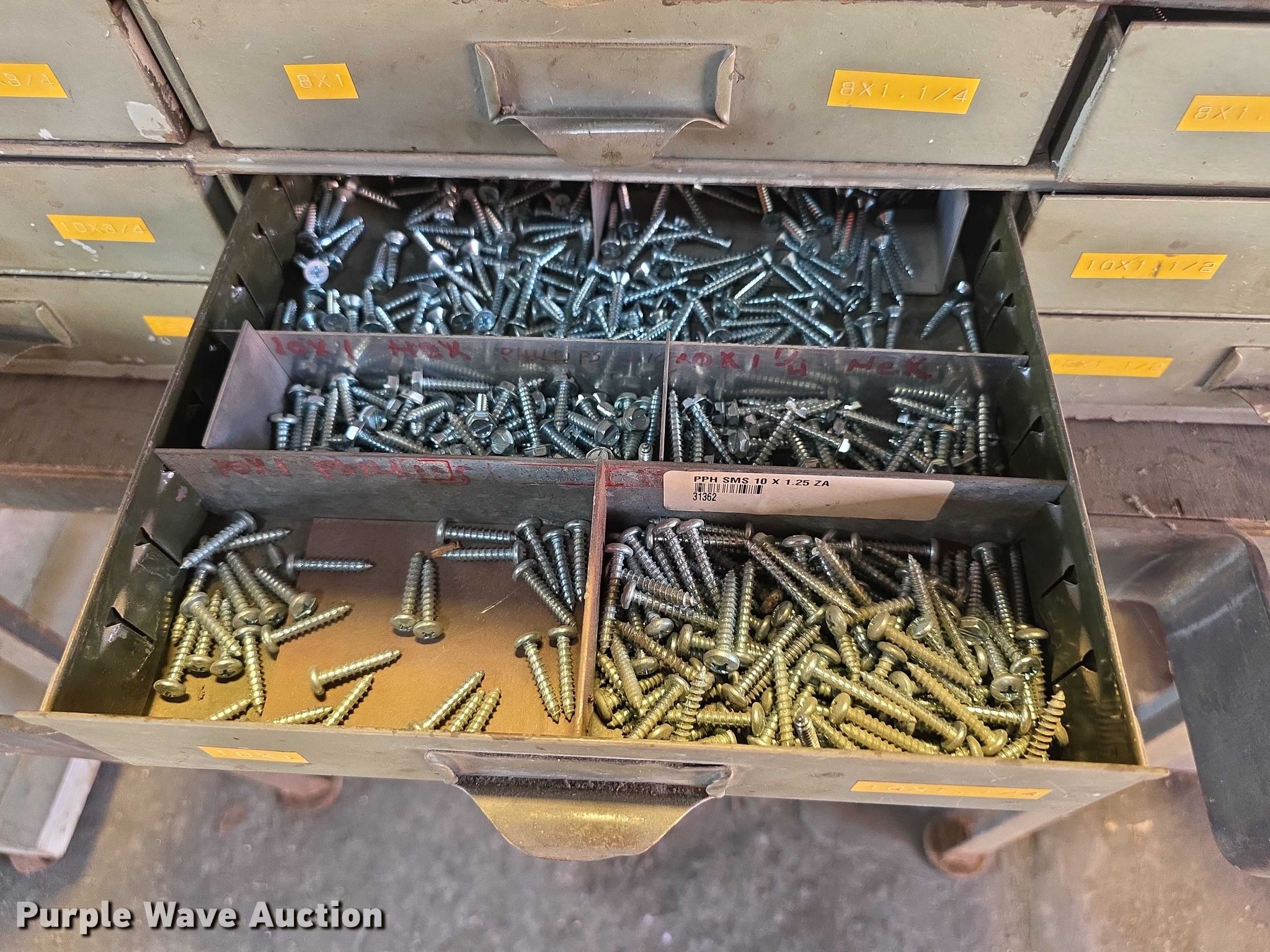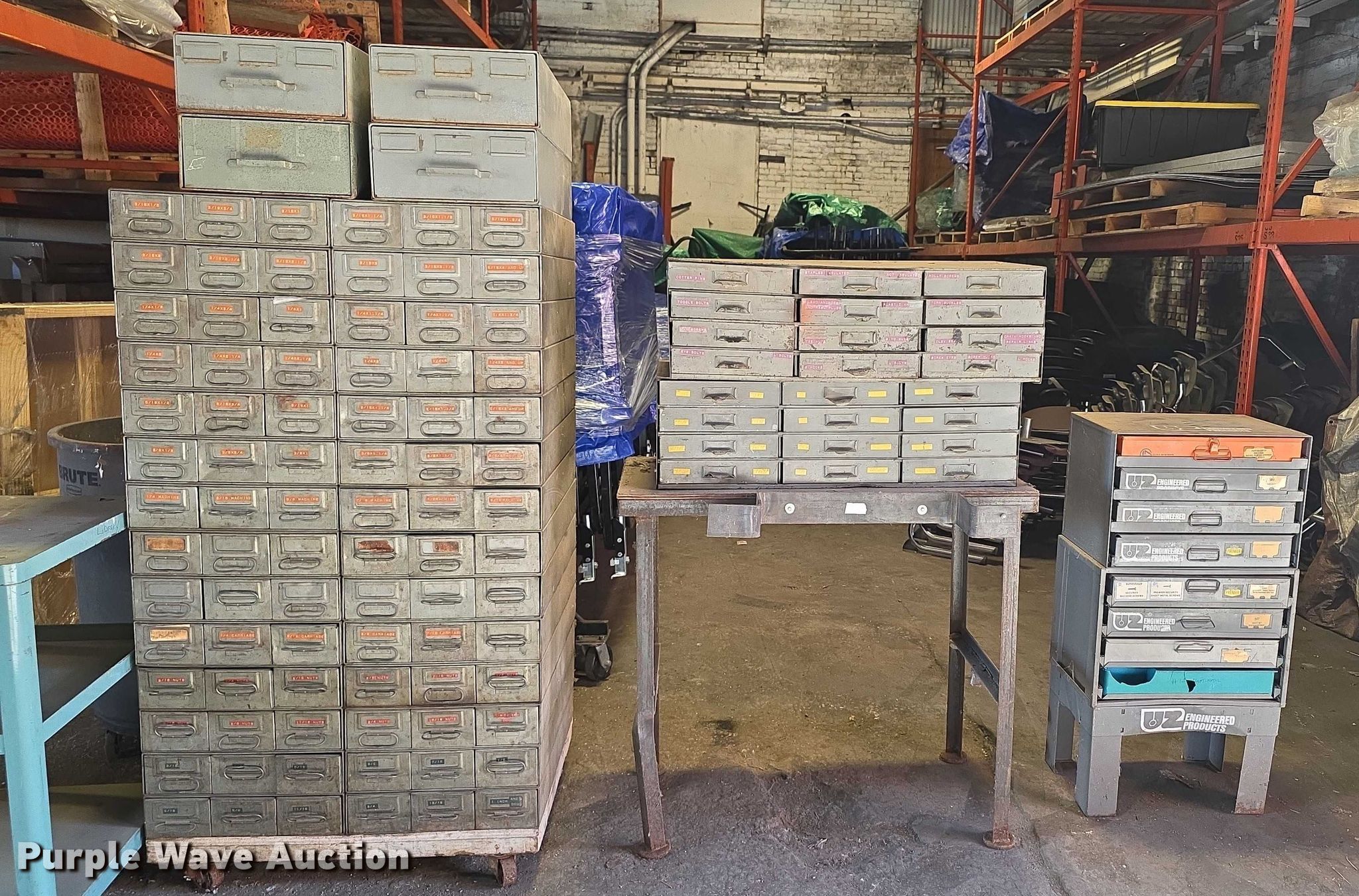 (4) storage cabinet. 3' x 14" x 88", (3) bolt bins, Contents included. Leavenworth, KS 66048