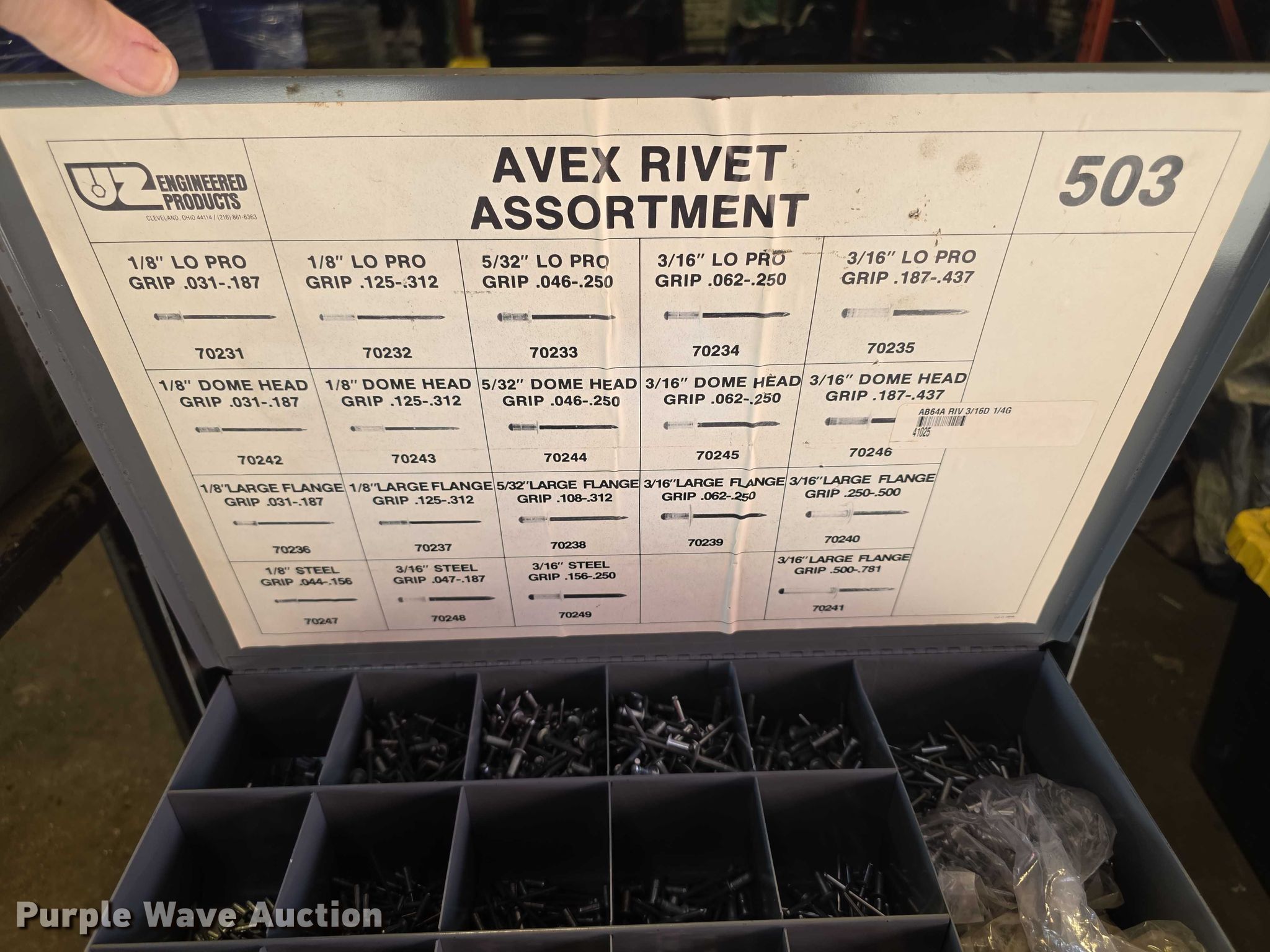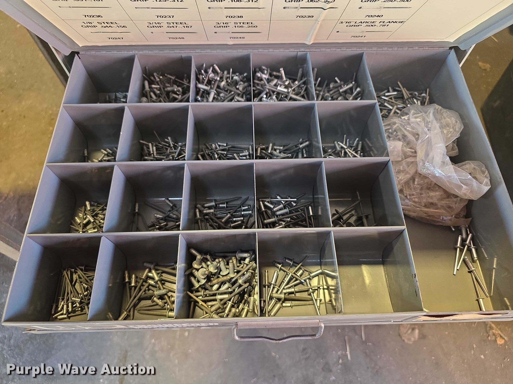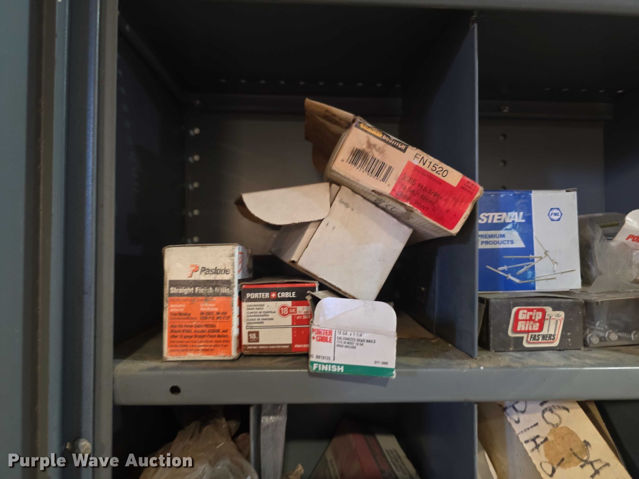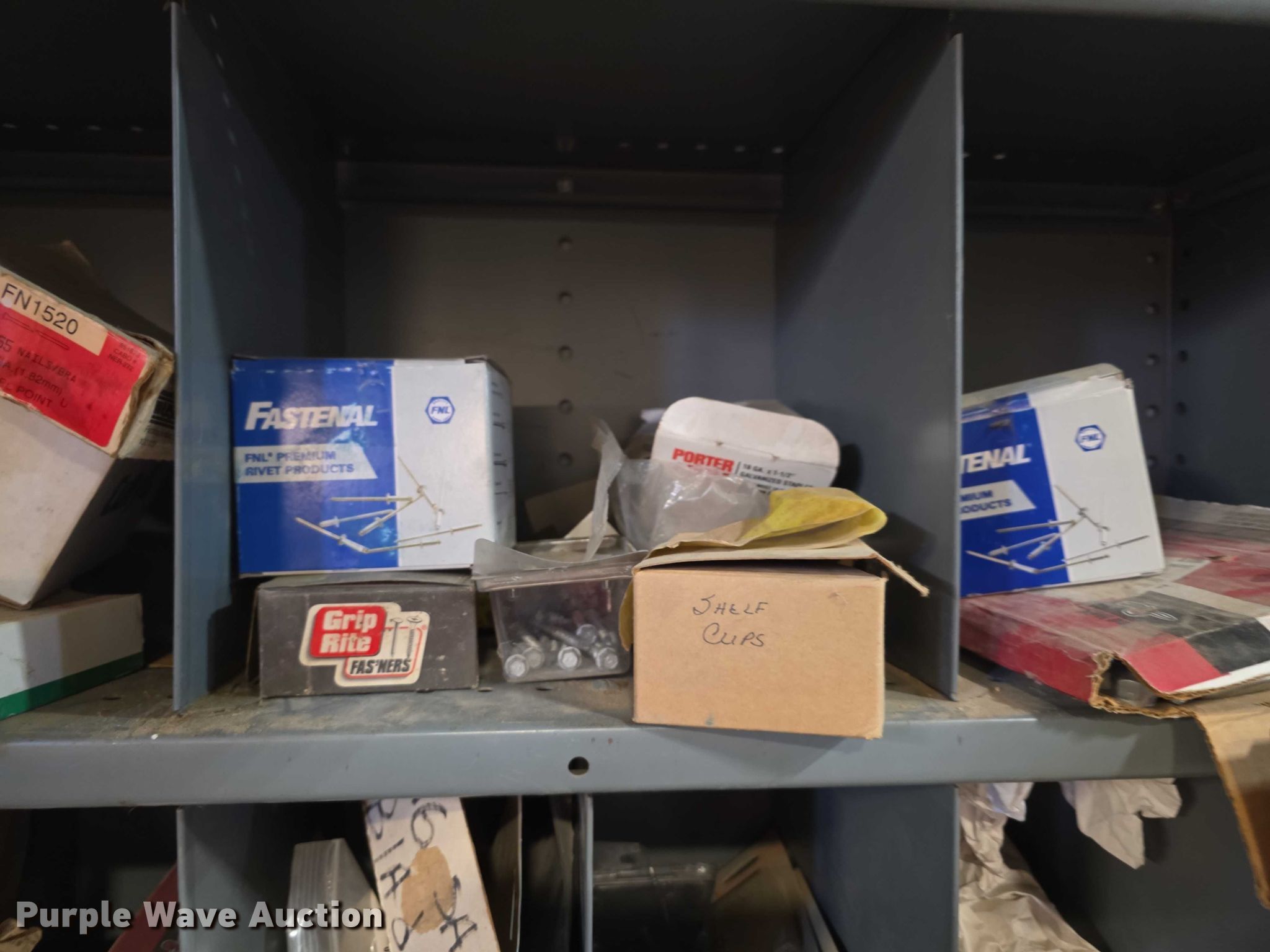 (4) storage cabinet. 3' x 14" x 88", (3) bolt bins, Contents included. Leavenworth, KS 66048