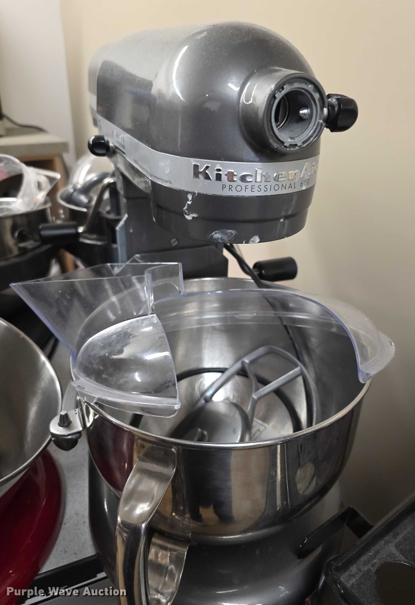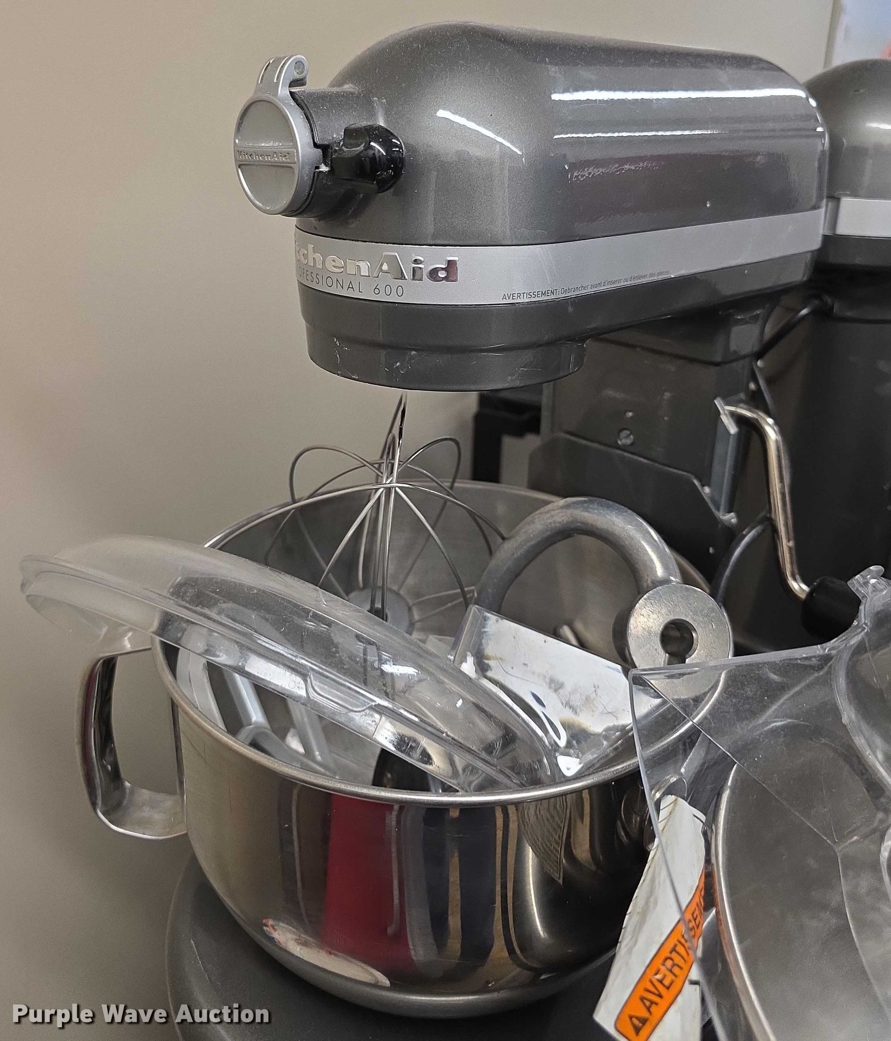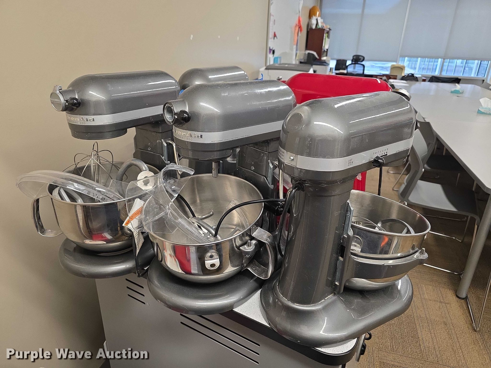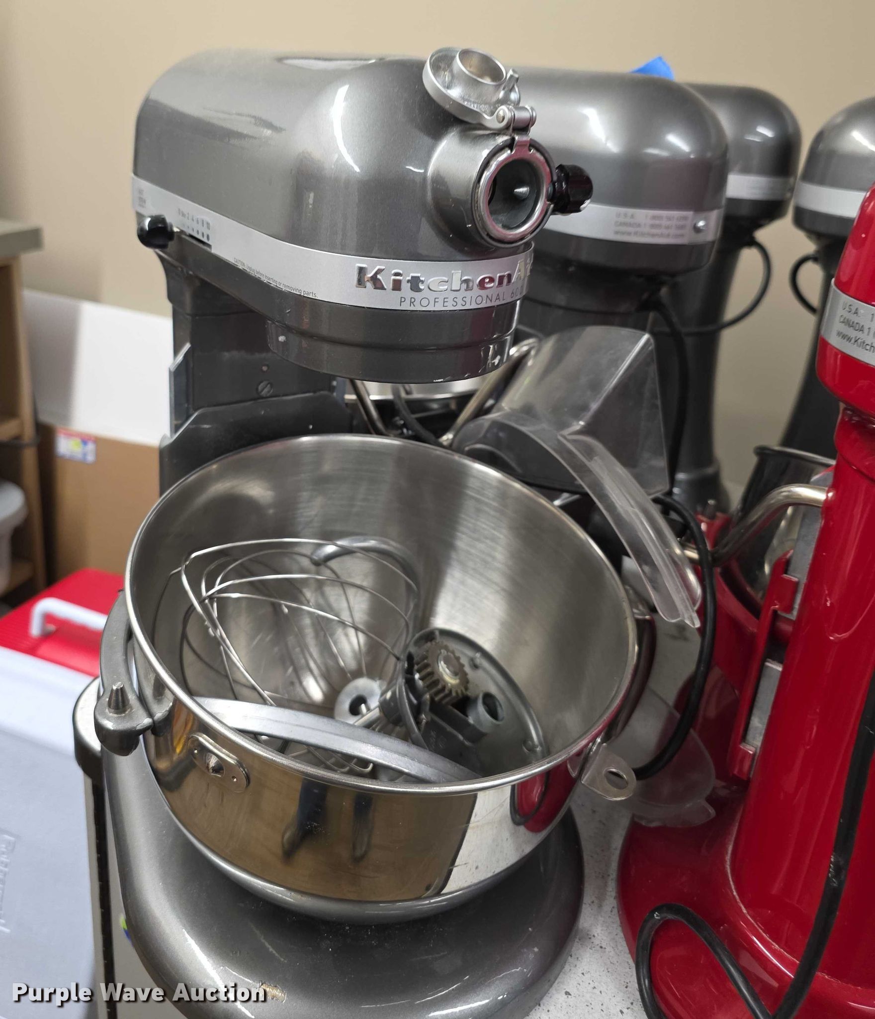 Purple Wave is selling a used Restaurant Equip. in Kansas. This item is a (5) Kitchen Aid Pro Mixers with the following: Bowls, Shields, Whips and more