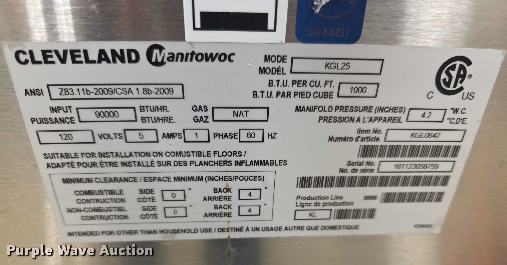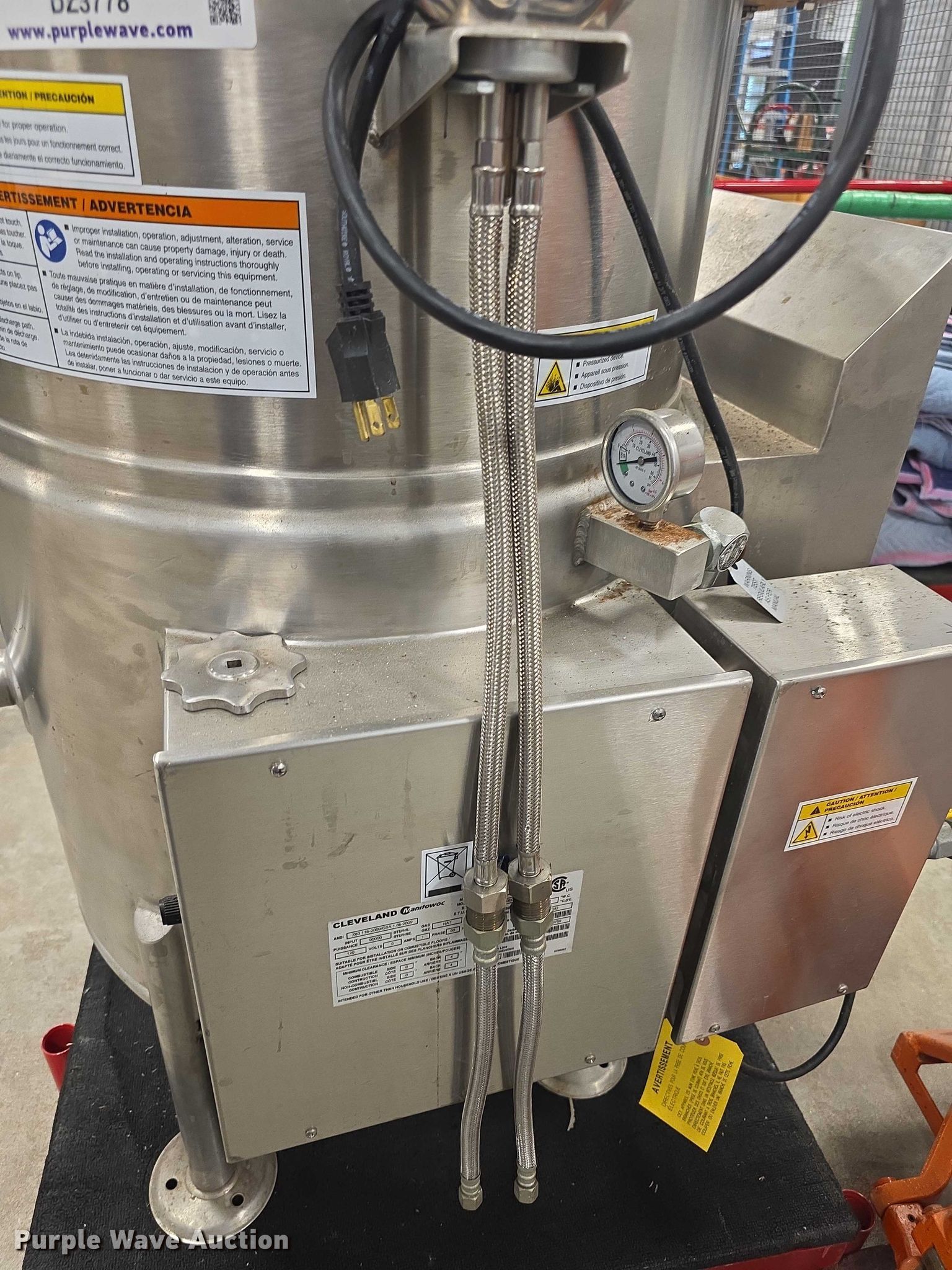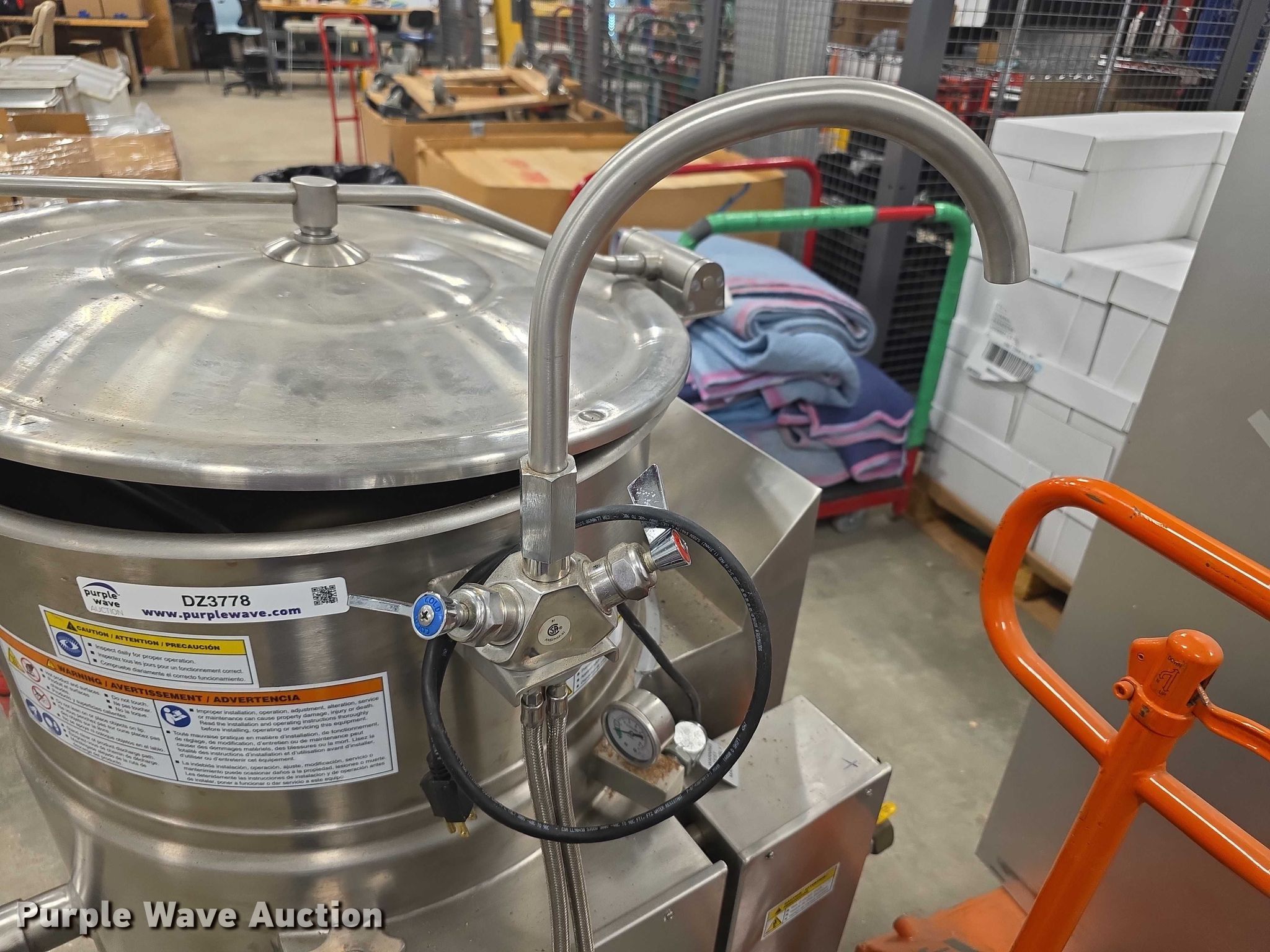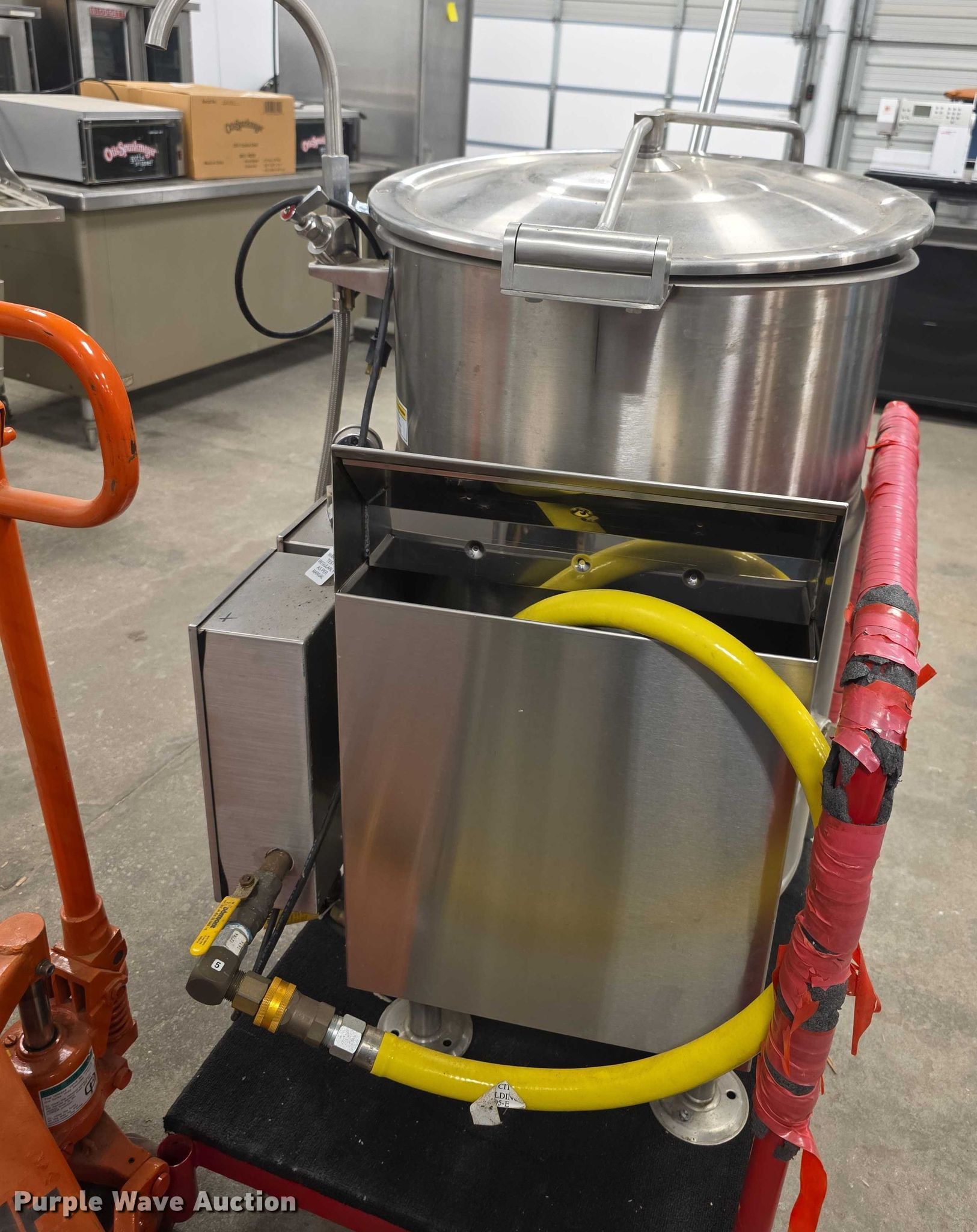 Purple Wave is selling a used Restaurant Equip. in Kansas. This item is a Cleveland KGL25 soup kettle with the following: Serial: 161123058759, Paddle, Phase: Single, Fuel type: Natural gas, Cart not included