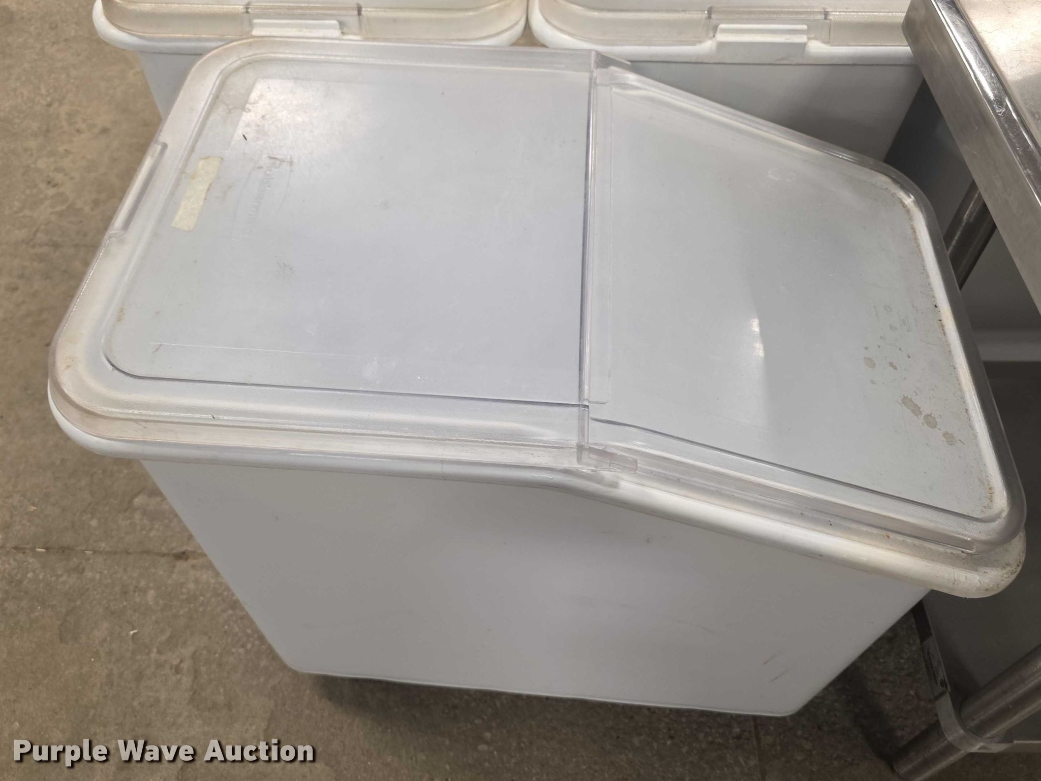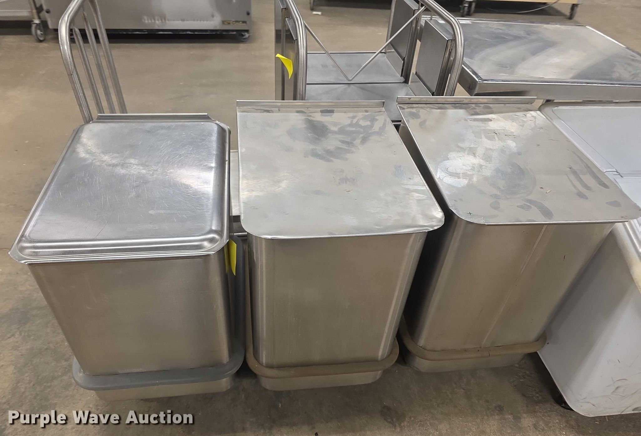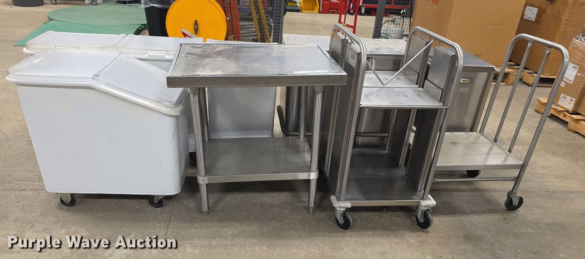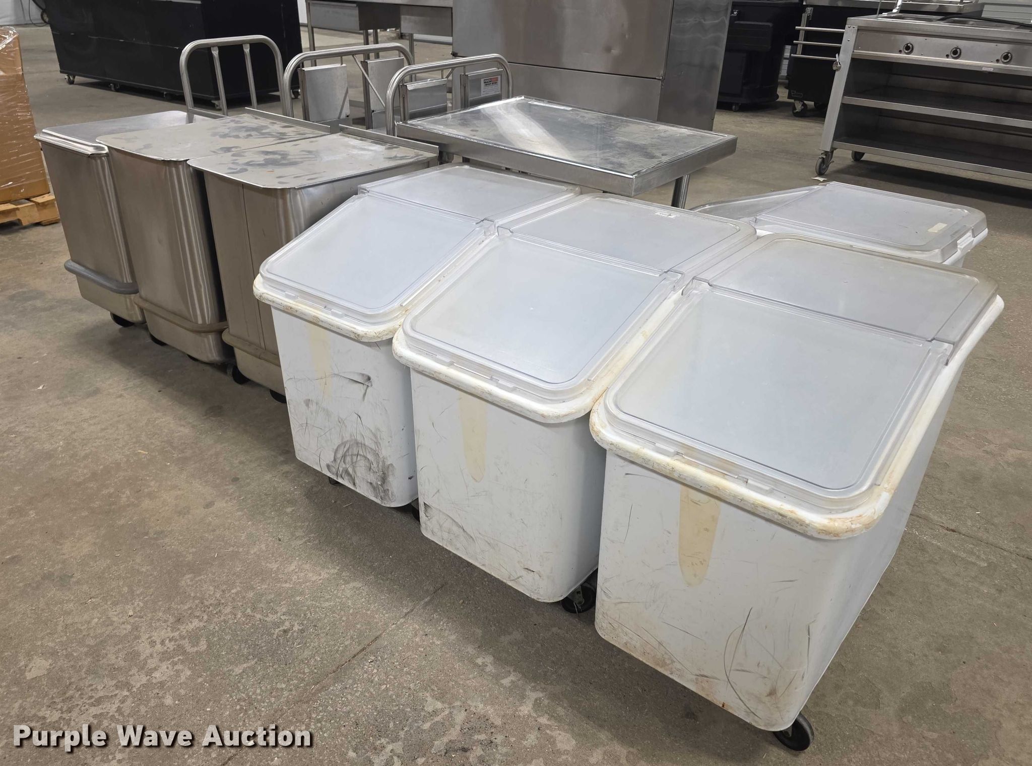 Purple Wave is selling a used Restaurant Equip. in Kansas. This item is a Restaurant equipment with the following: (7) dry storage bins, SS side table, Tray cart, Cart