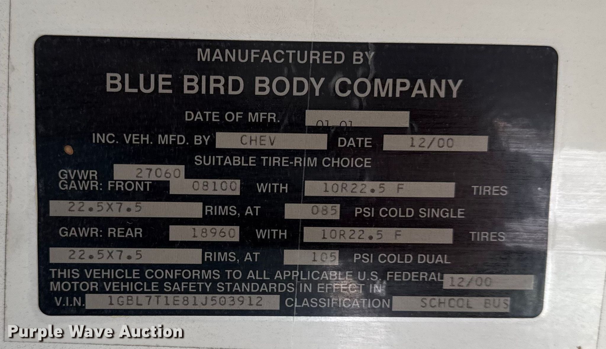 2001 Bluebird bus. Miles: 55,180 on odometer, VIN: 1GBL7T1E81J503912. Engine Displacement: 8.1L, Cylinders: 8, Fuel type: Gas. Transmission Automatic. Chassis Axles: Single, Suspension: Spring, Brakes: Hydraulic, GVWR: 27,060 lbs. Interior Heat, Wheelchair lift. Tires Size: 10R22.5. Kansas title. Title distribution may be delayed up to 14 days from verification of funds. USD 346 Jayhawk. Mound City, KS 66056