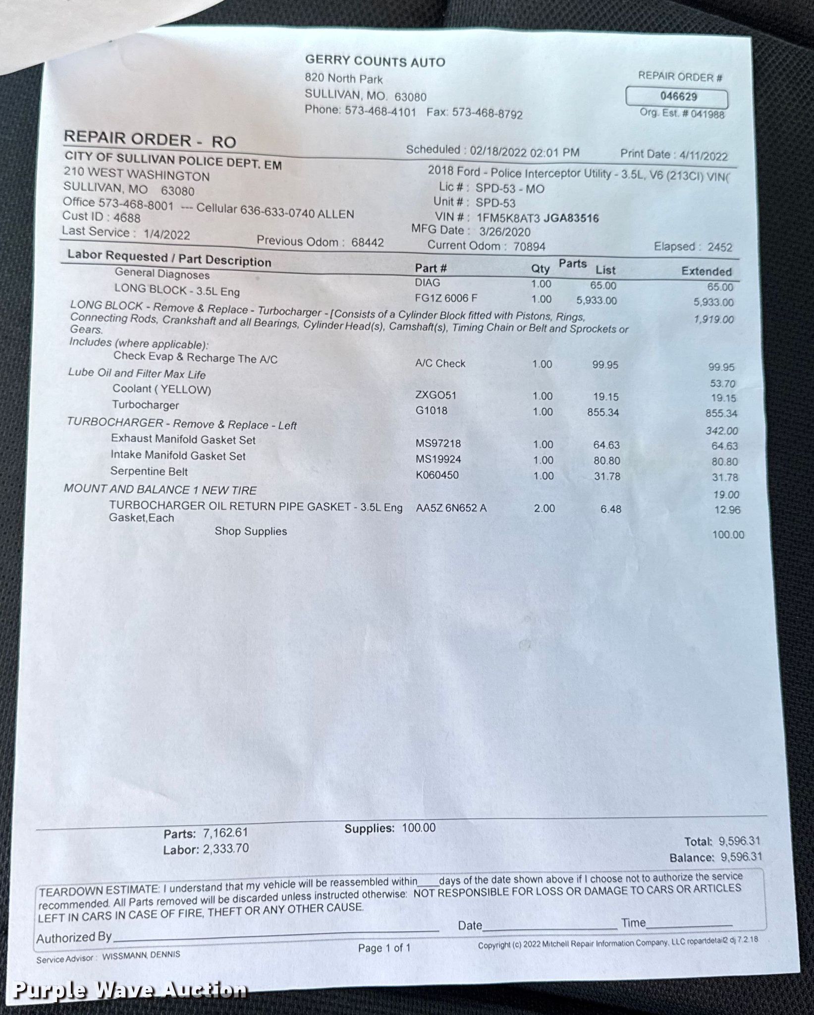 2018 Ford Explorer Police Interceptor SUV for sale in Sullivan, Missouri. Item EN0831 will sell on February 3rd, 2026.