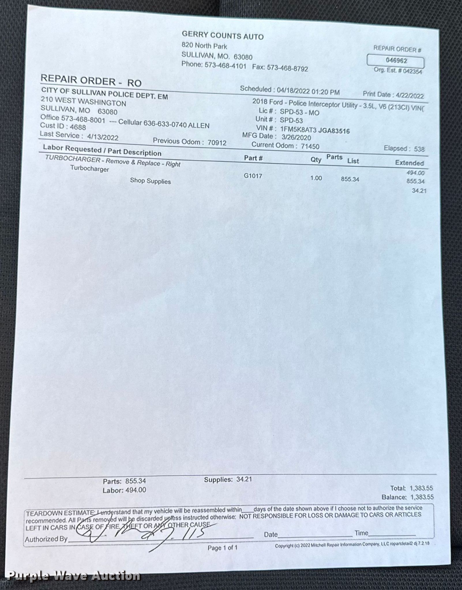 Purple Wave is selling a used Passenger Vehicle in Missouri. This item is a 2018 Ford Explorer Police Interceptor SUV with the following: Miles: 106,358 on odometer, Hours: 8,548 on meter, VIN: 1FM5K8AT3JGA83516