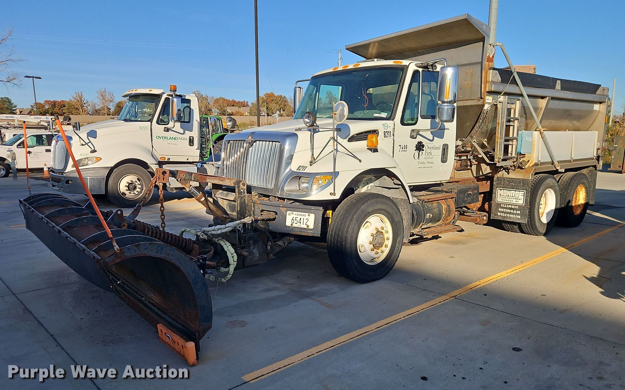 2006 International 7400 dump truck. Miles: 100,230 on odometer, Hours: 748,471 on meter, VIN: 1HTWGAAT76J232136, Unit #: 8211. Engine Model: DT466, Displacement: 7.64L, Cylinders: 6, Fuel type: Diesel. Transmission Automatic. Chassis Axles: Tandem, Suspension: Spring over walking beam, Brakes: Air, Wheelbase: 193". Interior AC, Heat, Cruise control. Features Bed Live-bottom dump bed, Length: 14', Width: 97", Side height: 46", Bed type: Steel, Roll tarp, Ram: Single, End gate: Manual, Spreader, Plow Monroe, Width: 132". Tires Front: 315/80R22.5, Rear: 11R22.5. Notes Non-operational engine , Non-operational unit, Unit must be towed or hauled. Kansas title. Title distribution may be delayed up to 30 days from verification of funds. City of Overland Park, KS. Overland Park, KS 66213