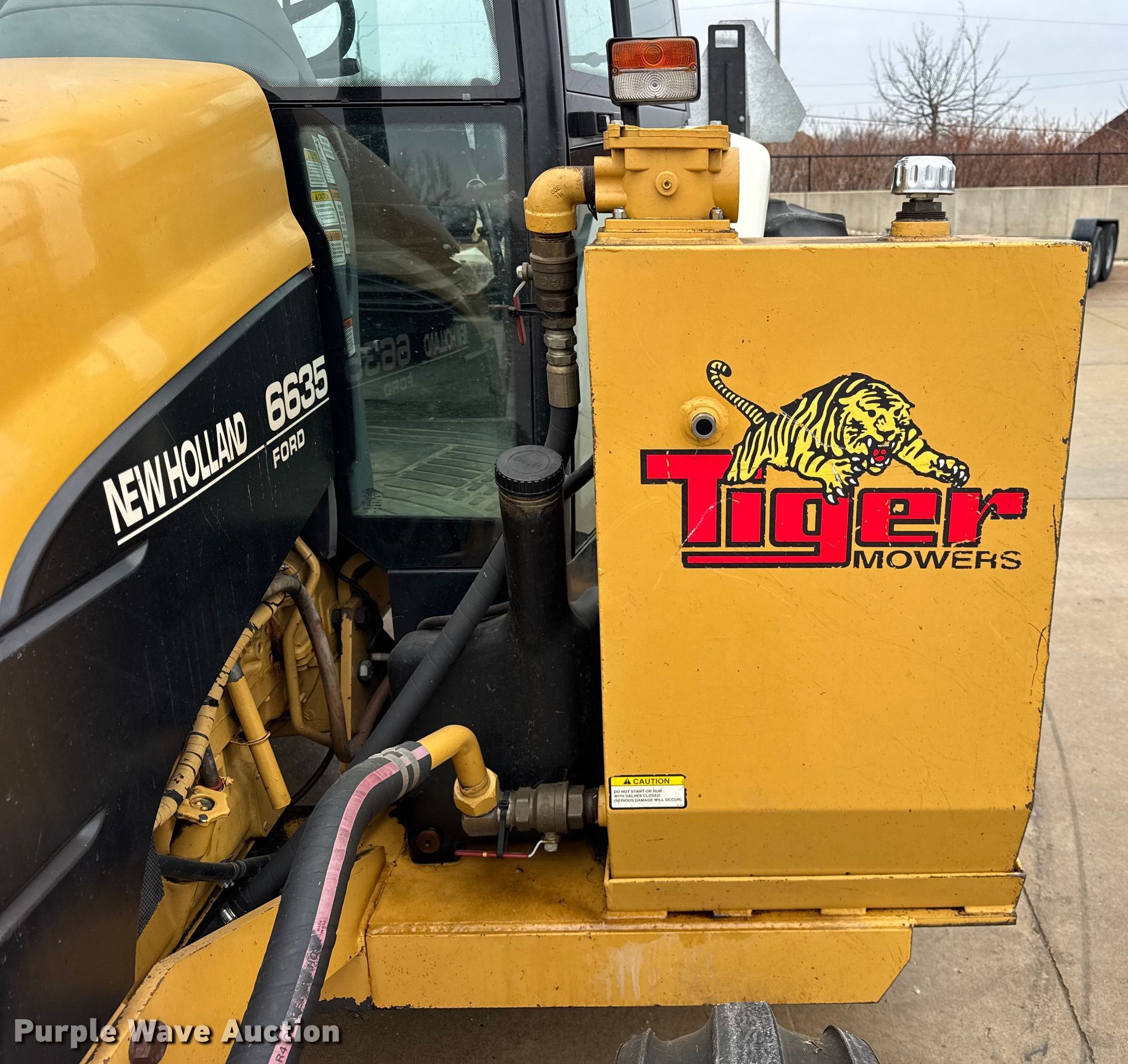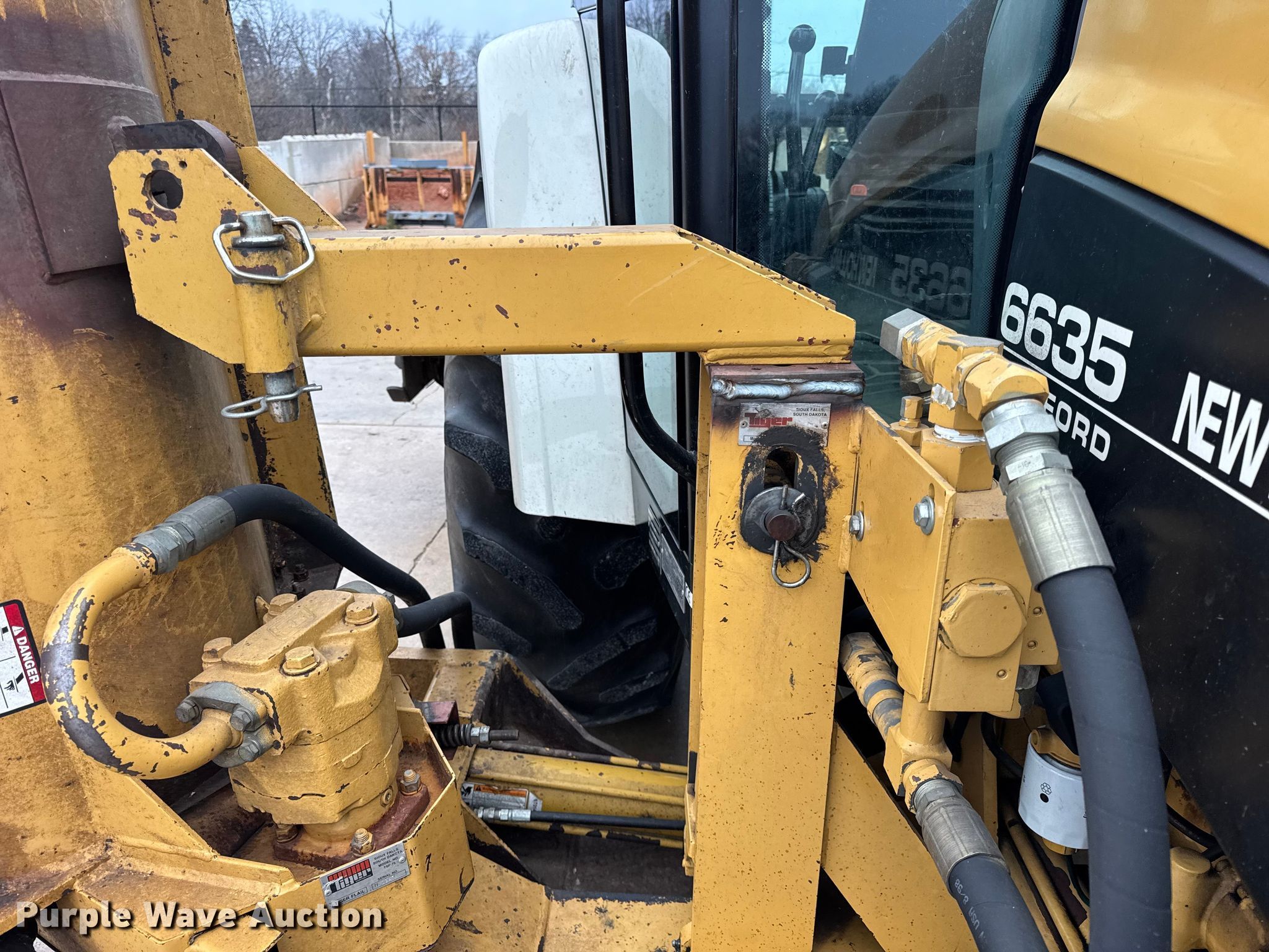 1997 New Holland 6635 tractor. Hours: 1,769 on meter, Serial: 001119538. Engine Cylinders: 4, Fuel type: Diesel. Transmission Synchro, 12F - 12R, Differential lock. Operators station AC, Heat. Features PTO: 540, Three point Top link, Seven pin outlet, ISOBUS outlet, Hydraulic remote sets Rear: 2, Loader Controls: Joystick, Tiger side boom flail mower Width: 72", Tiger flail mower Width: 96", Hitch: Three point. Tires Front: 10.00-16, Rear: 18.4-30. Notes Transmission issues, non-operational reverse gear. Sturtevant, WI 53177