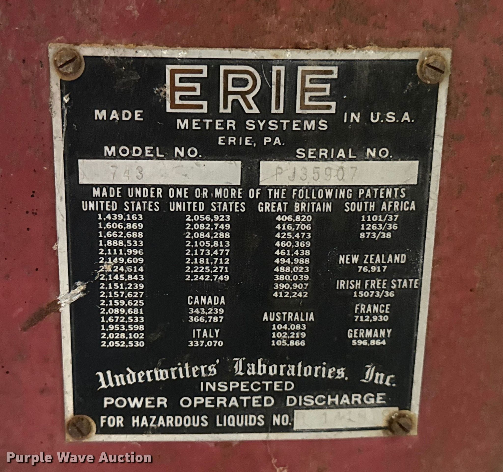 Purple Wave is selling a used Fuel and Lube in Oklahoma. This item is a Erie 743 gas pump with the following: Serial: PJ35907