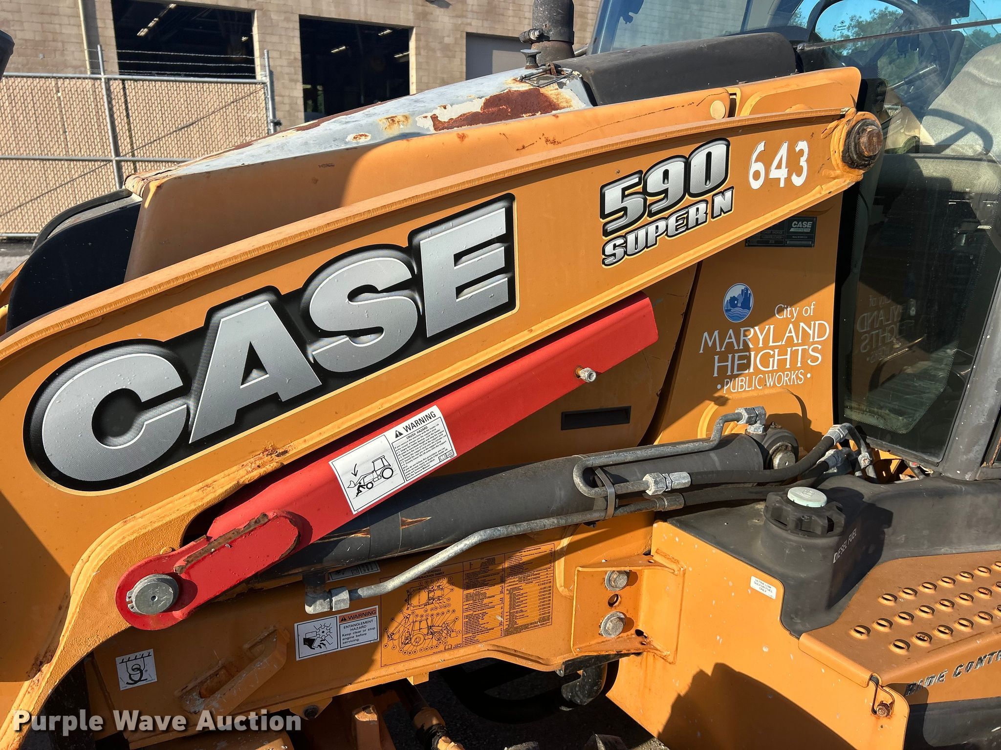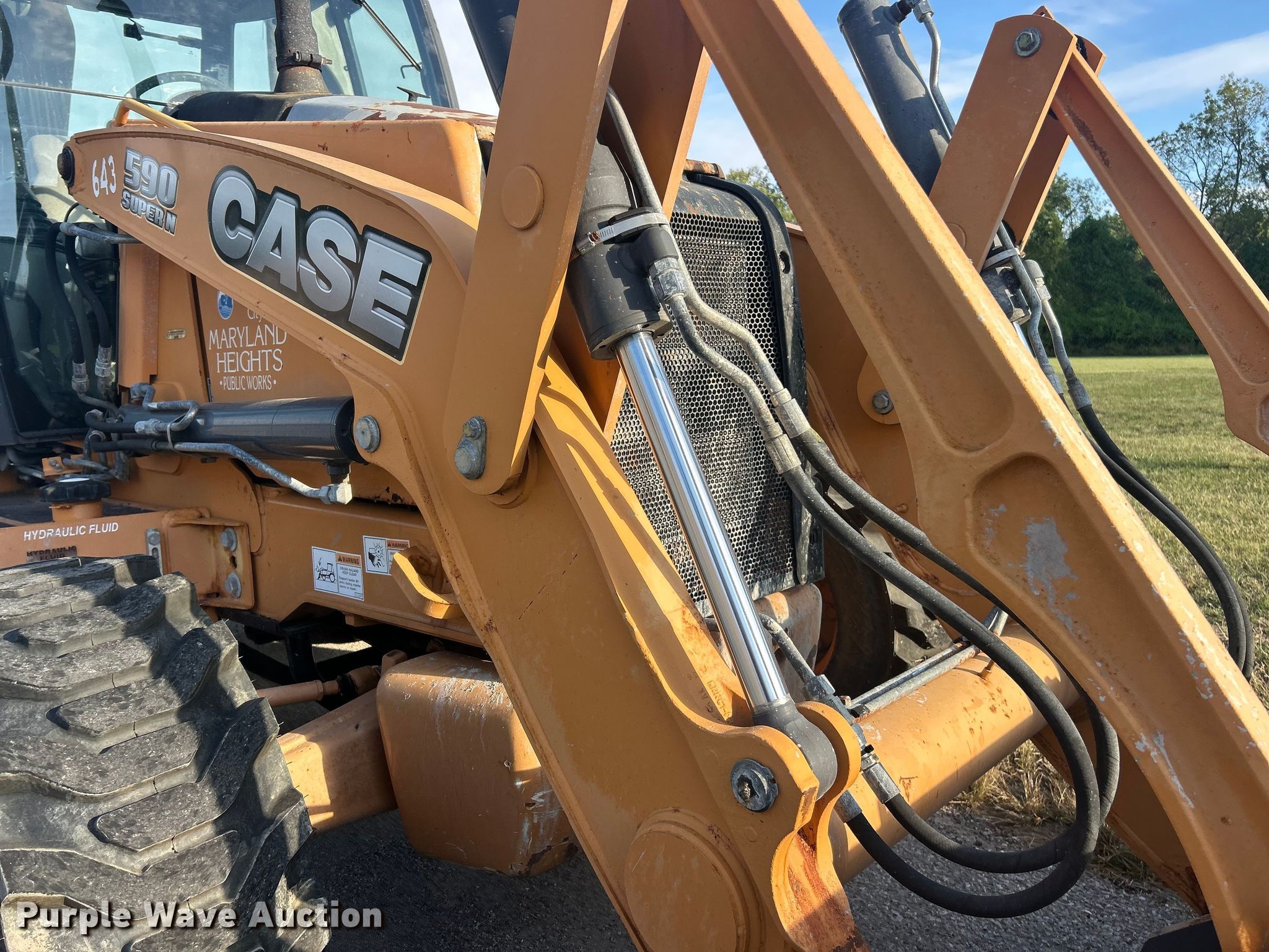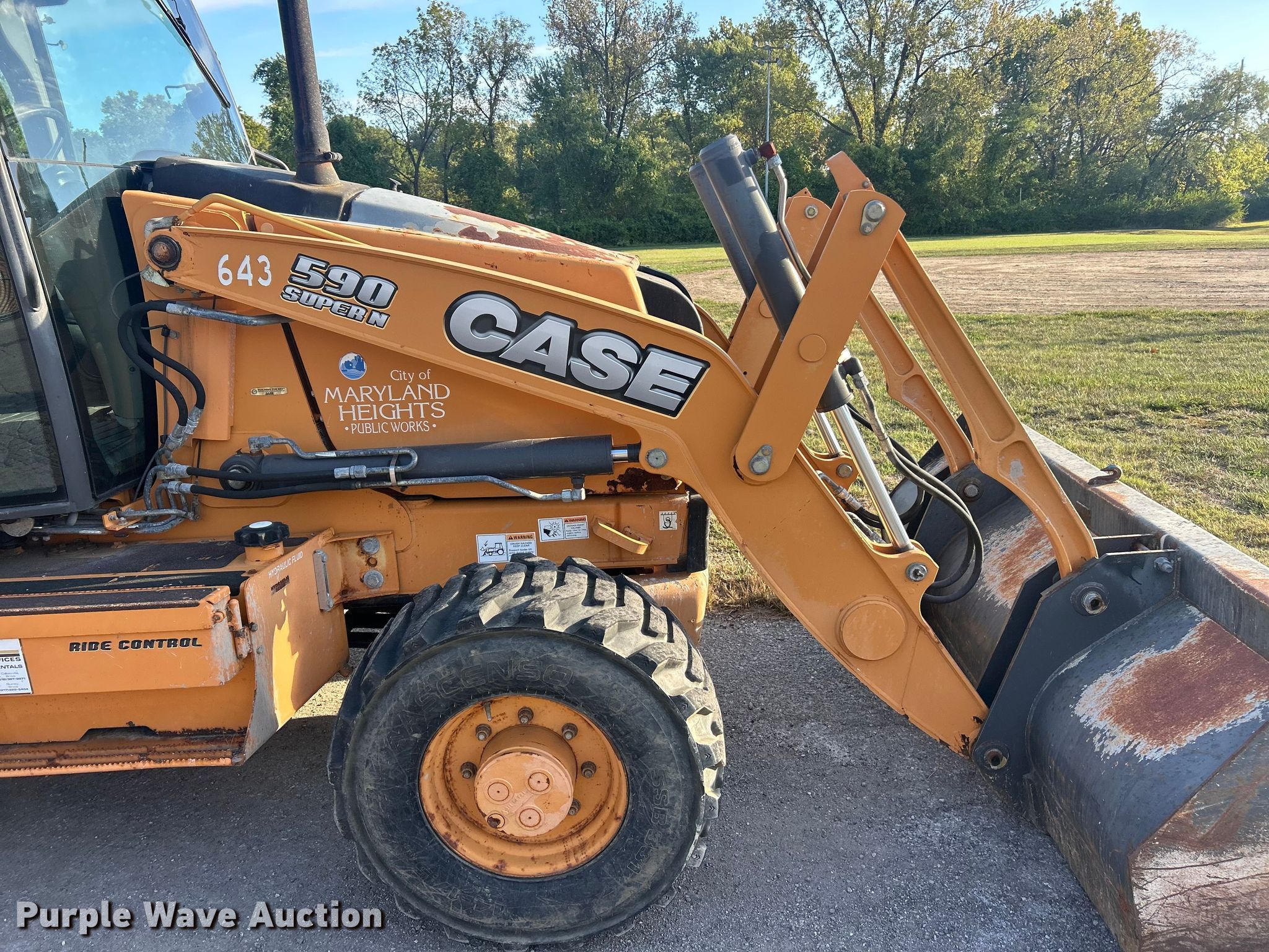 2013 Case 590 Super N backhoe. Hours: 1,495 on meter, Serial: JJGN59SNLDC591098. Engine Cylinders: 4, Fuel type: Diesel. Transmission Shuttle shift. Chassis Four wheel drive. Operators station Enclosed cab, AC, Heat, Backhoe controls: Wobble stick / two stick. Features Loader Bucket Width: 94", Cutting edge: Bolt-on, Backhoe Extendable stick, Auxiliary hydraulics, Bucket Width: 36", Teeth: 6.. Tires Front: 14-17.5, Rear: 21L-24. Notes Hydraulic leak. City of Maryland Heights, MO. Maryland Heights, MO 63043