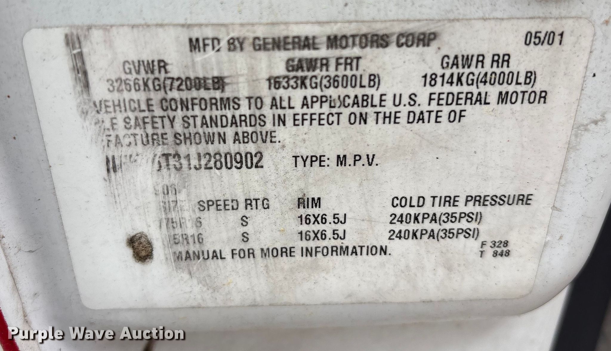 2001 Chevrolet Suburban SUV. Miles: 83,103 on odometer, VIN: 1GNFK16T31J280902. Engine Displacement: 5.3L, Cylinders: 8, Fuel type: Gas. Transmission Automatic, Four wheel drive. Interior AC, Heat, Power locks, Cruise control. Tires Size: 265/75R16. Notes Jump start required during on-site data collection, Passenger side rear window missing. Virginia title. Seller is a government entity who will be assigning and distributing the title. Please contact the seller for distribution questions. Title distribution may be delayed up to 14 days from verification of funds. Prince George County/Fleet Department. Prince George, VA 23875