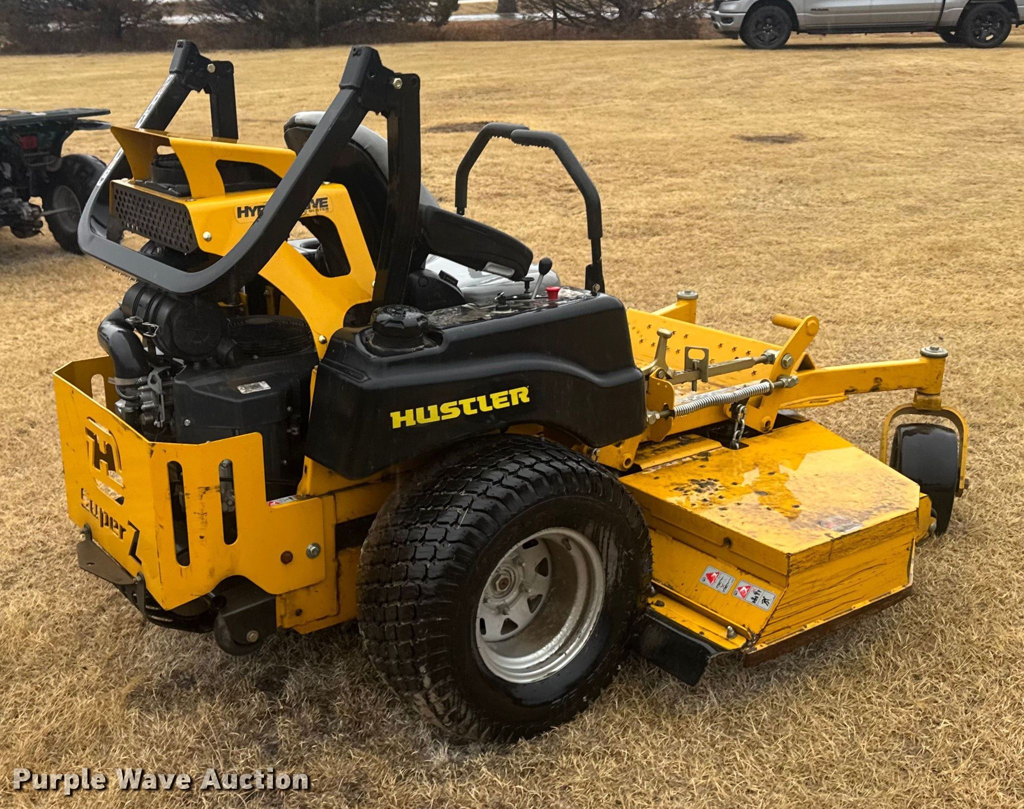 Hustler Super Z ZTR lawn mower. Hours: Unknown, Cutting width: 72", Serial: 13062288. Engine Cylinders: 2, Fuel type: Gas. Transmission Hydrostatic. Operators station OROPS. Tires Front: 12x6.5-12, Rear: 26x12.00-12. Notes Dead battery, Non-operational unit. Kansas Wildlife & Parks. Stockton, KS 67669