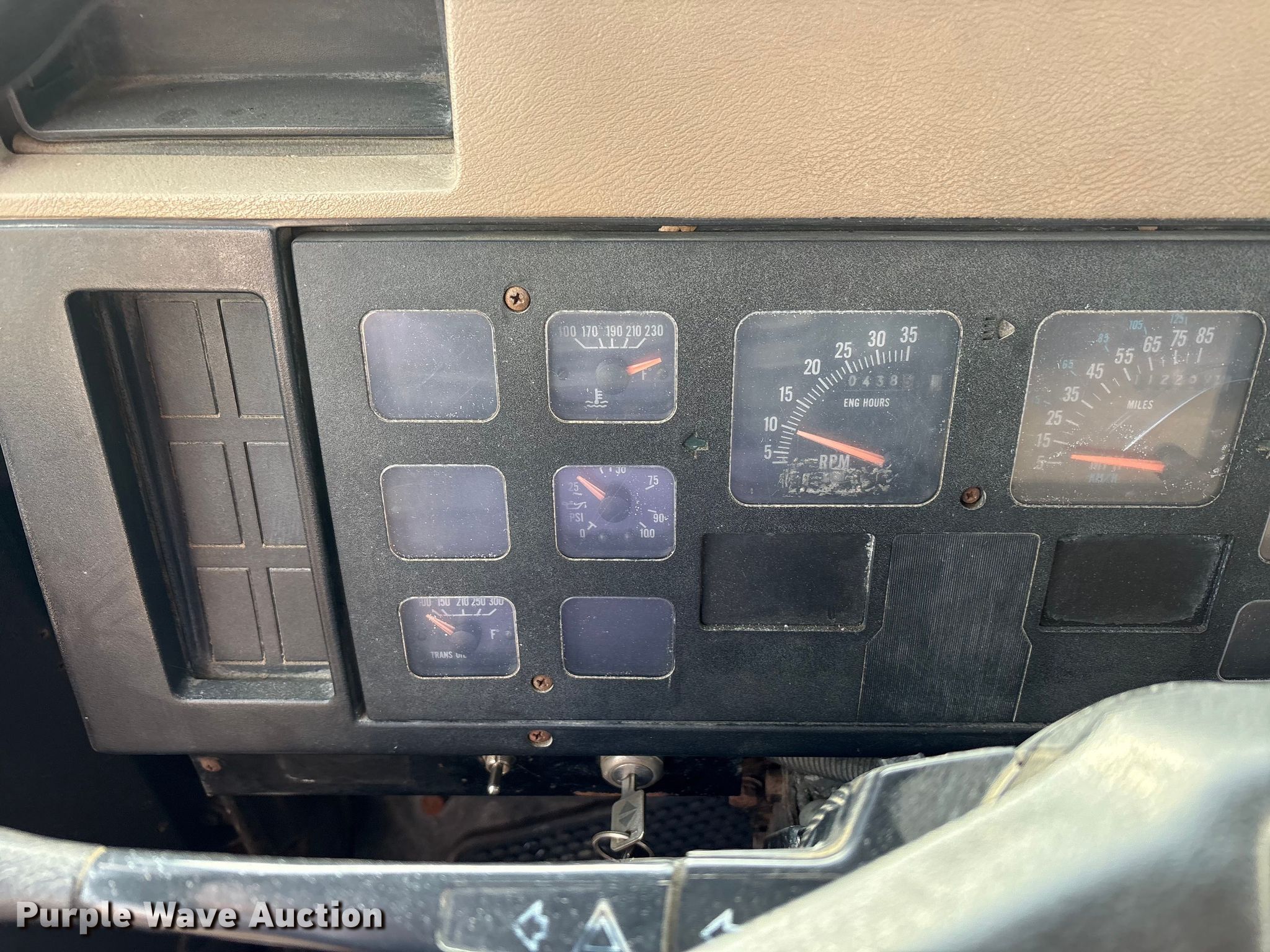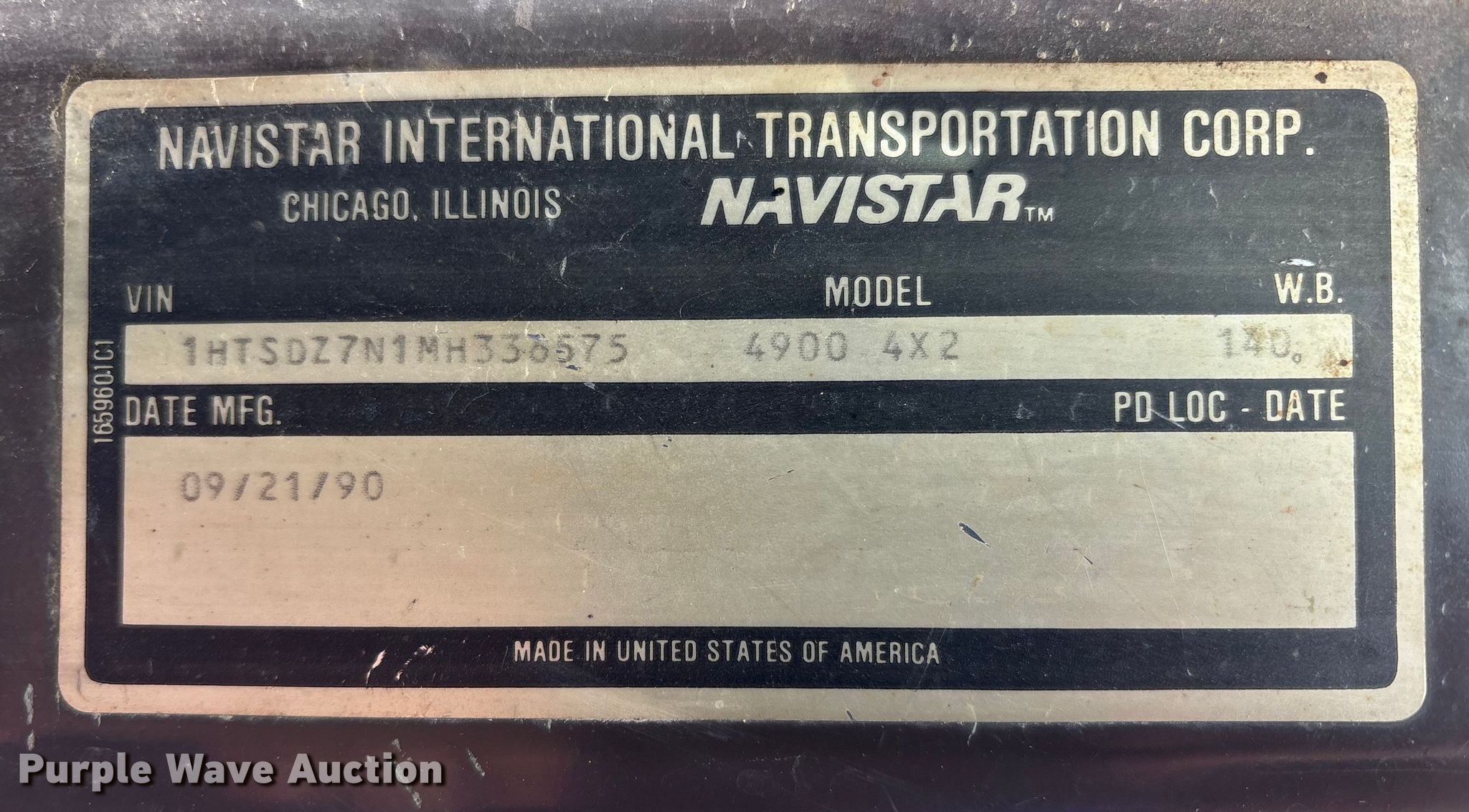 1991 International 4900 dump truck. Miles: 112,269 on odometer, Miles: Actual unknown, Hours: 438 on meter, VIN: 1HTSDZ7N1MH336575. Engine International, Displacement: 7.6L, Cylinders: 6, Fuel type: Diesel. Transmission Automatic. Chassis Axles: Single, Suspension: Spring, Brakes: Air, PTO. Interior Heat. Features Bed Dump bed, Galion 400U, Length: 9', Width: 96", Side height: 26", Side board height: 10", Ram: Single, End gate: Manual, Plow Width: 120". Tires Size: 11R22.5. Notes Non-operational dash cluster, Jump start required during on-site data collection. Ohio title. Seller is a government entity who will be assigning and distributing the title. Please contact the seller for distribution questions. City of Avon Lake. Avon Lake, OH 44012