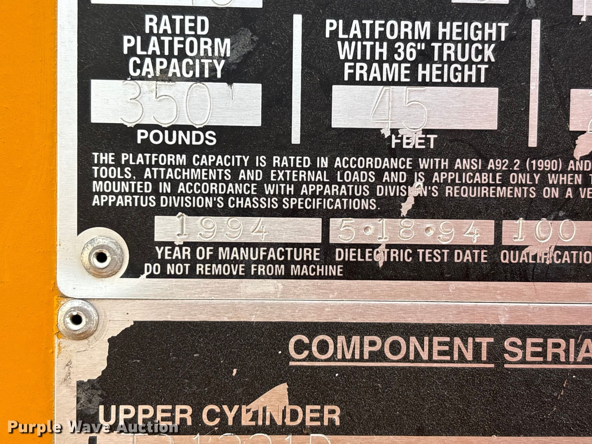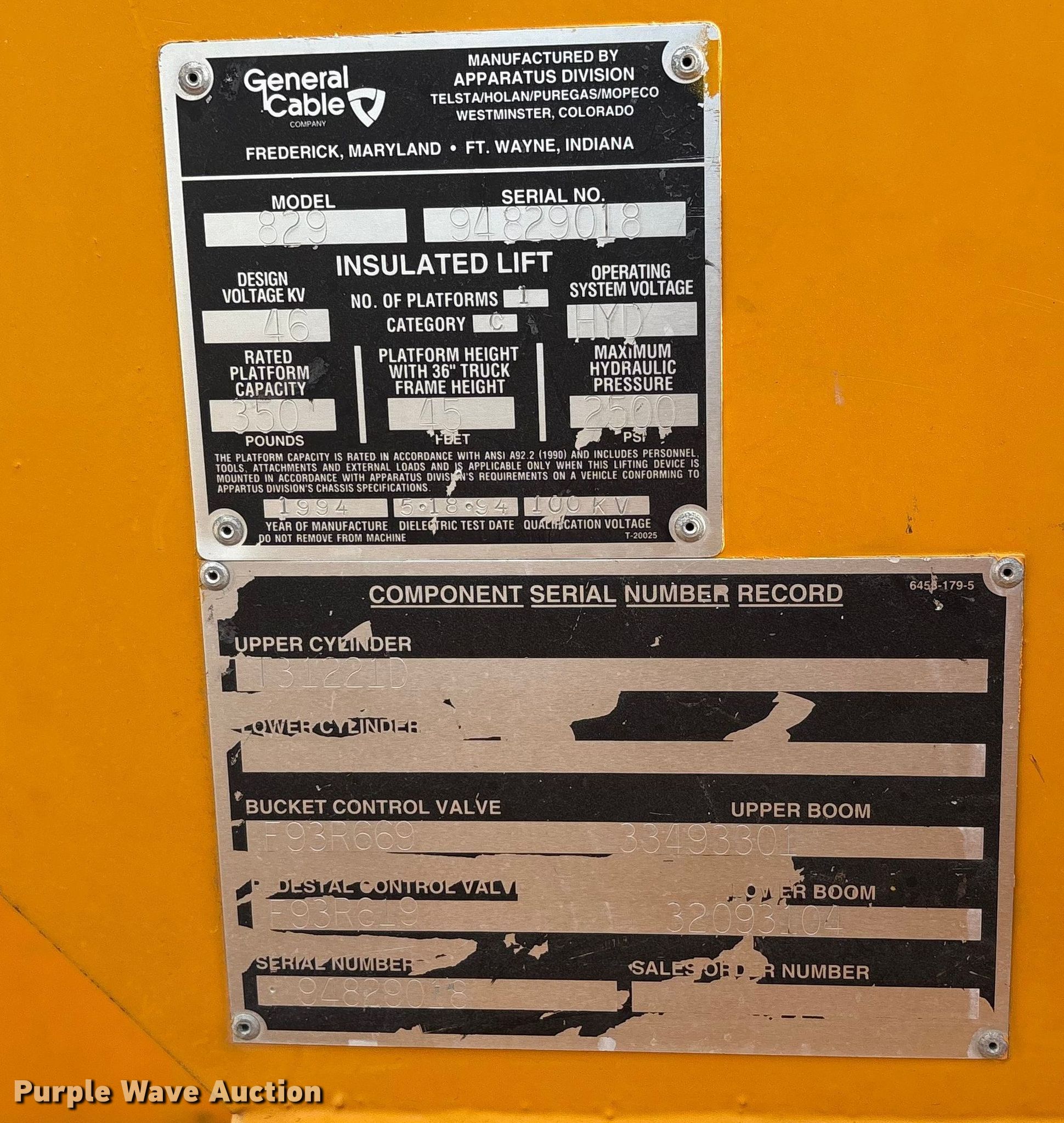 1994 Ford F700 bucket truck. Miles: 33,301 on odometer, Hours: 7,114 on meter, VIN: 1FDXK74C0RVA23926. Engine Cummins, Displacement: 5.9L, Cylinders: 6, Fuel type: Diesel. Transmission Manual, Speed: 6. Chassis Axles: Single, Suspension: Air, Brakes: Air, PTO, GVWR: 33,000 lbs. Interior Heat. Features Bed Utility bed, Stahl, Length: 12', Width: 94", Boom General Cable 829, Maximum lift capacity: 350 lbs, Maximum lift height: 450', Boom type: Articulating, Insulated, Man basket, Boom controls Ground, Platform/ basket.. Tires Size: 11R22.5. Notes Jump start required during on-site data collection, Boom cylinder leak, Hood damage, hole. Ohio title. Seller is a government entity who will be assigning and distributing the title. Please contact the seller for distribution questions. City of Avon Lake. Avon Lake, OH 44012