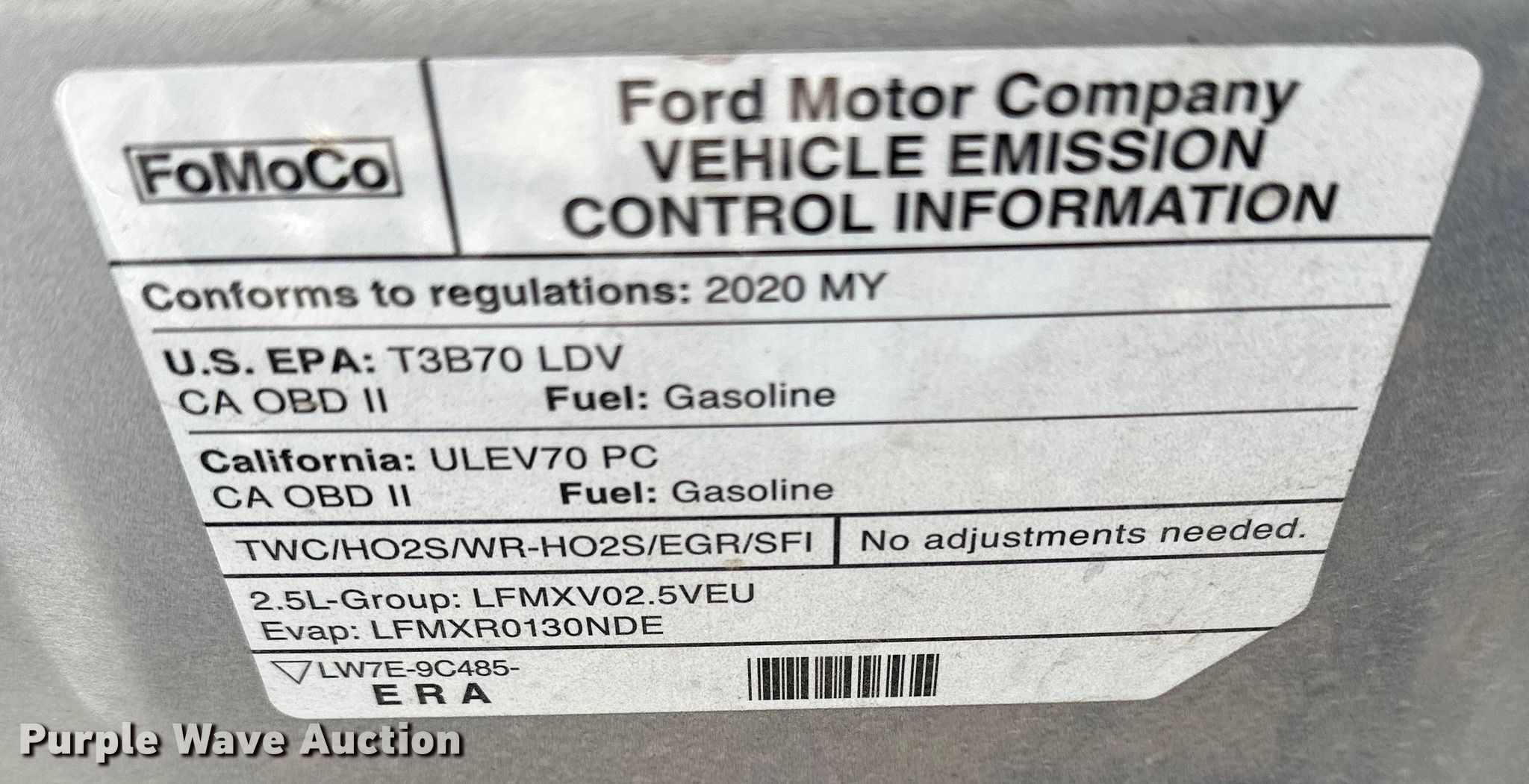 2020 Ford Fusion. Miles: 143,658 on odometer, VIN: 3FA6P0G71LR240421, Unit #: 24765. Engine Displacement: 2.5L, Cylinders: 4, Fuel type: Gas. Transmission Automatic. Interior AC, Heat, Power windows, Power locks, Cruise control, Backup camera. Tires Size: 215/60R16. Notes Additional tire included, Windshield chipped or cracked, Hail damage, Jump start required during on-site data collection. Kansas title. Title distribution may be delayed up to 14 days from verification of funds. Kansas Dept of Agriculture. Manhattan, KS 66502