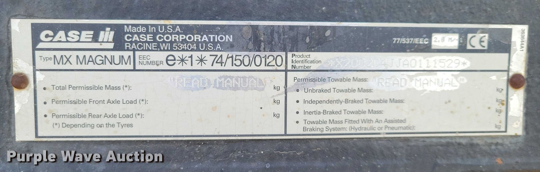 Purple Wave is selling a used Tractor in Iowa. This item is a 2001 Case IH MX200 tractor with the following: Hours: 3,647 on meter, Serial: X2002C4JJA0111529