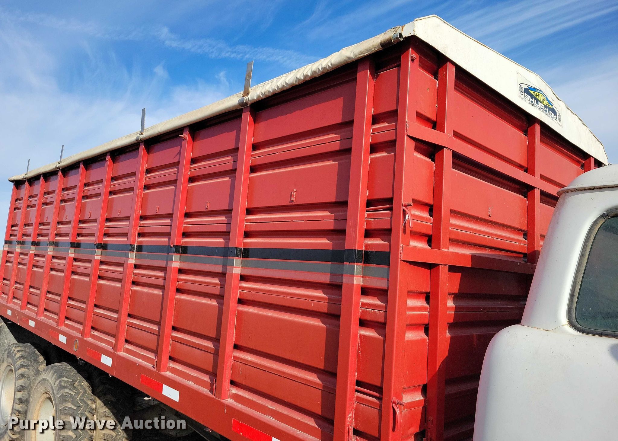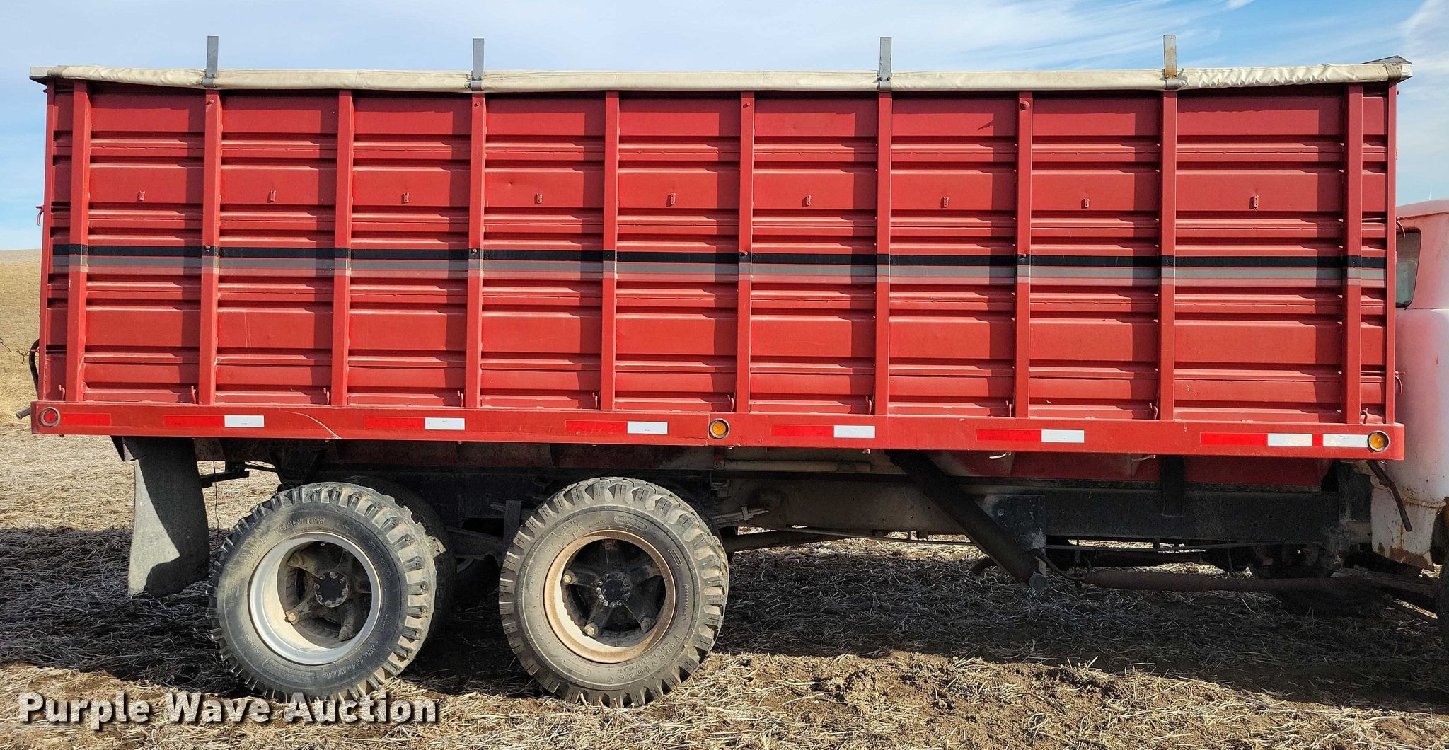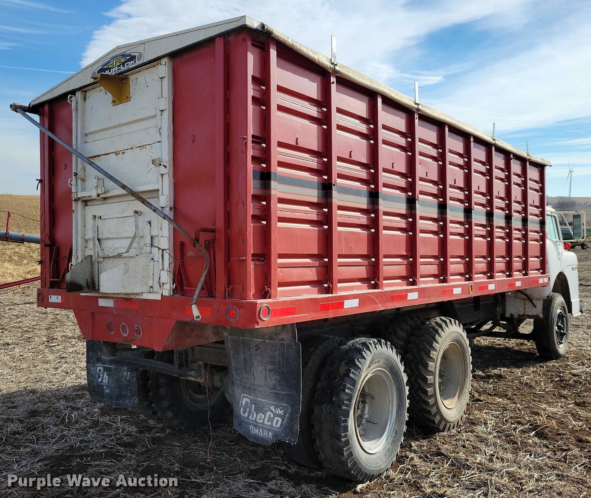 1975 Ford 750 grain truck. Miles: 3,072 on odometer, VIN: C70EVV54681. Engine Cylinders: 8, Fuel type: Gas. Transmission Manual, Speed: 5, plus 2. Chassis Axles: Tandem, Suspension: Spring, Brakes: Hydraulic, PTO, GVWR: 25,500 lbs, Wheelbase: 135". Interior Heat. Features Bed Dump bed, Obeco, Length: 20', Width: 94", Bed type: Steel, Roll tarp, Ram: Dual. Tires Size: 9-20. Notes CB will be removed prior to auction date, Seed auger mount not included, Non-operational unit, Unit must be towed or hauled. Iowa title. Title distribution may be delayed up to 14 days from verification of funds. Behnken Farms. Massena, IA 50853