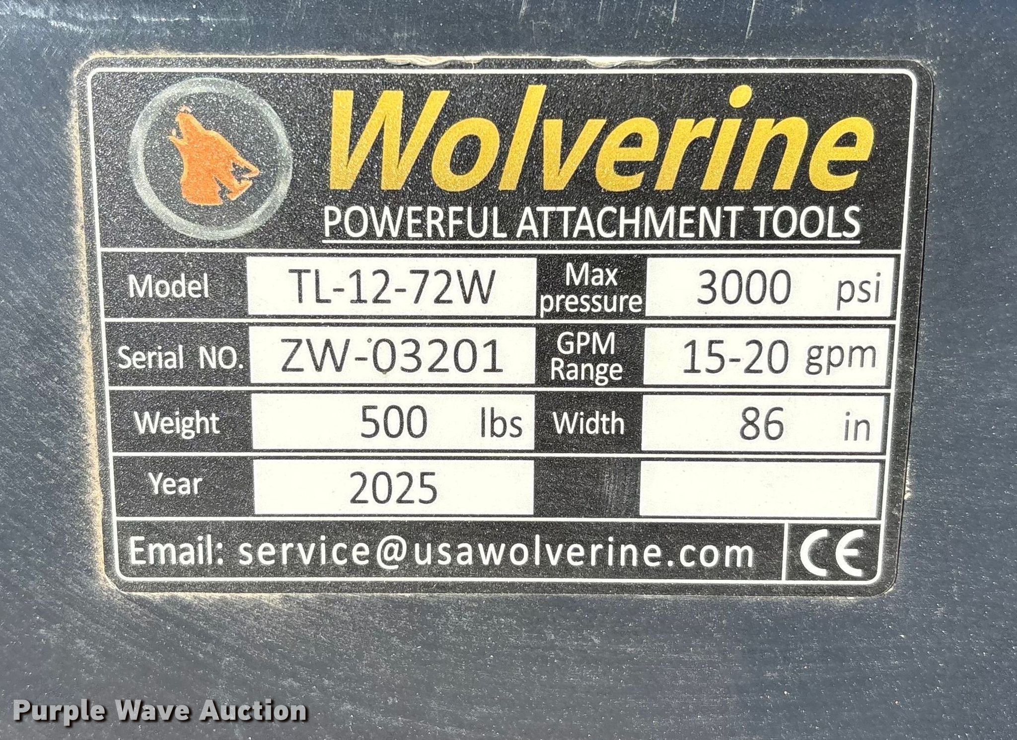 Take a look at this used Wolverine TL-12-72W skid steer tiller being sold on February 4th, 2026 in the Wednesday February 04 Ag Equipment Auction made by Wolverine. Take a look at all of the item information below or take a look at similar auctions for Skid Steer Loaders.