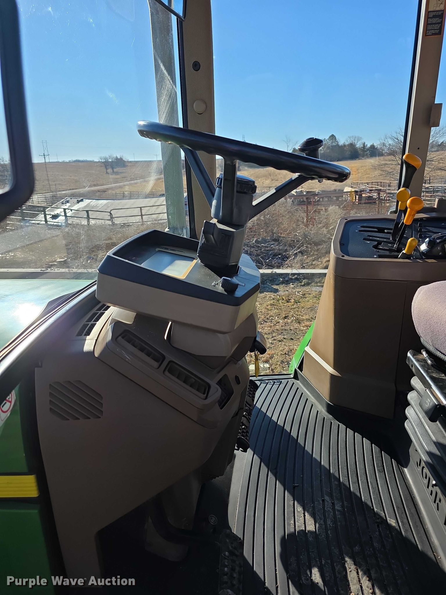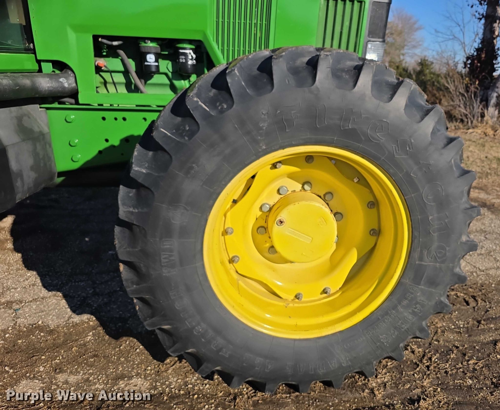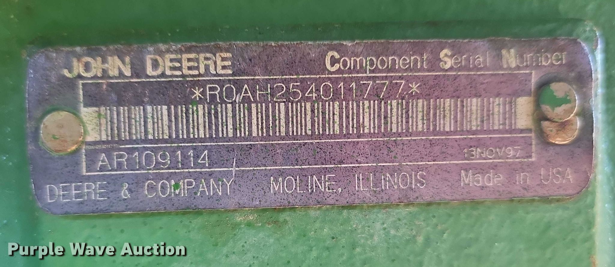 1998 John deere 7410 MFWD tractor. Hours: 196 on meter, Actual hours unknown, Serial: RW7419H010428. Engine John deere, Displacement: 6.8, Cylinders: 6, Fuel type: Diesel, HP: 120, kW: 89.5. Transmission Powershift, 16F - 16R, Differential lock. Operators station AC, Heat. Features PTO: 1000, Three point, Seven pin outlet, Hydraulic remote sets Rear: 3, Suitcase weights: 1. Tires Front: 14.9R28, Rear: 460/85R38, Wheelbase: 102". Notes Hour meter rolled over, Unknown operating condition of three point hitch, Three point hitch, seals may need replaced. Riley, KS 66531