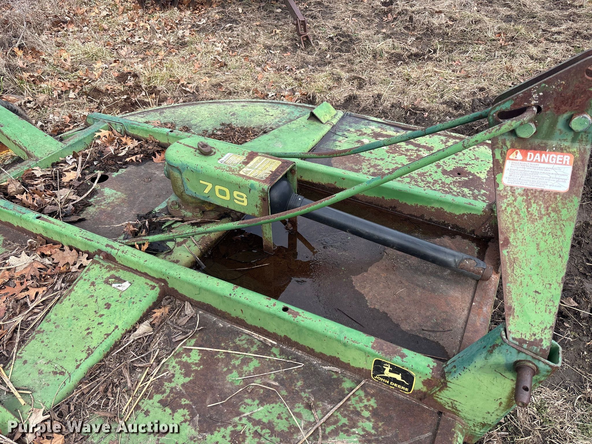 John Deere 709 rotary mower. Features. Width: 7', PTO: 540, Hitch: Three point. Notes PTO half shaft missing. Carl Privitera II. Topeka, KS 66615