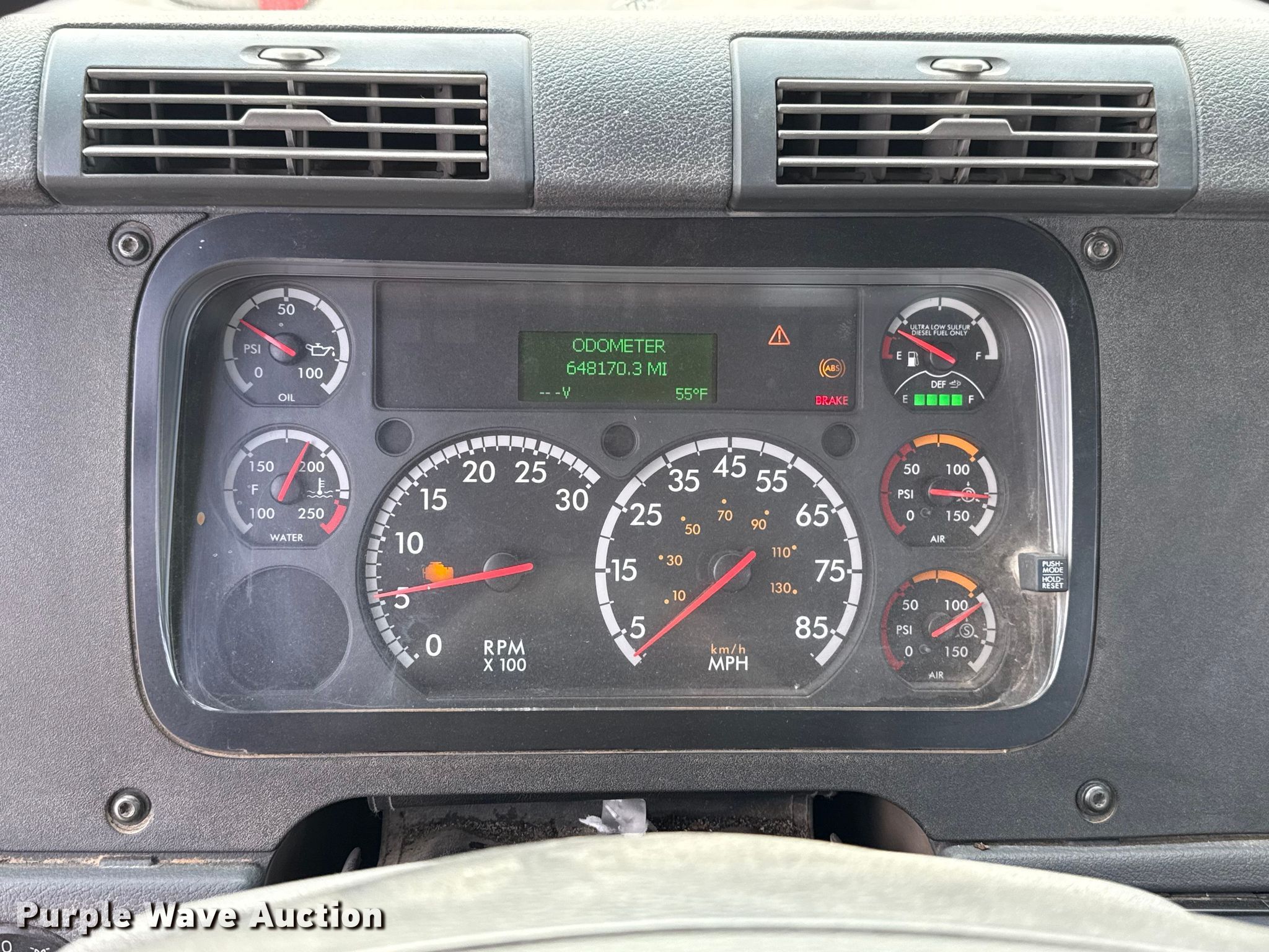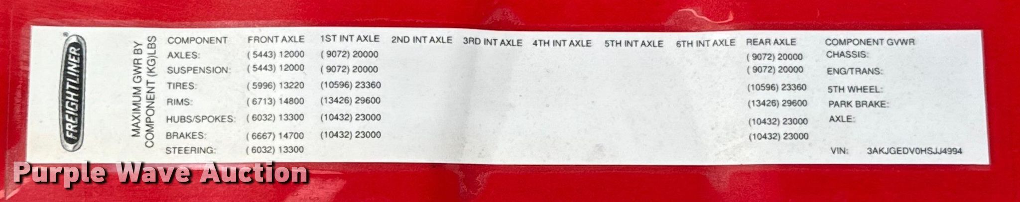 2017 Freightliner Cascadia semi truck. Miles: 648,170 on odometer, Engine hours: 17,021 on meter, VIN: 3AKJGEDV0HSJJ4994, Unit #: 403276. Engine Detroit Diesel, Displacement: 12.8L, Cylinders: 6, Fuel type: Diesel, Engine brake. Transmission Eaton Fuller, Manual, Speed: 10. Chassis Axles: Tandem, Differential lock: Inter-axle, Suspension: Air Dump valves, Brakes: Air, PTO, Wet kit, GVWR: 52,000 lbs FAWR: 12,000 lbs, IAWR: 20,000 lbs, RAWR: 20,000 lbs. Interior AC, Heat, Heated mirrors, Power windows, Cruise control, Air ride cab. Features Deck plate: Aluminum, Fifth wheel type: Fixed, Fuel tank: Single. Tires Size: 11R22.5. Notes Dash warning indicator: Check engine, ABS, Windshield chipped or cracked, Dead battery, Fuel issues, injector leak. Oklahoma title. Title distribution may be delayed up to 30 days from verification of funds. Dolese Bros. Co.. 5600 West Reno Avenue. Oklahoma City, OK 73127