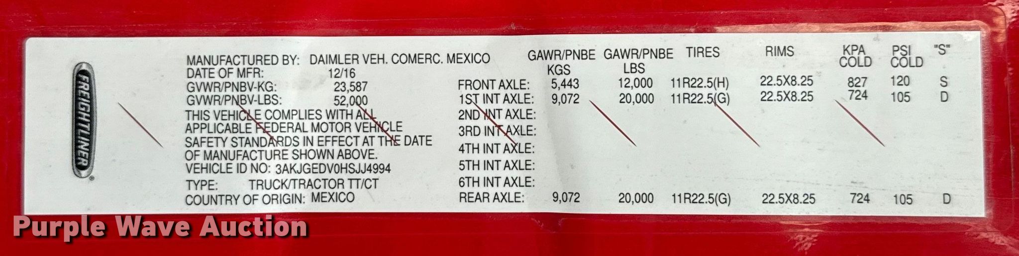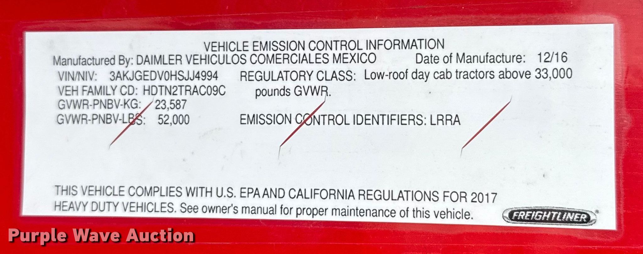 Purple Wave is selling a used Truck Tractor in Oklahoma. This item is a 2017 Freightliner Cascadia semi truck with the following: Miles: 648,170 on odometer, Engine hours: 17,021 on meter, VIN: 3AKJGEDV0HSJJ4994, Unit #: 403276
