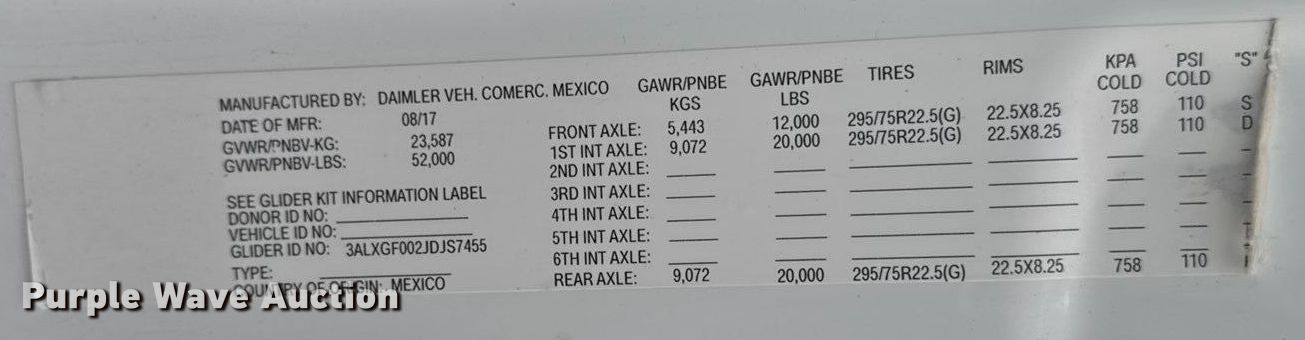 2018 Freightliner Cascadia semi truck. Miles: 724,063 on odometer, Miles or hours may vary, unit still in use, VIN: 3ALXGF002JDJS7455. Engine Detroit Diesel Series 60, Cylinders: 6, Fuel type: Diesel, Engine brake. Transmission Eaton Fuller, Manual, Speed: 13. Chassis Axles: Tandem, Differential lock: Inter-axle, Suspension: Air Dump valves, Truck chassis: 147", GVWR: 52,000 lbs FAWR: 12,000 lbs, IAWR: 20,000 lbs, RAWR: 20,000 lbs. Interior AC, Heat, Heated mirrors, Power windows, Power locks, Cruise control, Air ride cab, Sleeper Sleeper length: 56", Refrigerator, Rear climate control. Features Deck plate: Aluminum, Fifth wheel type: Air operated, Sliding, Fuel tank: Dual. Tires Front: 295/75R22.4, Rear: 275/80R22.5. Minnesota reconstructed title. Title distribution may be delayed up to 14 days from verification of funds. Rosen's Inc. Fairmont, MN 56031