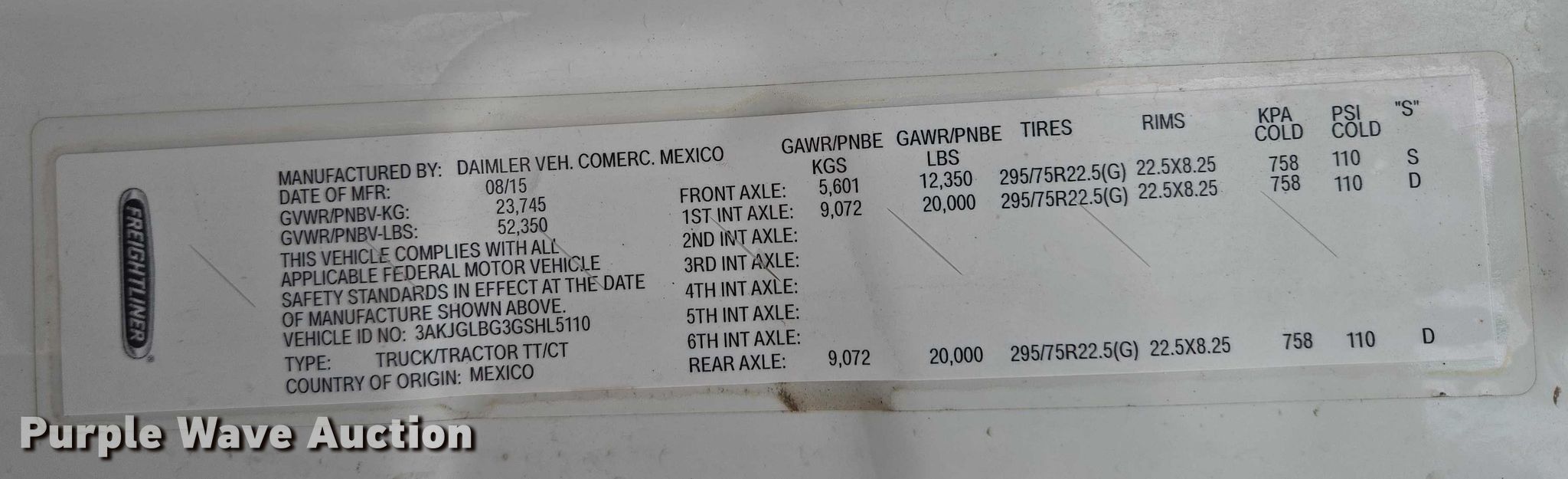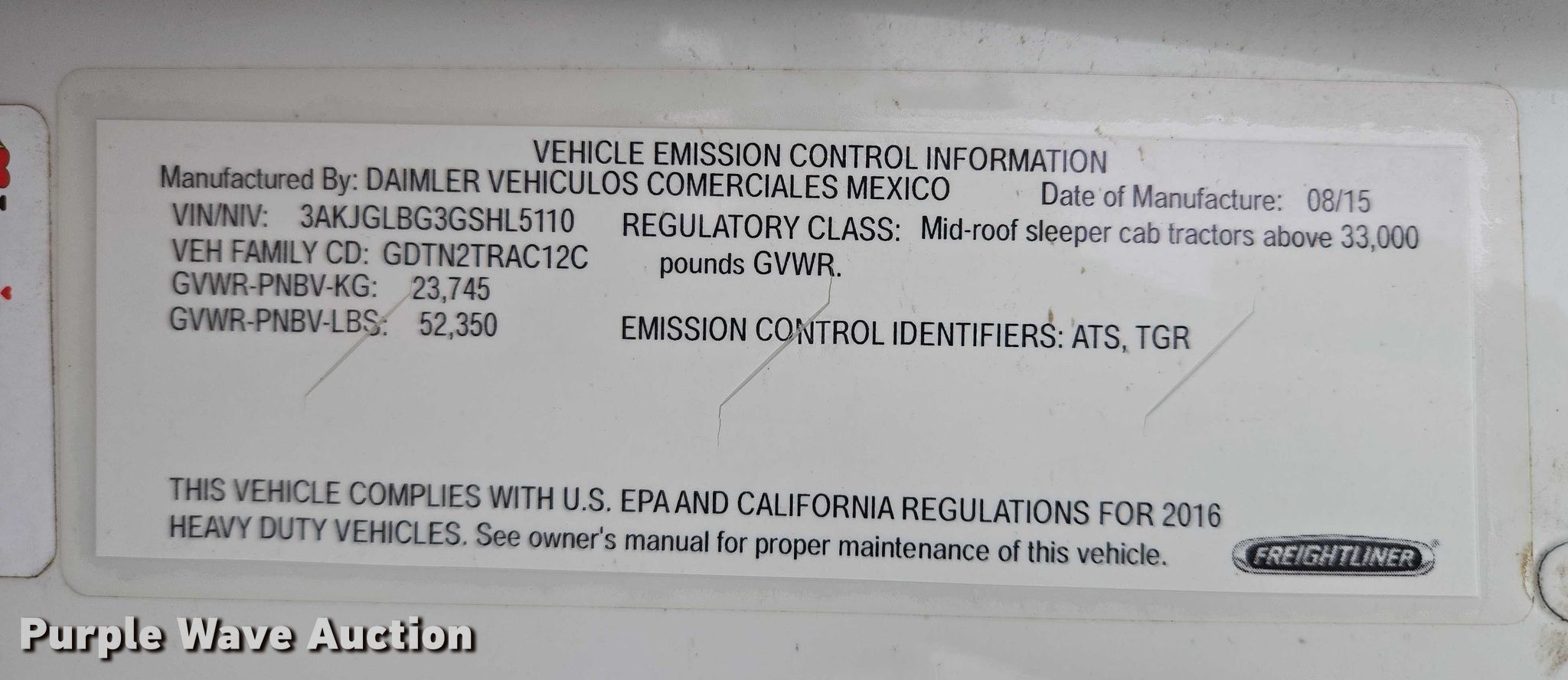 - VIN: 3AKJGLBG3GSHL5110