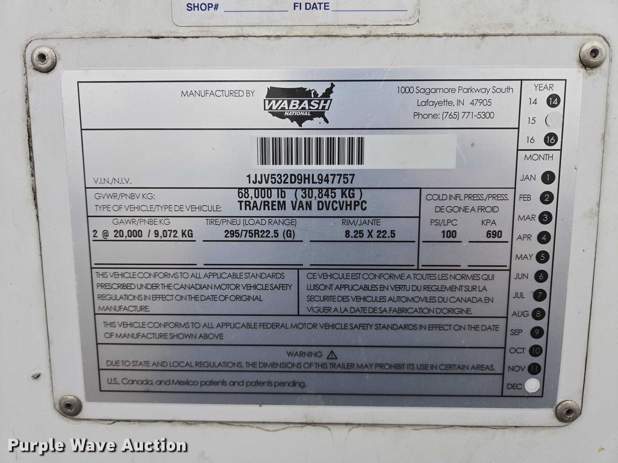 Purple Wave is selling a used Dry Van Trailer in Minnesota. This item is a 2017 Wabash Vans Dry Van Duraplate dry van trailer with the following: VIN: 1JJV532D9HL947757, Unit #: 177