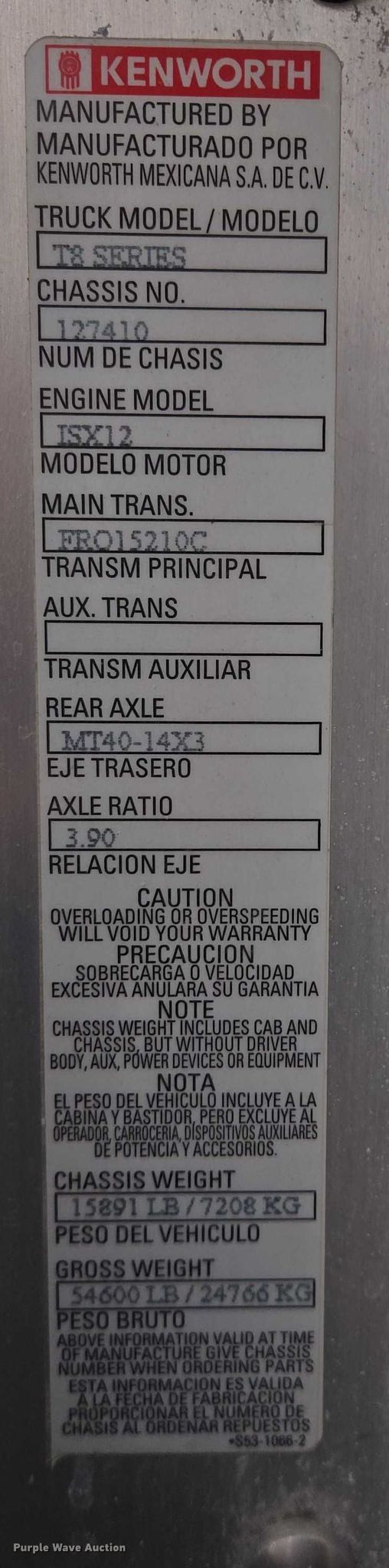 2016 Kenworth T800 box truck. Miles: 533,220 on odometer, Hours: 2,322 on meter, VIN: 3BKDL79X1GF127410, Unit #: 293. Engine Cummins ISX12, Displacement: 11.9L, Cylinders: 6, Fuel type: Diesel. Transmission Eaton Fuller, Manual, Speed: 10. Chassis Axles: Tandem, Suspension: Air, Brakes: Air. Interior AC, Heat, Heated mirrors, Power locks, Cruise control. Features Bed Box bed, Brown Industries 491725261, Serial: 29261, Length: 26' 8", Width: 102", Height: 8' 7", E-track rail system, Floor: Wood. Tires Front: 315/80R22.5, Rear: 11R22.5. Notes Box bed front damaged, Oil leak, Windshield chipped or cracked. Minnesota title. Title distribution may be delayed up to 30 days from verification of funds. Rosen's Inc. Fairmont, MN 56031