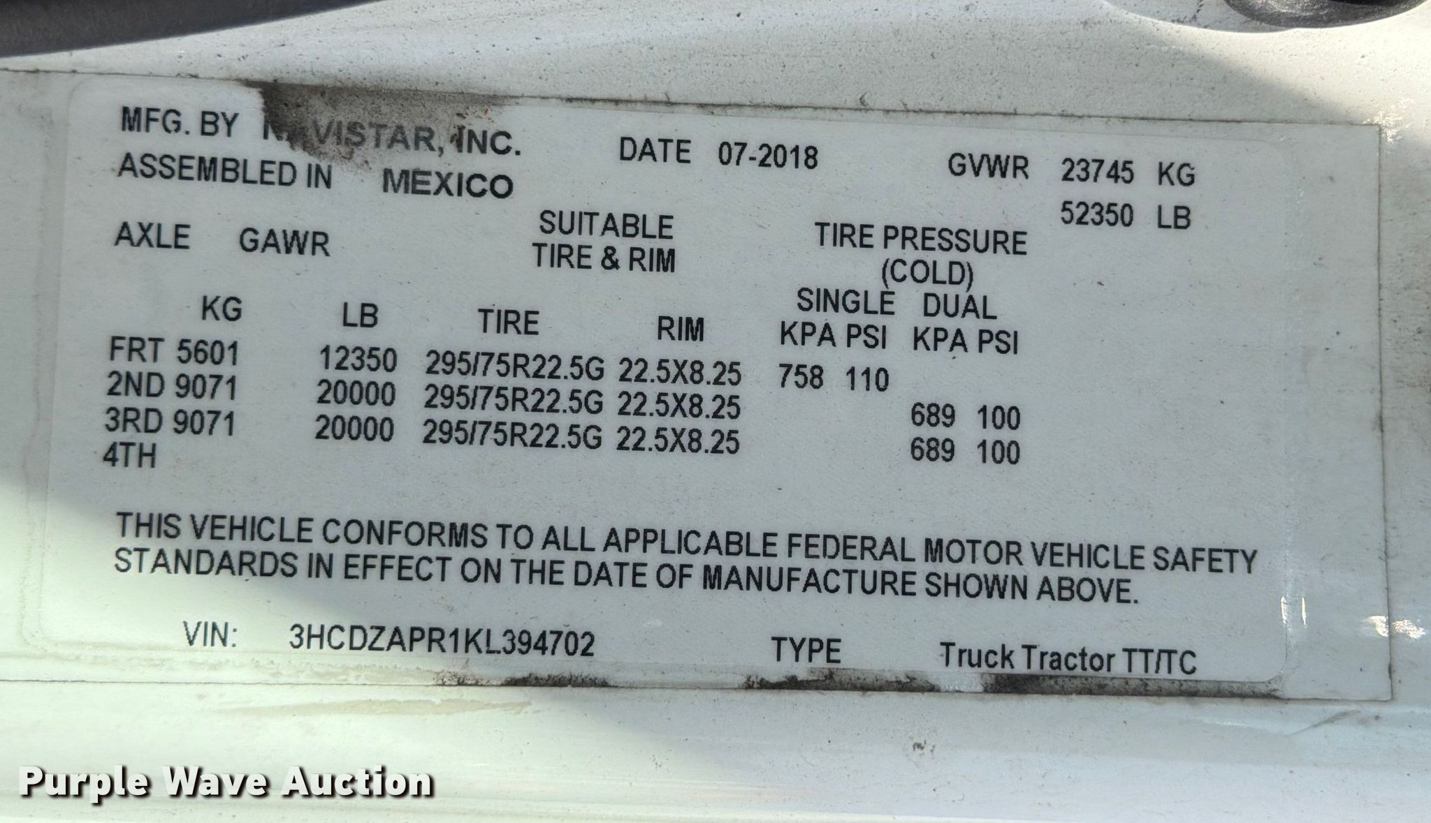 Purple Wave is selling a used Truck Tractor in Texas. This item is a 2019 International LT625 semi truck with the following: Miles: 475,318 on odometer, VIN: 3HCDZAPR1KL394702, Unit #: 219519