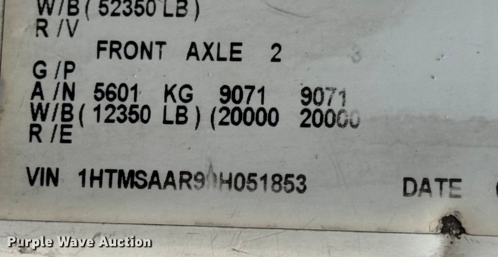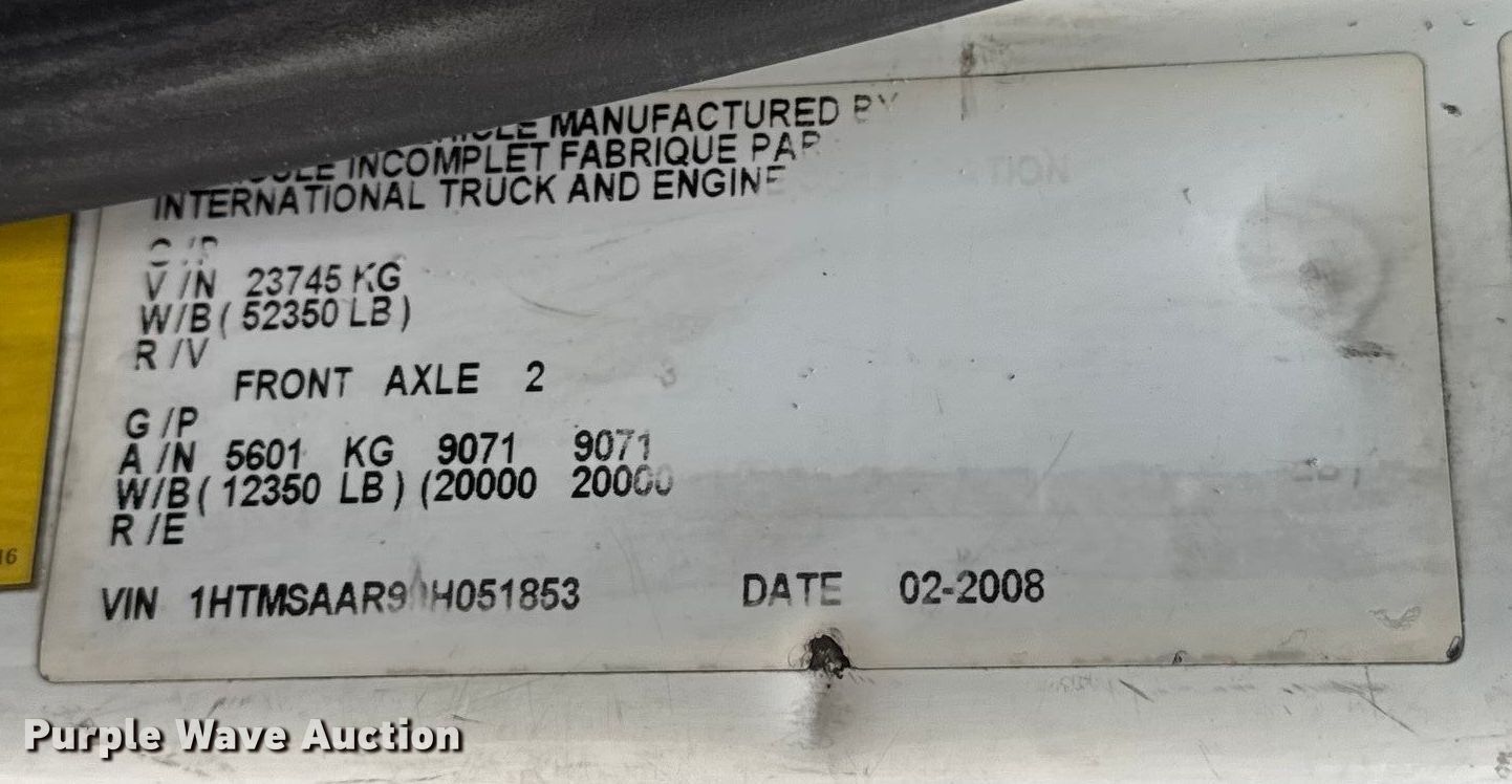 2009 International 4400 truck cab and chassis. Miles: 387,520 on odometer, Hours: 22,076 on meter, VIN: 1HTMSAAR99H051853, Unit #: 2568. Engine International Maxxforce, Displacement: 7.64L, Cylinders: 6, Fuel type: Diesel. Transmission Allison, Automatic. Chassis Suspension: Spring, Brakes: Air, Truck chassis: 23' 1", GVWR: 52,350 lbs FAWR: 12,350 lbs, IAWR: 20,000 lbs, RAWR: 20,000 lbs. Interior AC, Heat, Heated mirrors, Cruise control, Air ride cab. Features Fuel tank: Single. Tires Size: 275/80R22.5. Iowa title. Title distribution may be delayed up to 14 days from verification of funds. Hiland Dairy. New Bloomfield, MO 65063