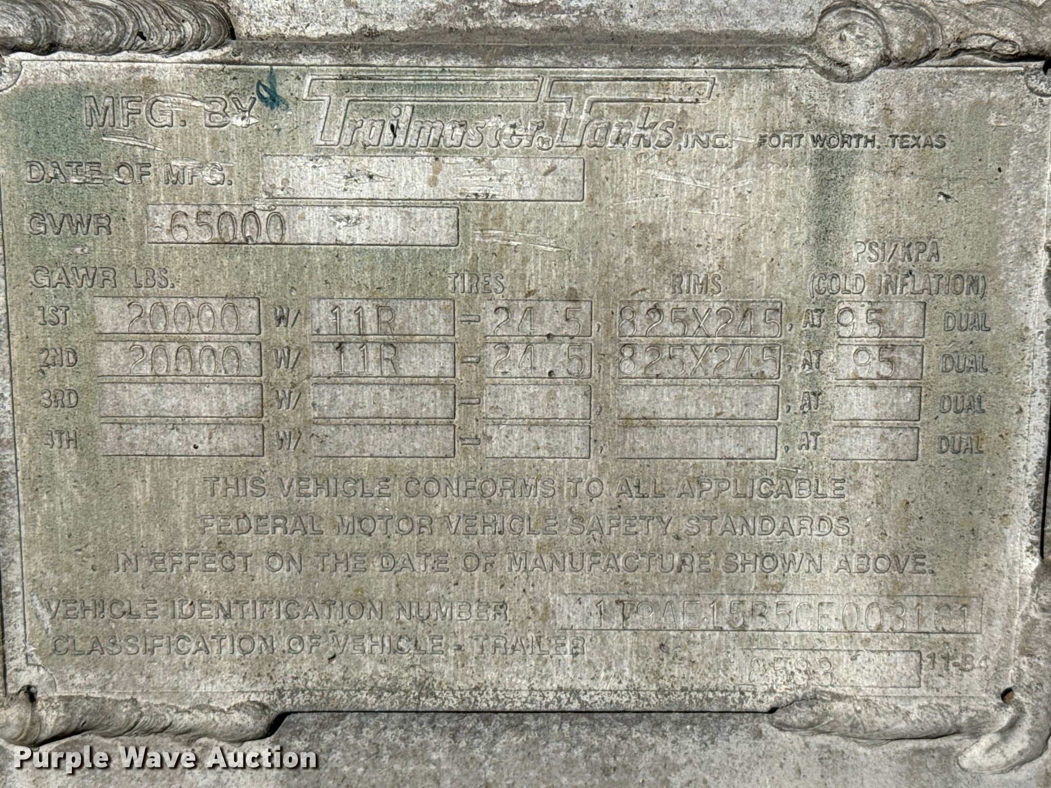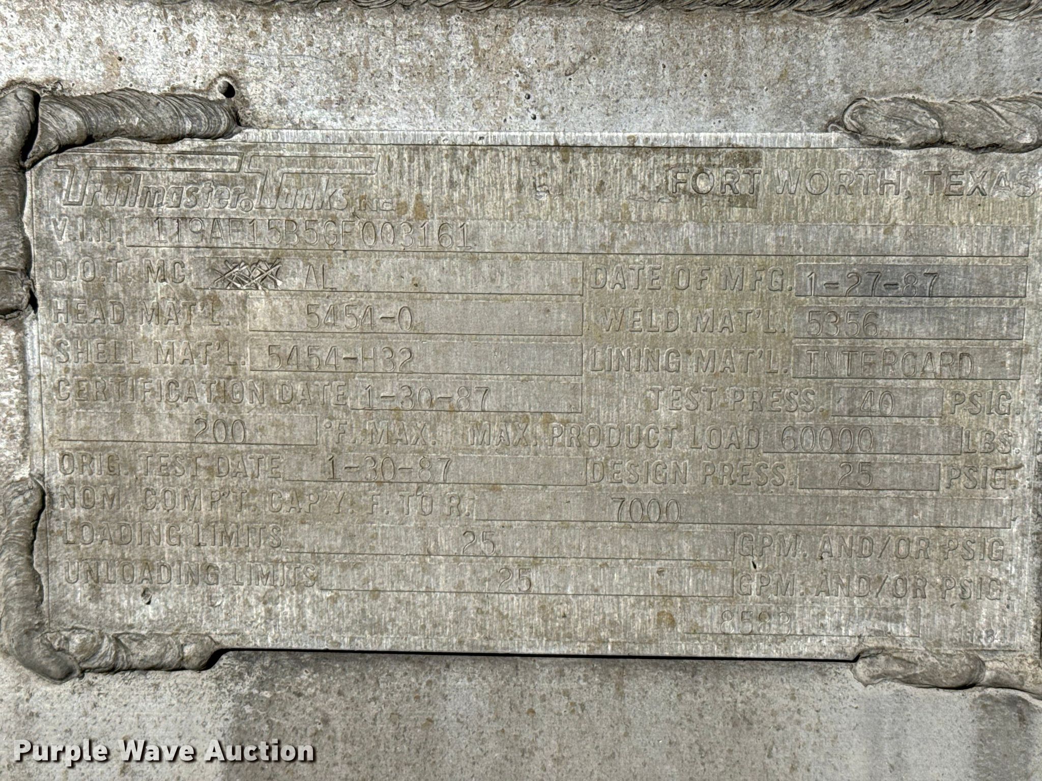 Purple Wave is selling a used Tank Trailer in Oklahoma. This item is a 1987 Trailmaster Tanks, Inc. tank trailer with the following: VIN: 1T9AE15B5GF003161